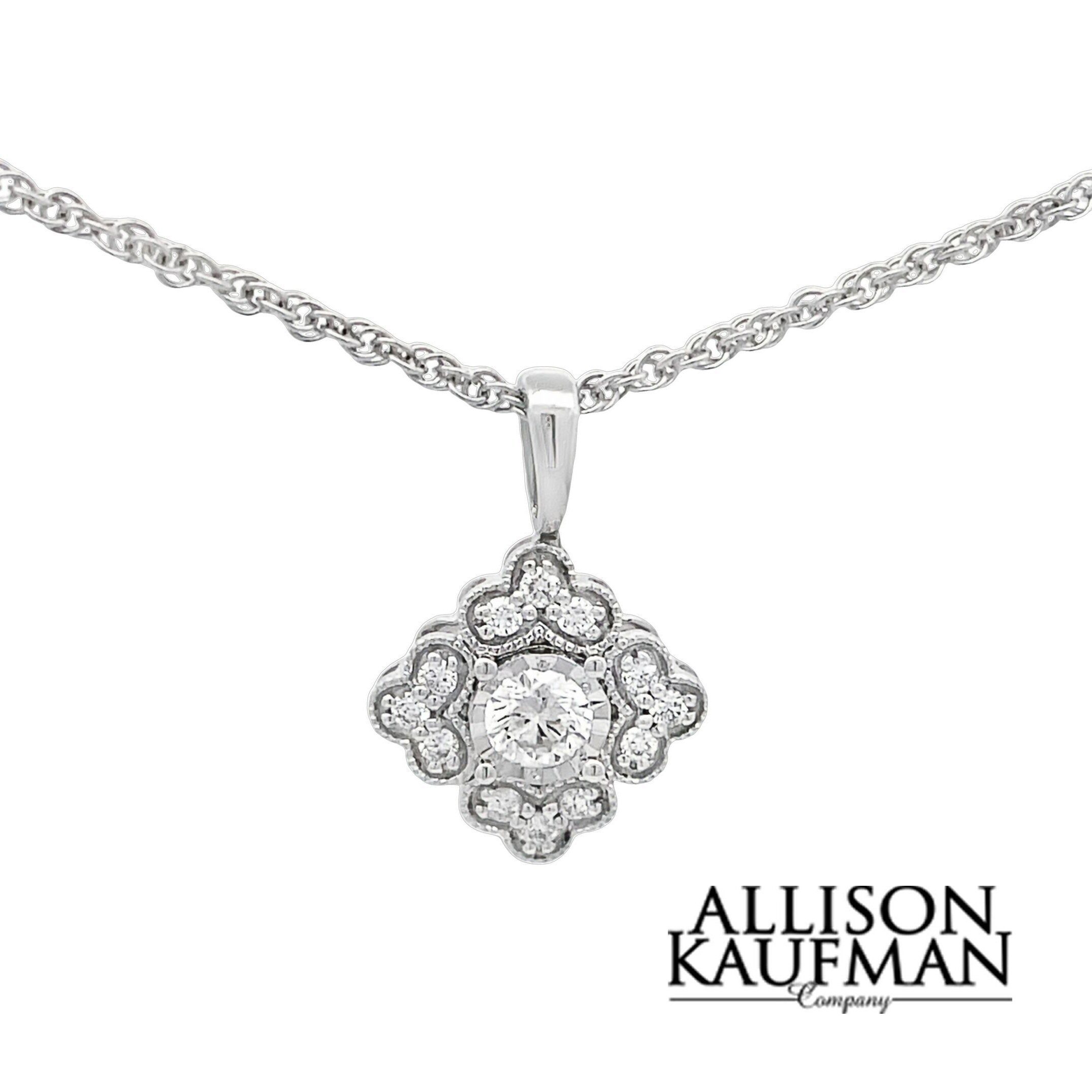 Lovely and elegant 14 karat white gold .25 cttw flower necklace. There is a .15 carat round brilliant cut diamond in the center of the “flower” with .10cttw melee diamonds on the petals.