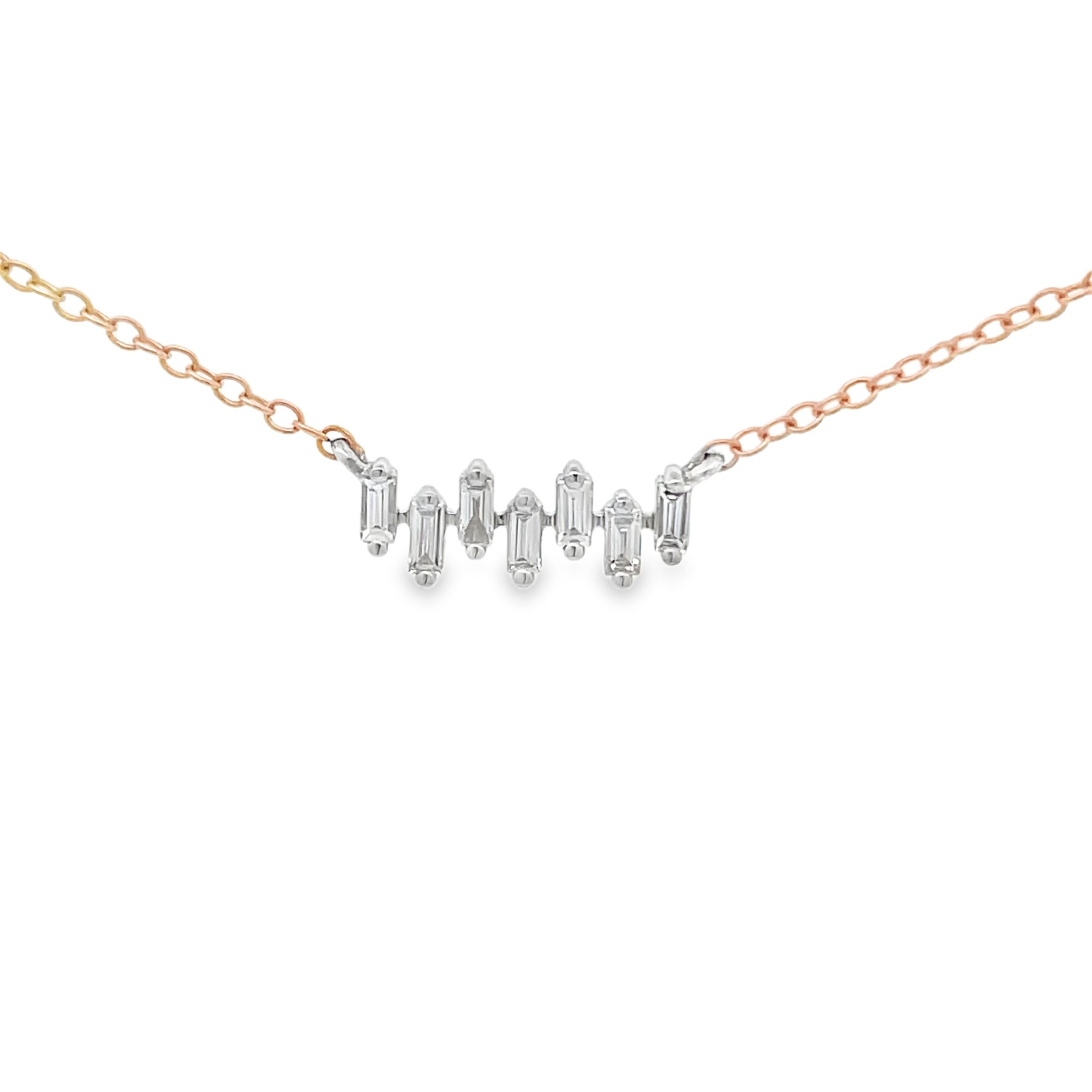 14 karat yellow gold bar necklace with .19 cttw baguette cut diamonds set North-South in a zig-zag fashion in white gold.