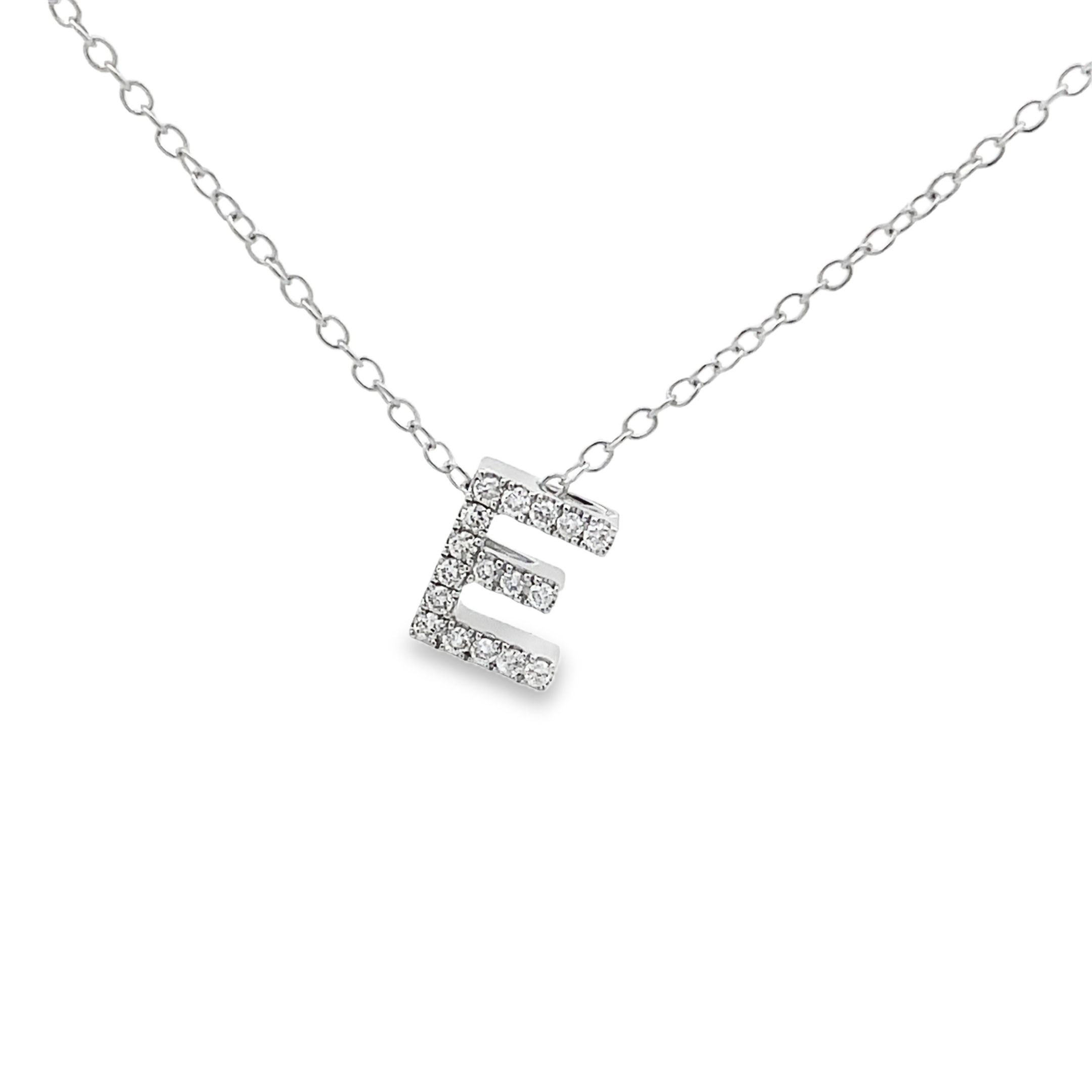 14 karat white gold letter “E” with .09cttw round brilliant cut diamonds on an adjustable chain.