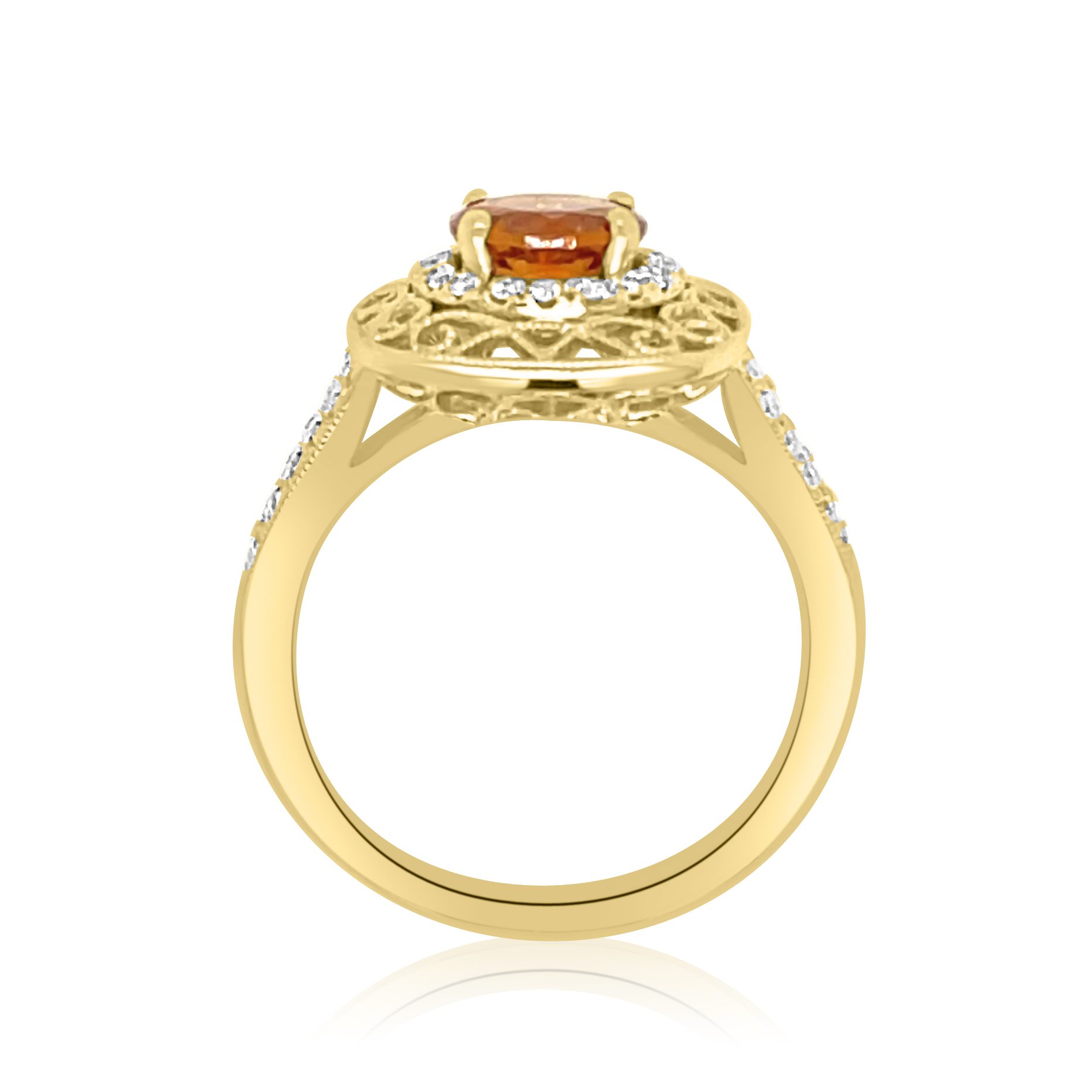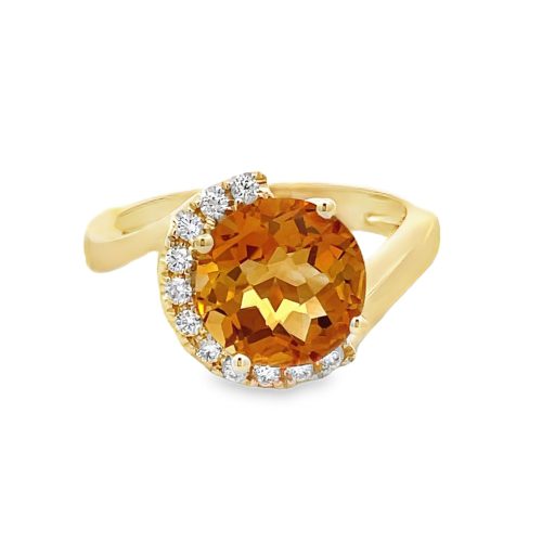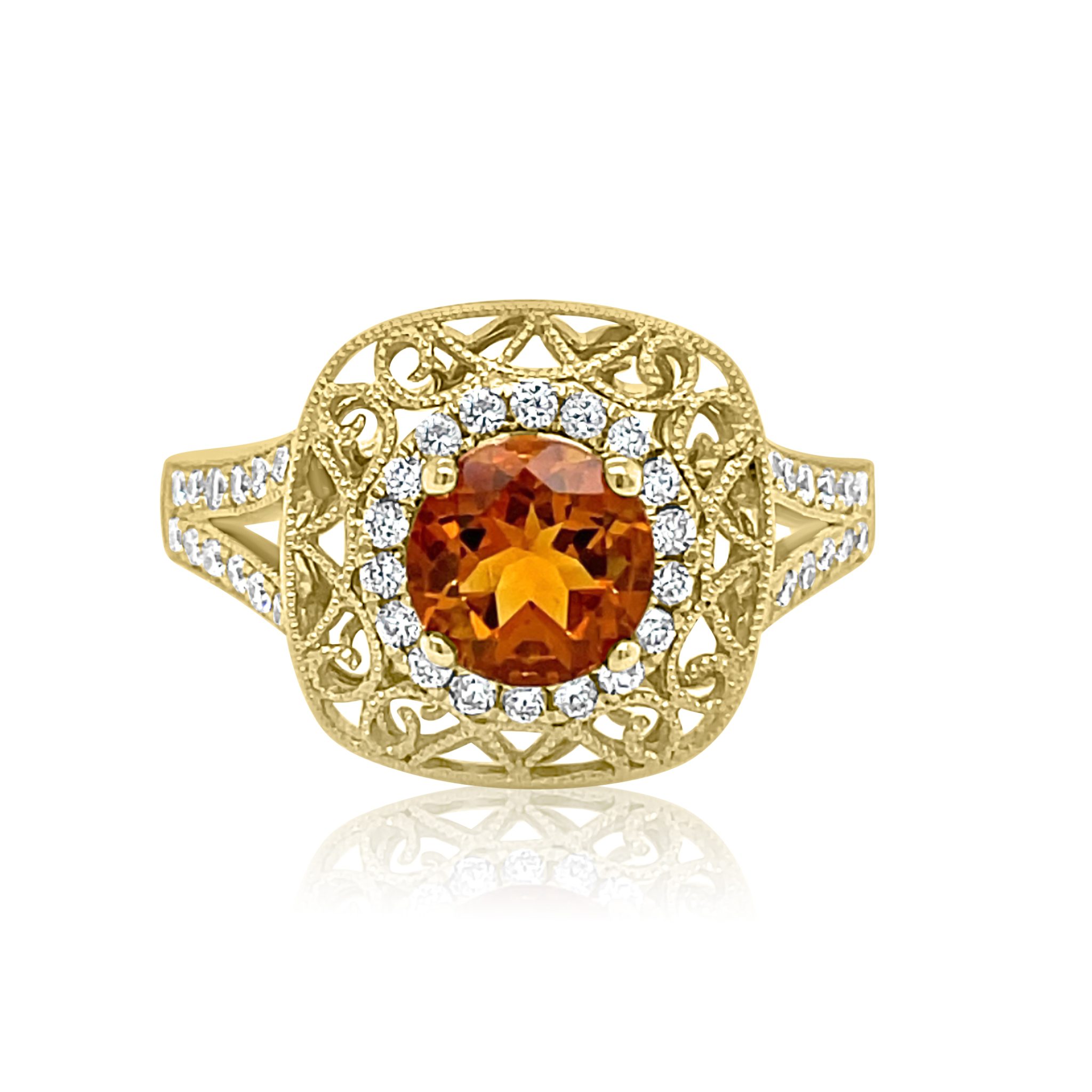 Experience unmatched elegance with this gorgeous 14 karat yellow gold vintage citrine and diamond ring. A vivid 1.0 carat round citrine is embraced by 0.33cttw round brilliant cut diamonds in a halo and along the split shank. A true statement piece for special occasions.