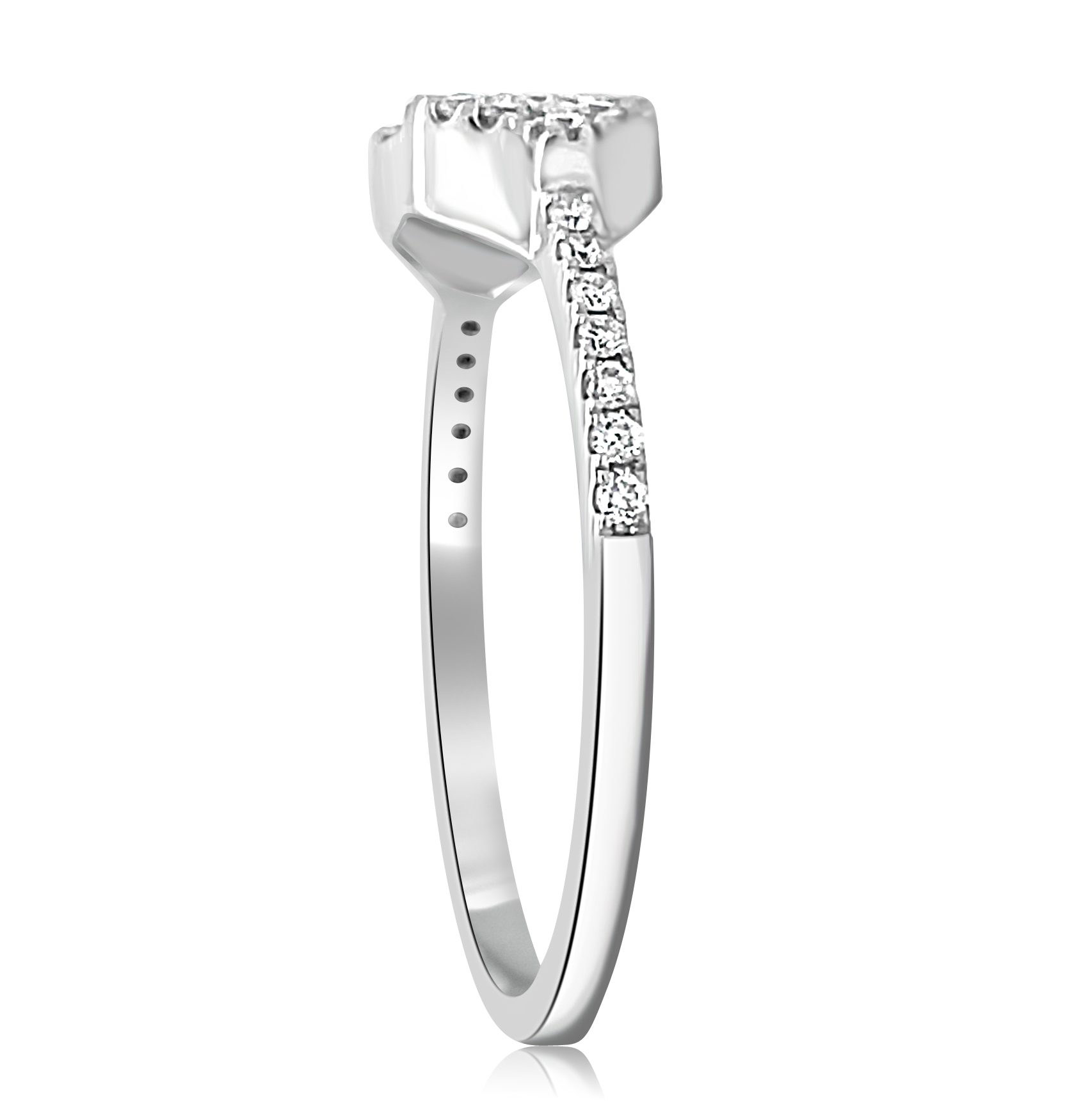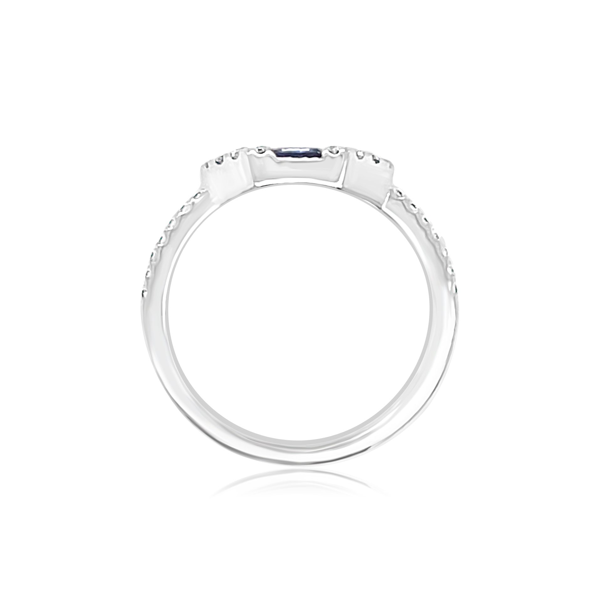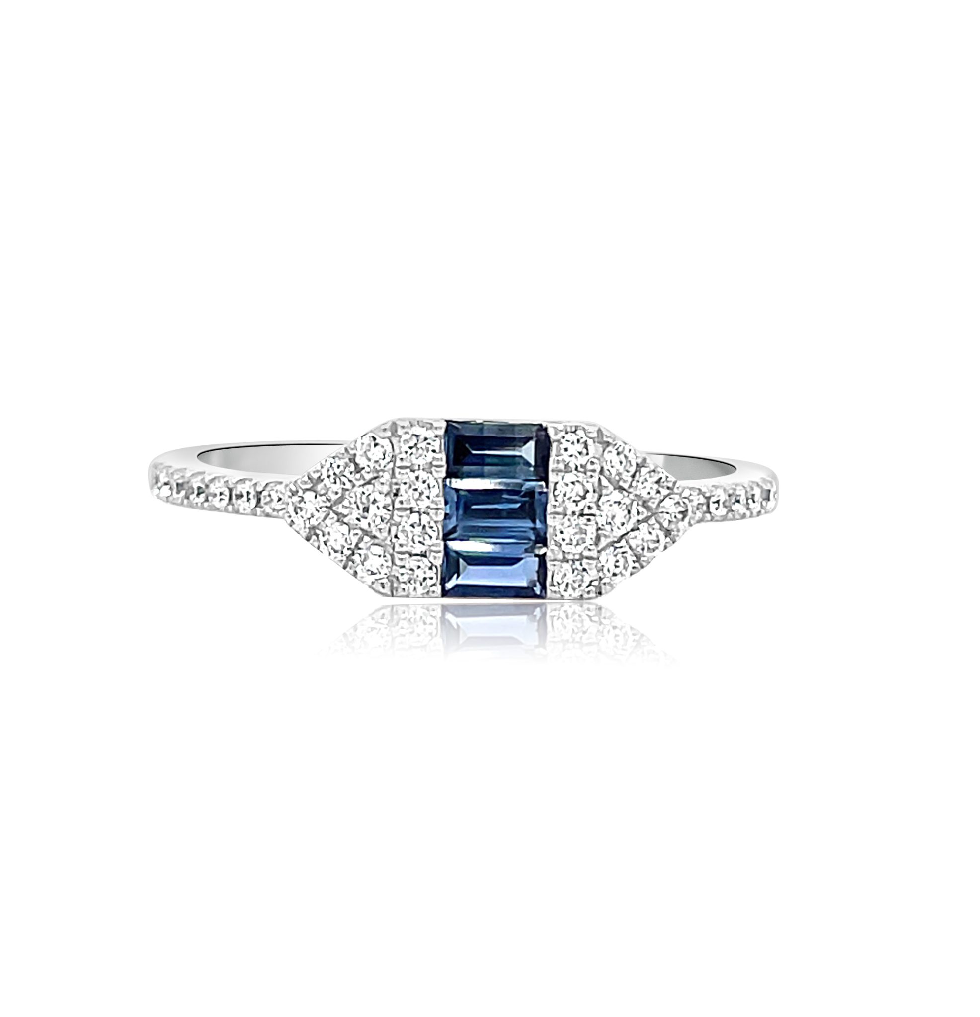 So unique and pretty 14 karat white gold emerald cut sapphire and diamond ring. The centerpiece of the ring is three channel set, emerald cut blue sapphires. On both sides of the 0.29 cttw sapphires, prong set in the configuration of a triangle and down the side of the ring, are 0.20 cttw round brilliant cut diamonds.