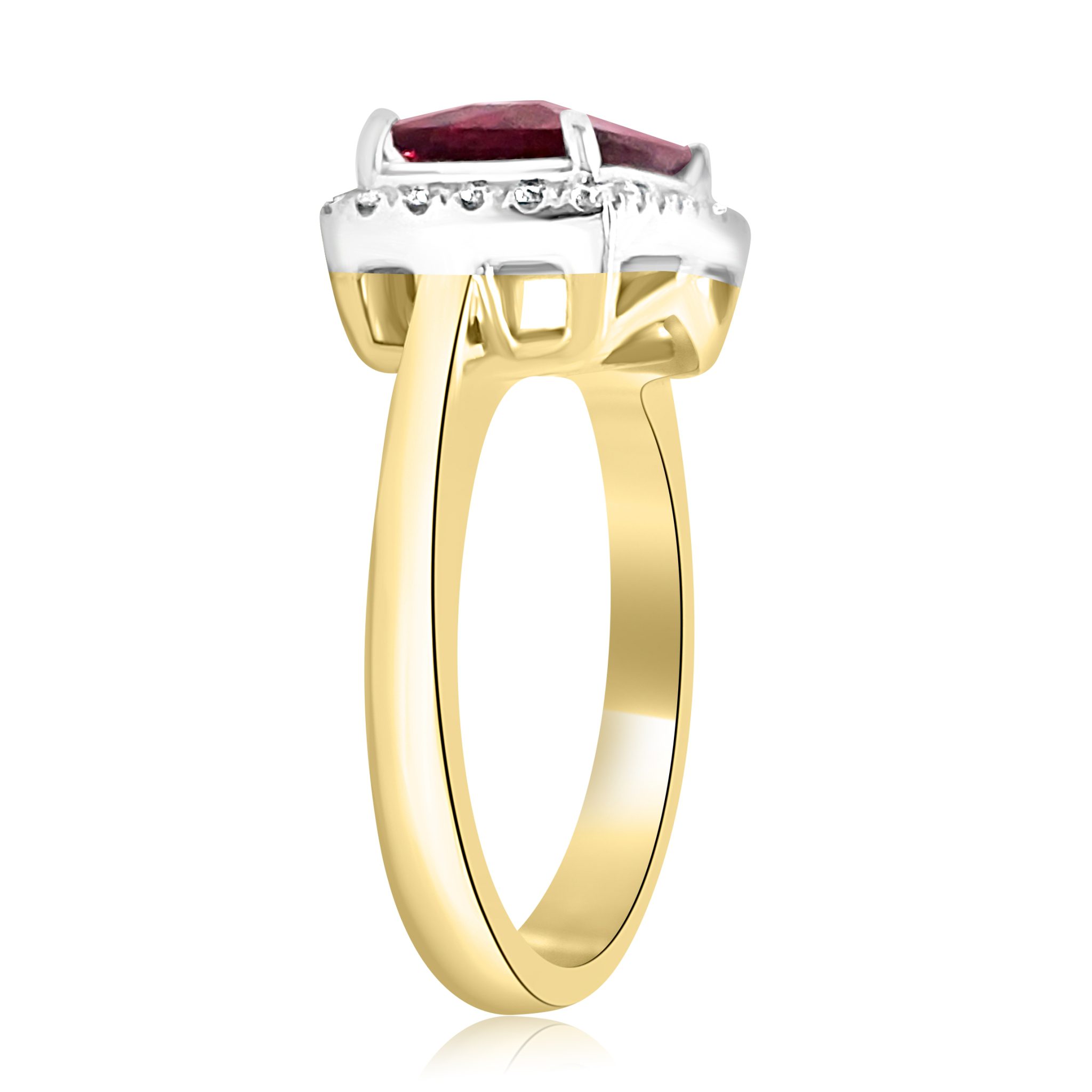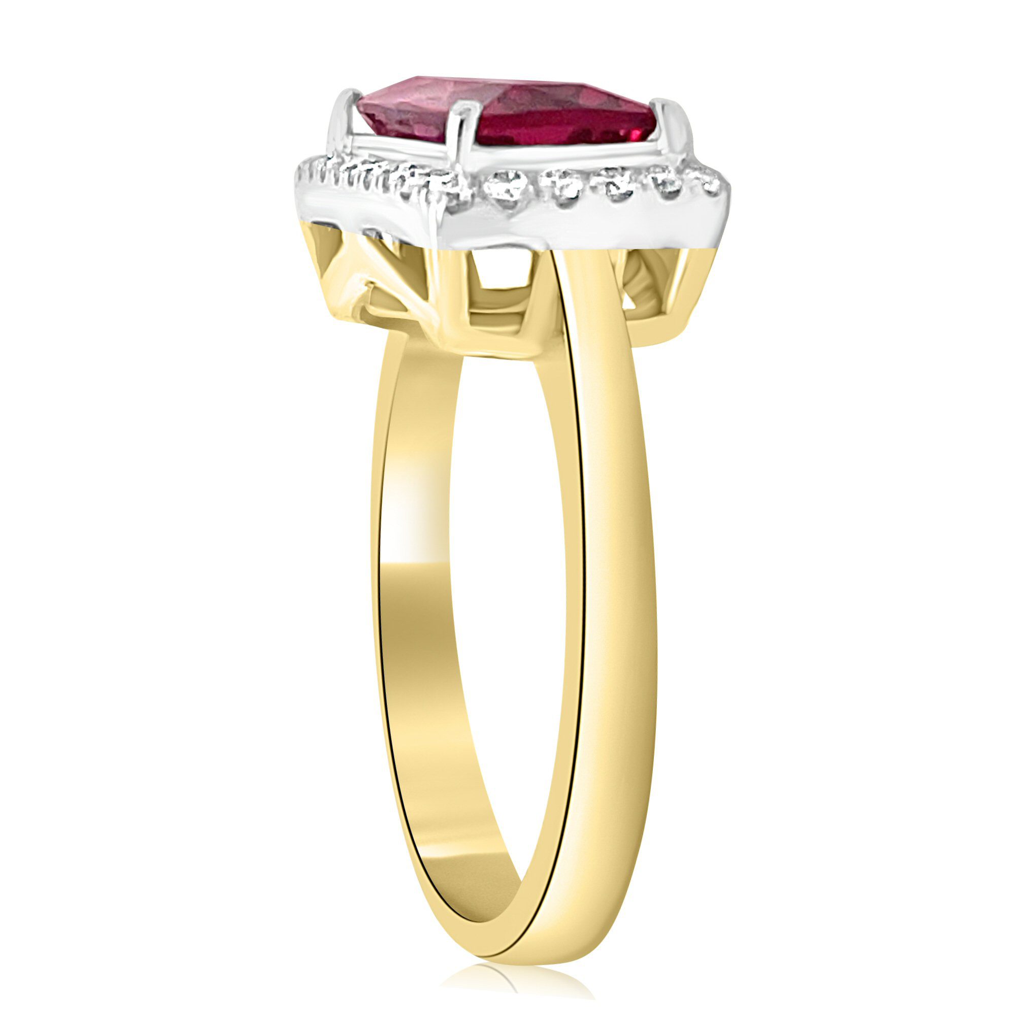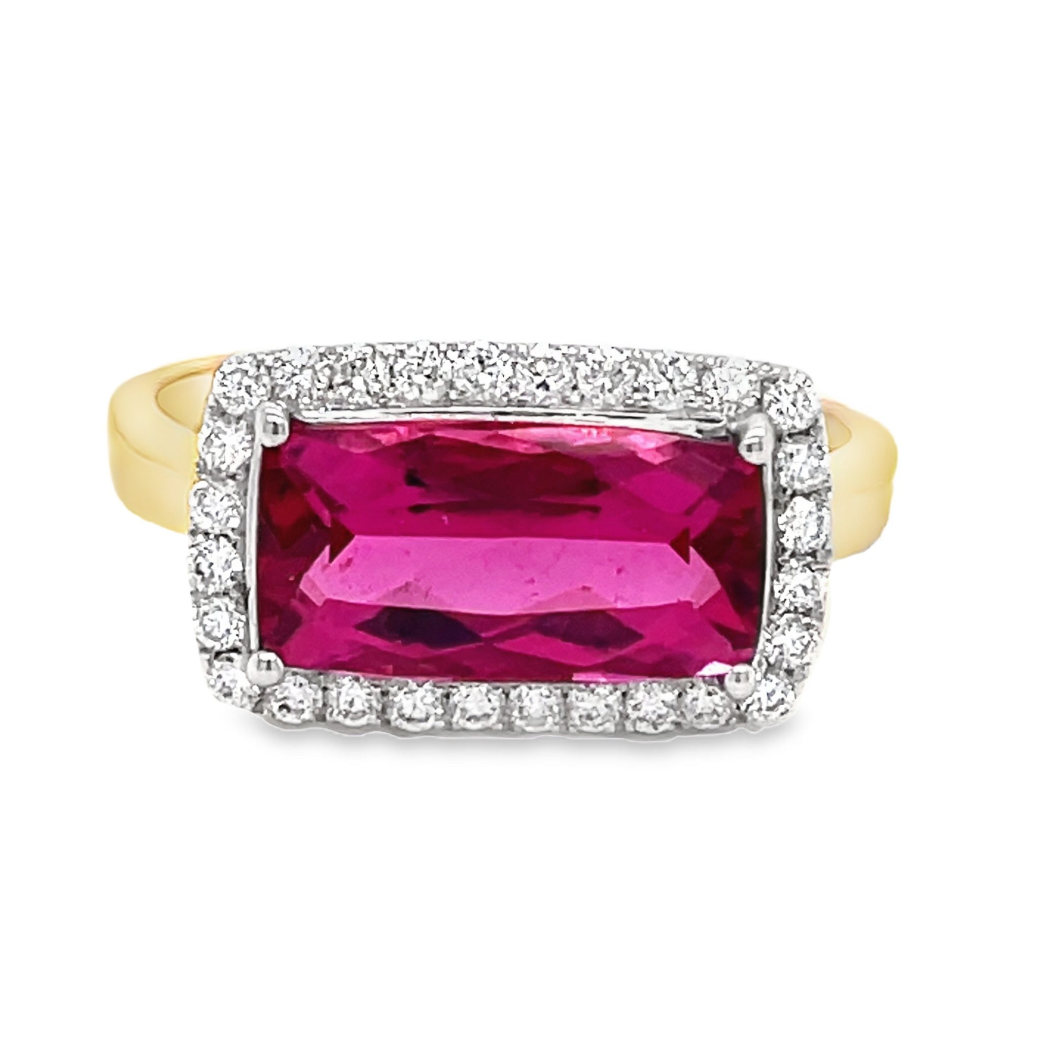 This stunning 14 karat yellow gold ring features a 2.12 carat rectangular rubellite, set east-west and surrounded by a halo of .20 cttw round brilliant cut diamonds. The rich red hue of the pink tourmaline is beautifully complemented by the sparkling brilliance of the surrounding diamonds, all set on a polished gold band.