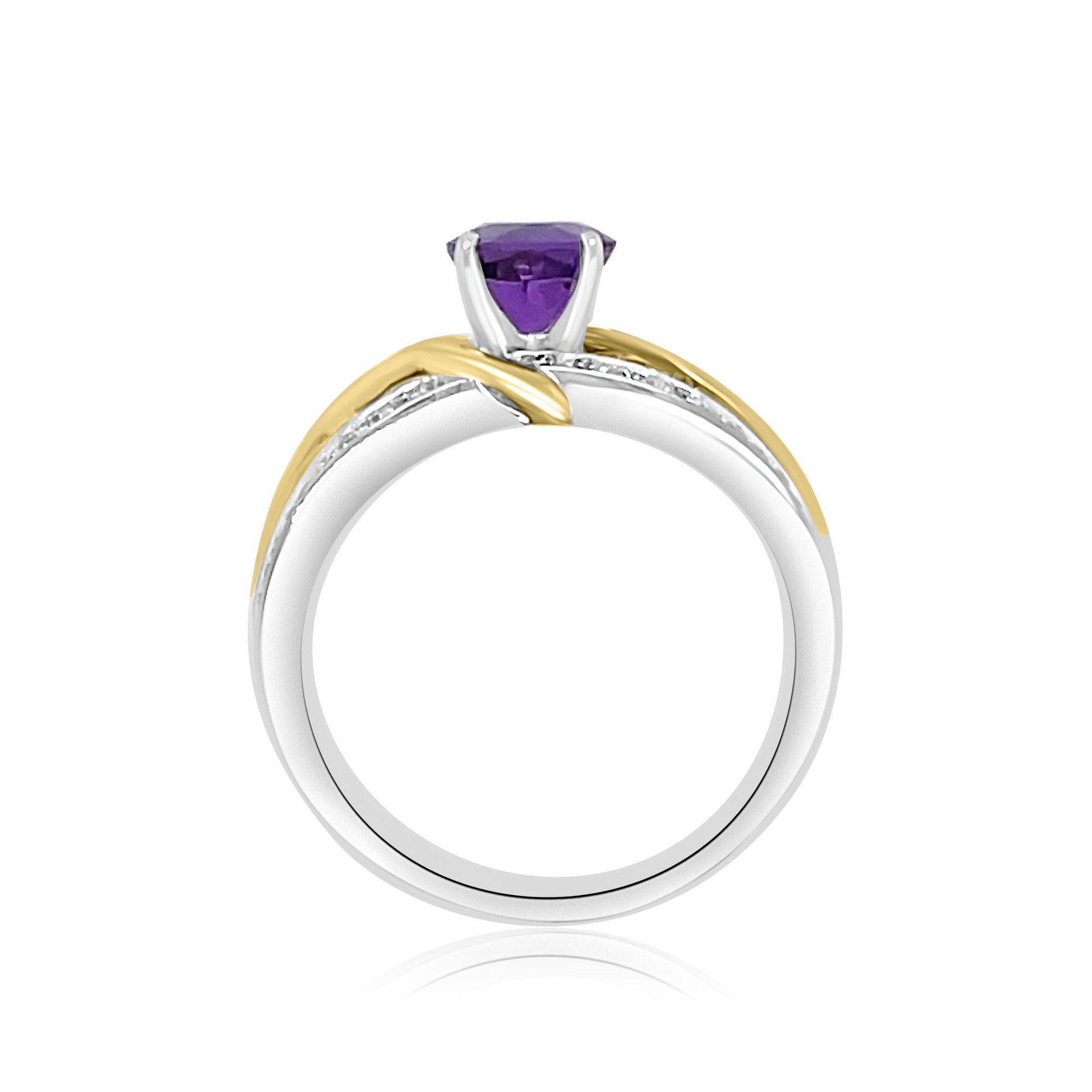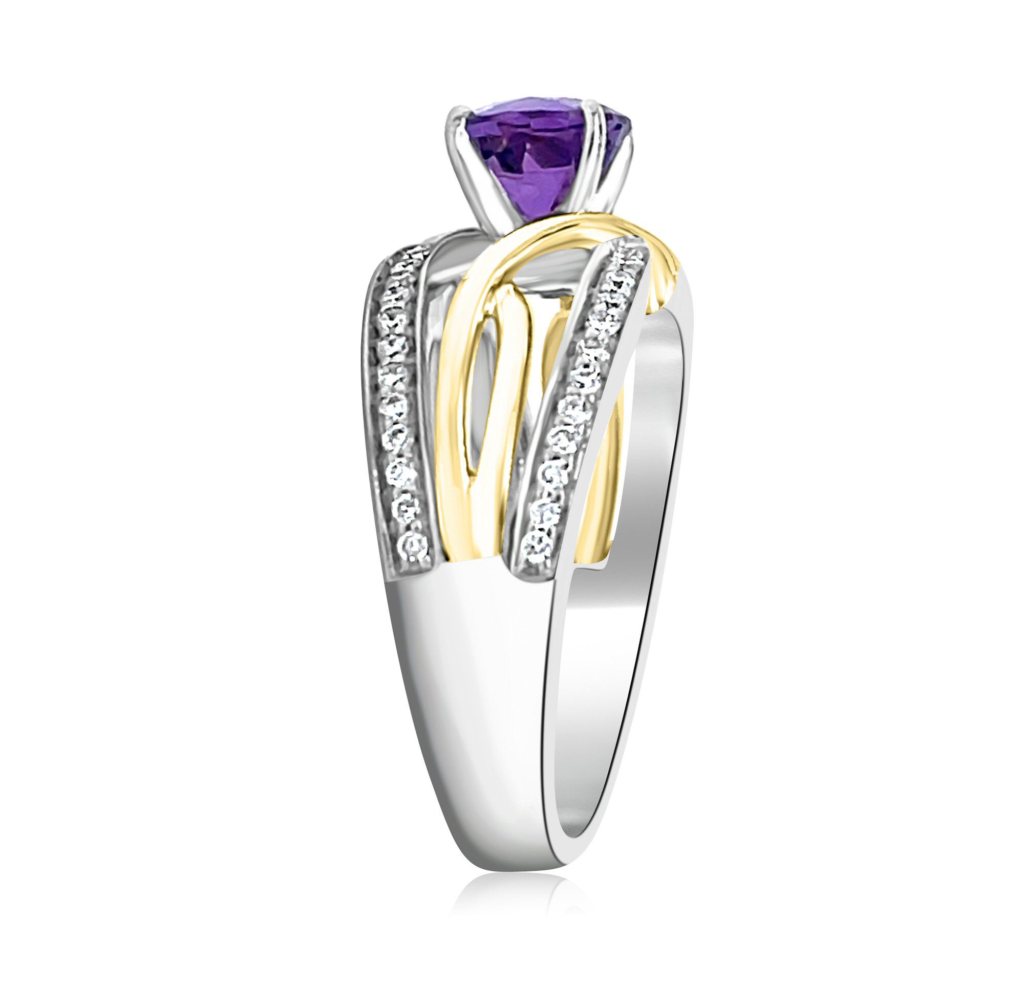This exquisite 14 karat white and yellow gold ring features a striking .70 carat purple amethyst, elegantly set in a unique design with intertwining white and yellow gold bands, adorned with 0.25 cttw sparkling diamonds. Perfect for making a bold statement.