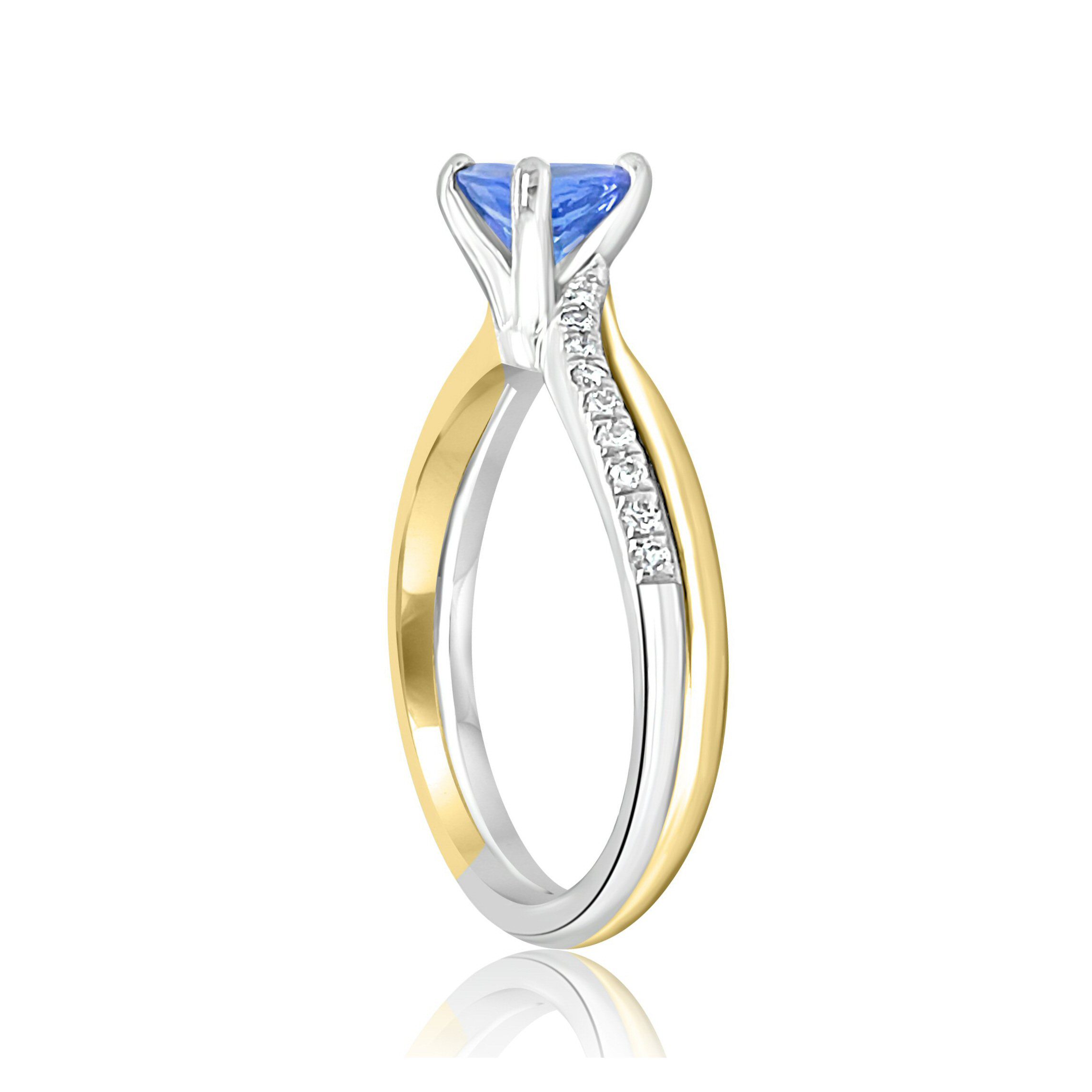 Elevate your jewelry collection with this remarkable two tone tanzanite and diamond ring, The centerpiece of this ring is a vibrant .70 carat triangle shaped tanzanite, resting on a two tone band. Delicate .13 cttw round brilliant cut diamonds are set along the white gold part of the two tone band, adding an extra layer of brilliance.