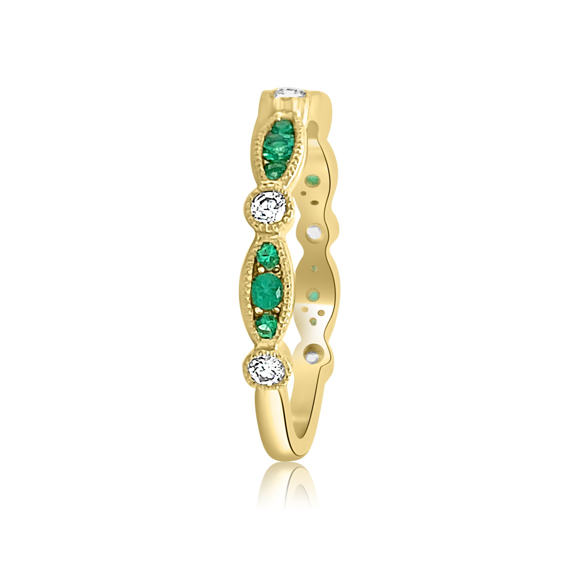 Beautiful 14 karat yellow gold emerald and diamond band. The 0.22cttw emeralds are bezel set in rows of three and alternate with 0.15cttw bezel set round brilliant cut diamonds. Can be worn alone or stacked to create your perfect palette of gemstones.