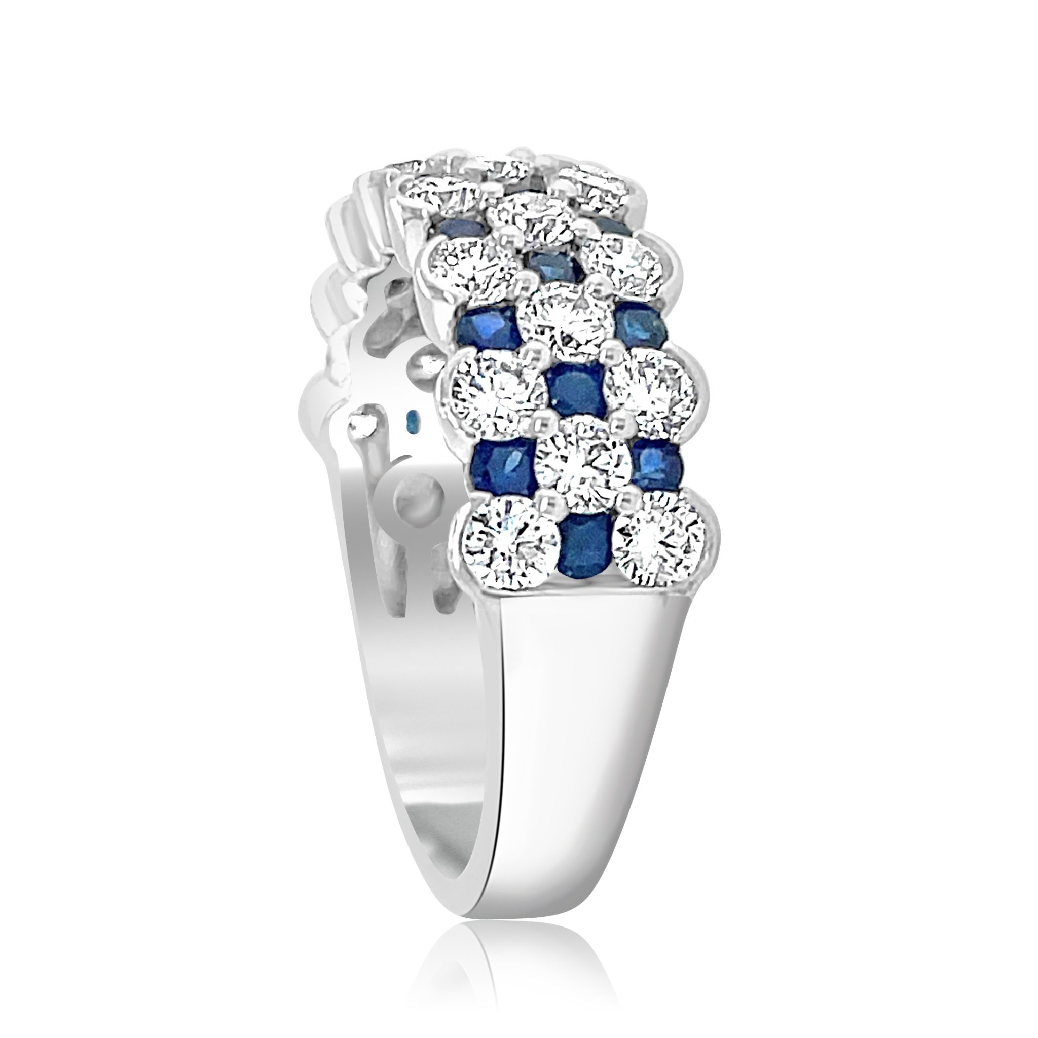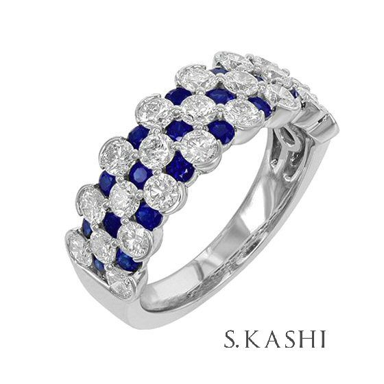 Elevate your style with this stunning 14 karat white gold sapphire and diamond ring by S. Kashi. Set in a checkered style pattern, 0.91 cttw sapphires are set between 1.43 cttw round brilliant cut diamonds. Modern elegance at it’s finest.