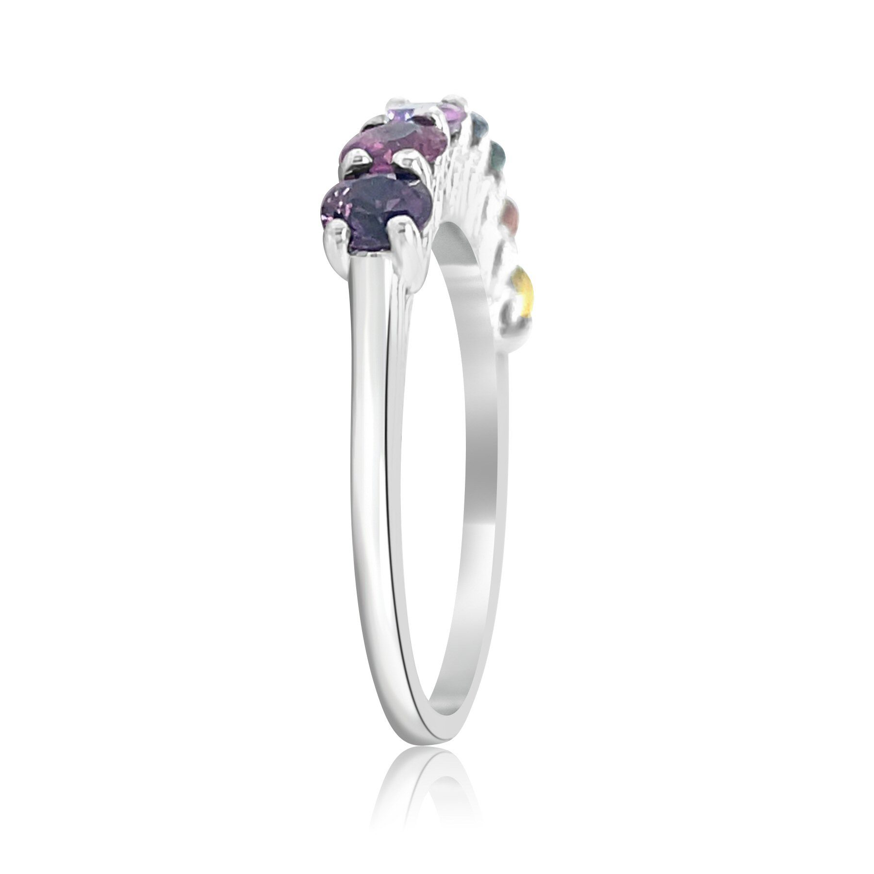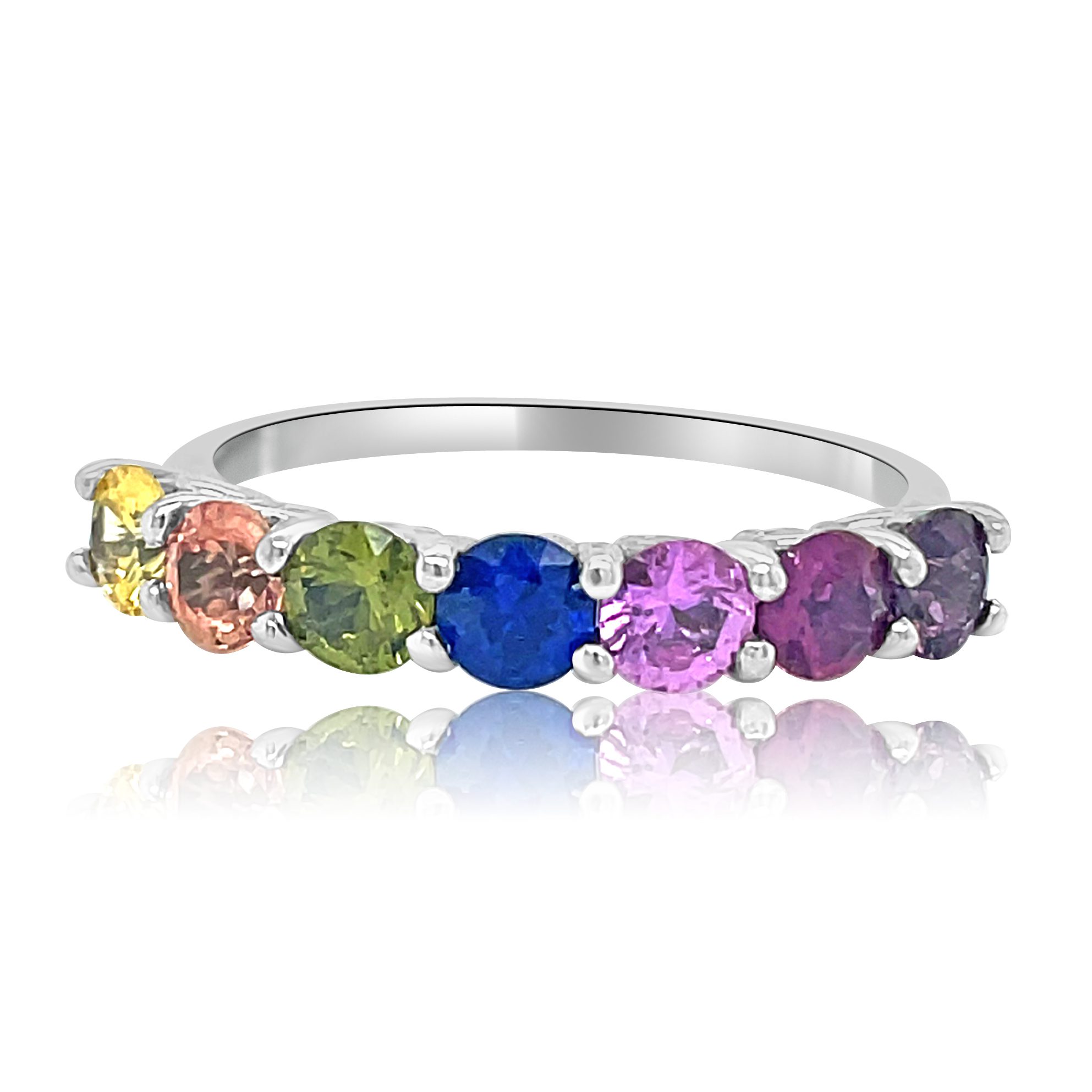 Bursting with color, this 14 karat white gold 1.75cttw colored sapphire band is sure to bring life to any outfit. The band consists of six different 3.8mm naturally mined colored sapphire and one 3.8mm lab grown orange sapphire. These stones are all AA diamond precision cut, with the exception of the center blue stone which is AAA diamond precision cut. From left to right, with the stamp facing up, they are: purple, violet, pink, blue, green, orange and yellow.