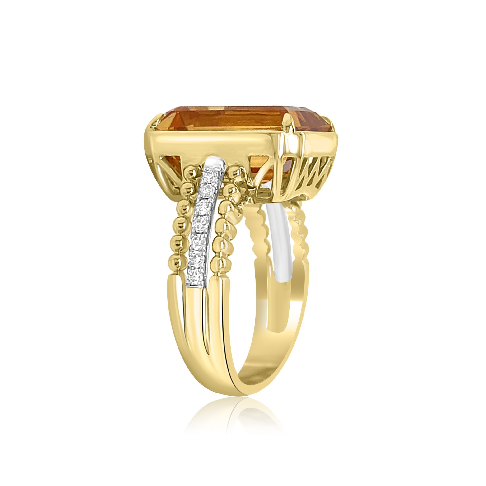 Lovely 14 karat yellow gold citrine and diamond ring. There is a 7.73 carat emerald cut citrine that is prong set. The band consists of three strands, two beaded and one with 0.16cttw round brilliant cut diamonds. The diamonds are SI clarity, G-H in color.