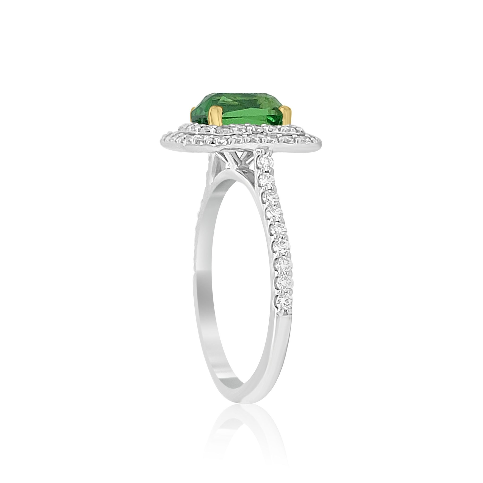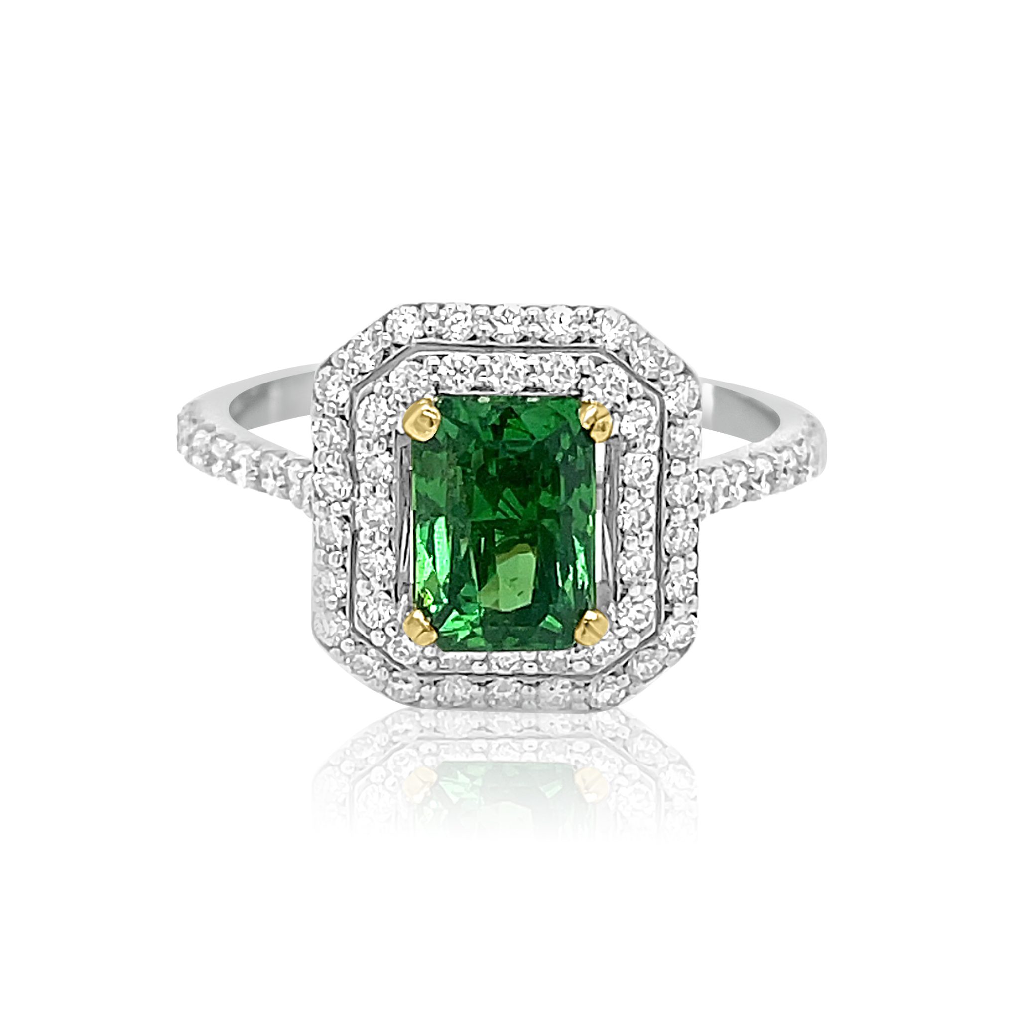 Stunning one of a kind 14 karat white and yellow gold natural Tsavorite garnet and diamond ring. The centerpiece of the ring is a gorgeous bright green garnet from the Tsavo National Forest in Tanzania. The 1.5 carat radiant cut stone is set in yellow gold. There are .51cttw white round brilliant cut diamonds surrounding the garnet in a double halo style ring. One of a kind!!!