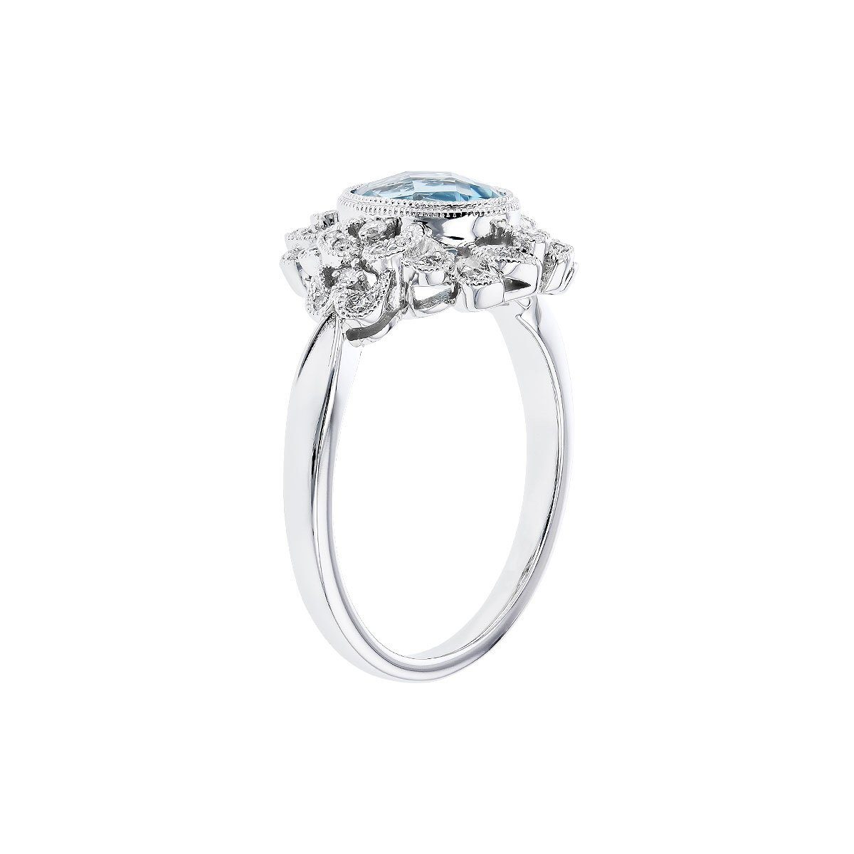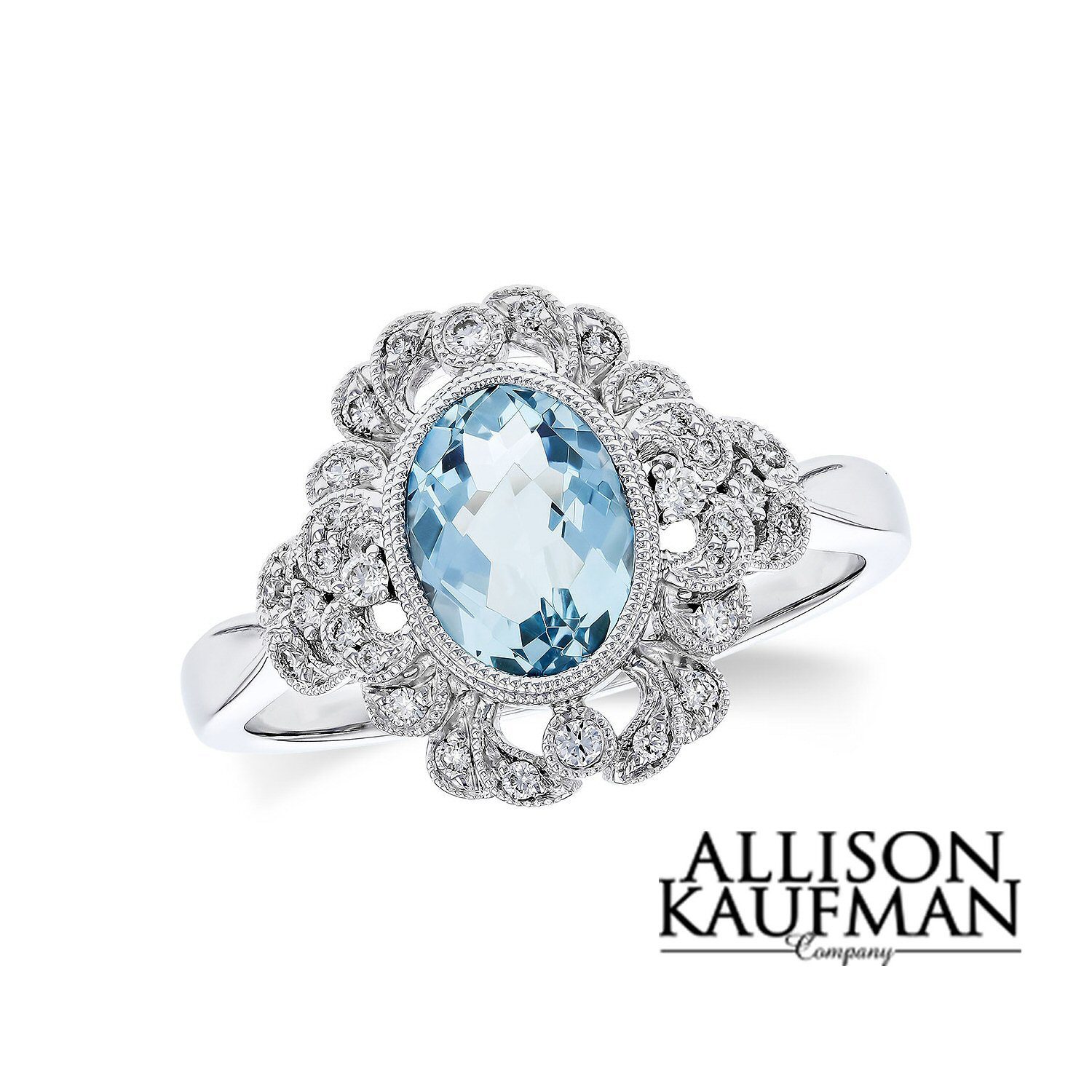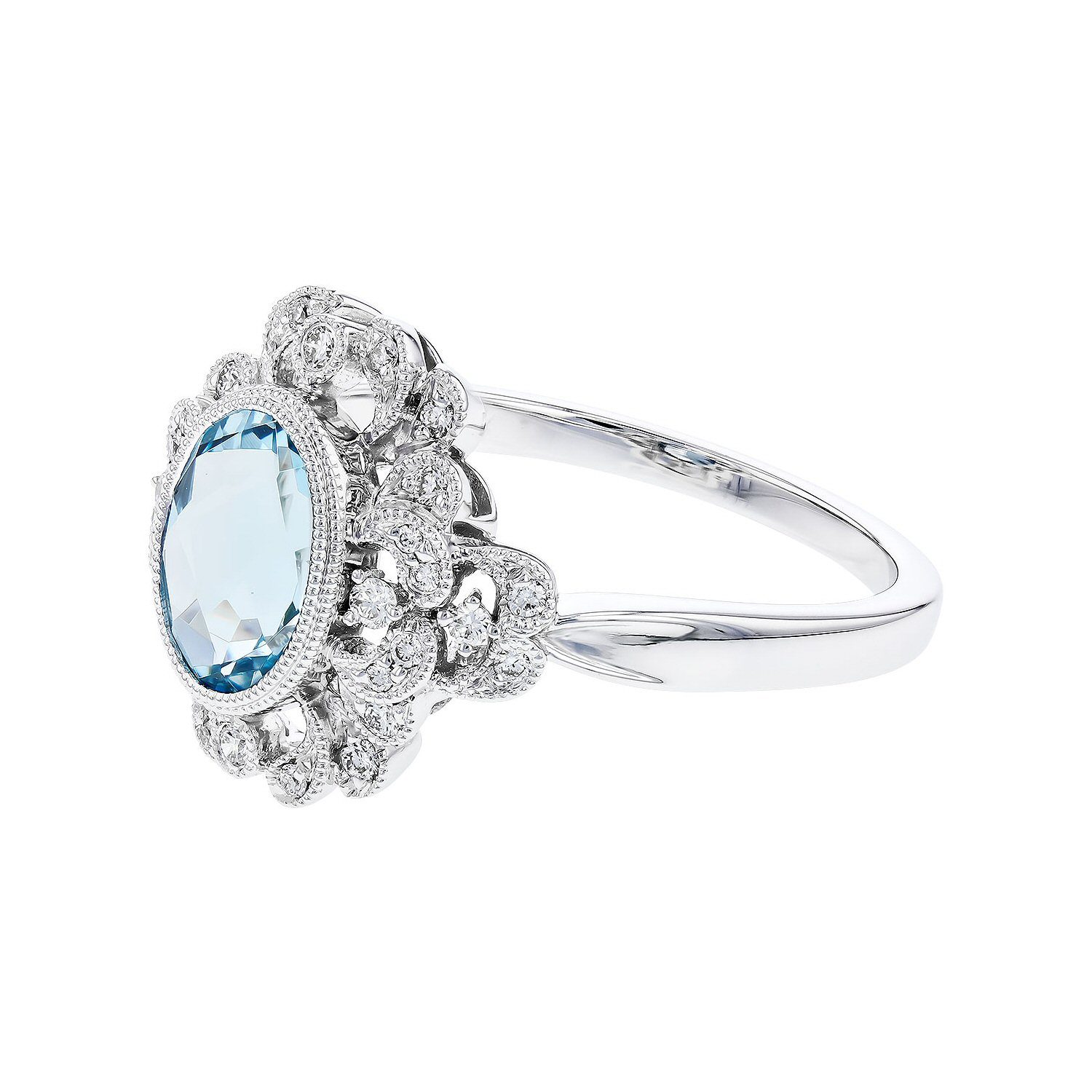 Phenomenally beautiful 14 karat white gold aquamarine and diamond ring. The centerpiece of this ring is a 0.98 carat oval aquamarine. The stone is milgrain bezel set and accented by 0.16cttw round brilliant cut diamonds.