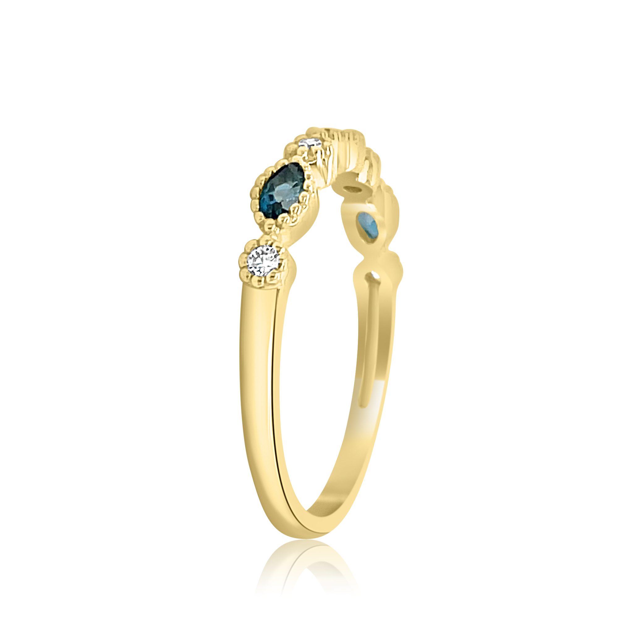 14 karat yellow gold stackable ring with 0.34cttw marquise cut blue topaz and 0.06cttw round brilliant cut diamonds. There are 3 blue topaz are alternating with 4 diamonds, all bezel set with milgrain edging.