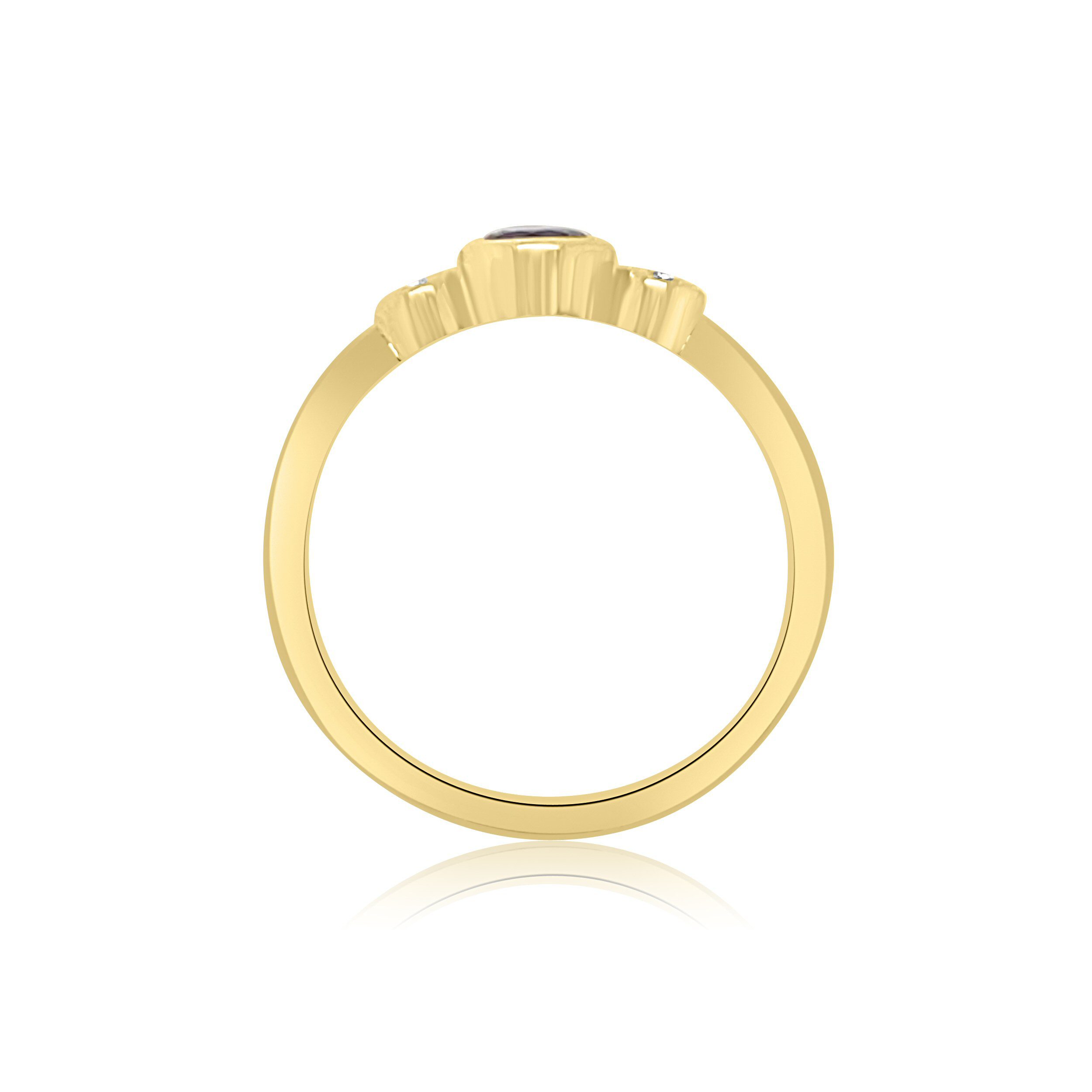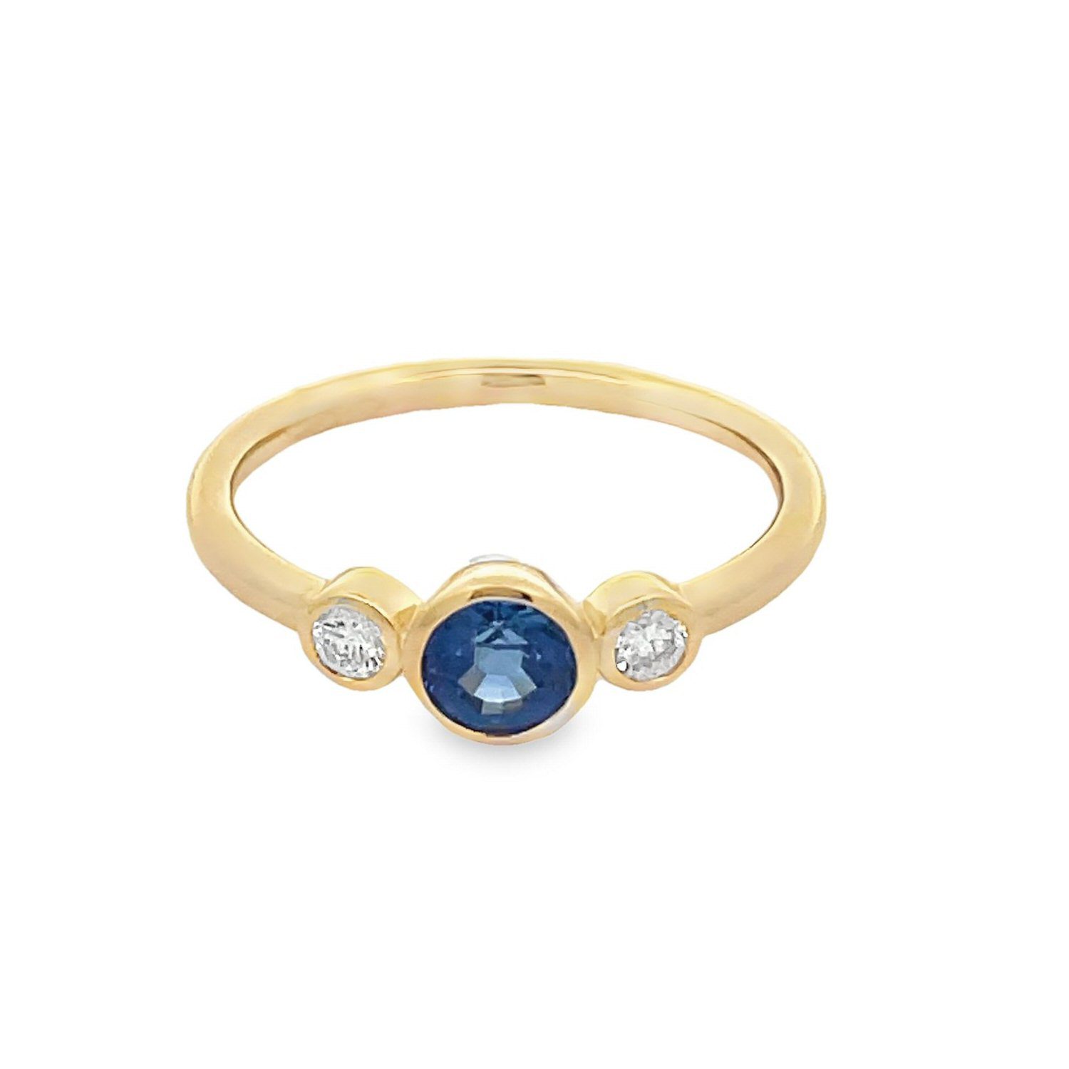 Minimal and pretty 18 karat yellow gold sapphire and diamond ring. The centerpiece of this ring is a bezel set, round .51 carat sapphire, with two bezel set diamonds on either side, totaling .10 cttw diamonds. A beautiful take on a classic three-stone ring.