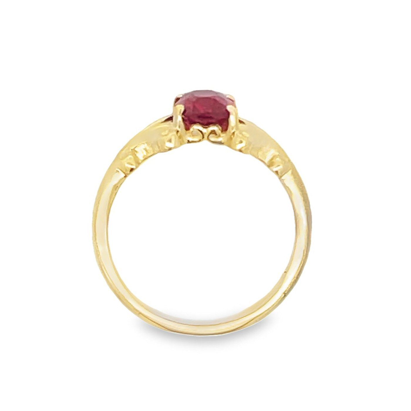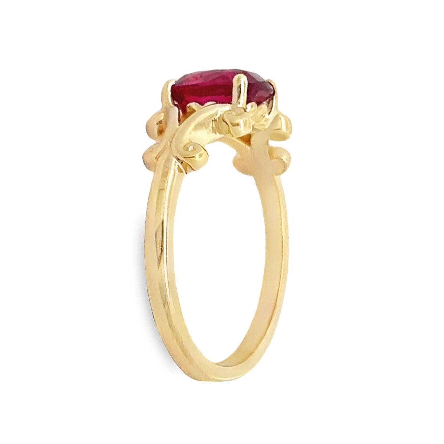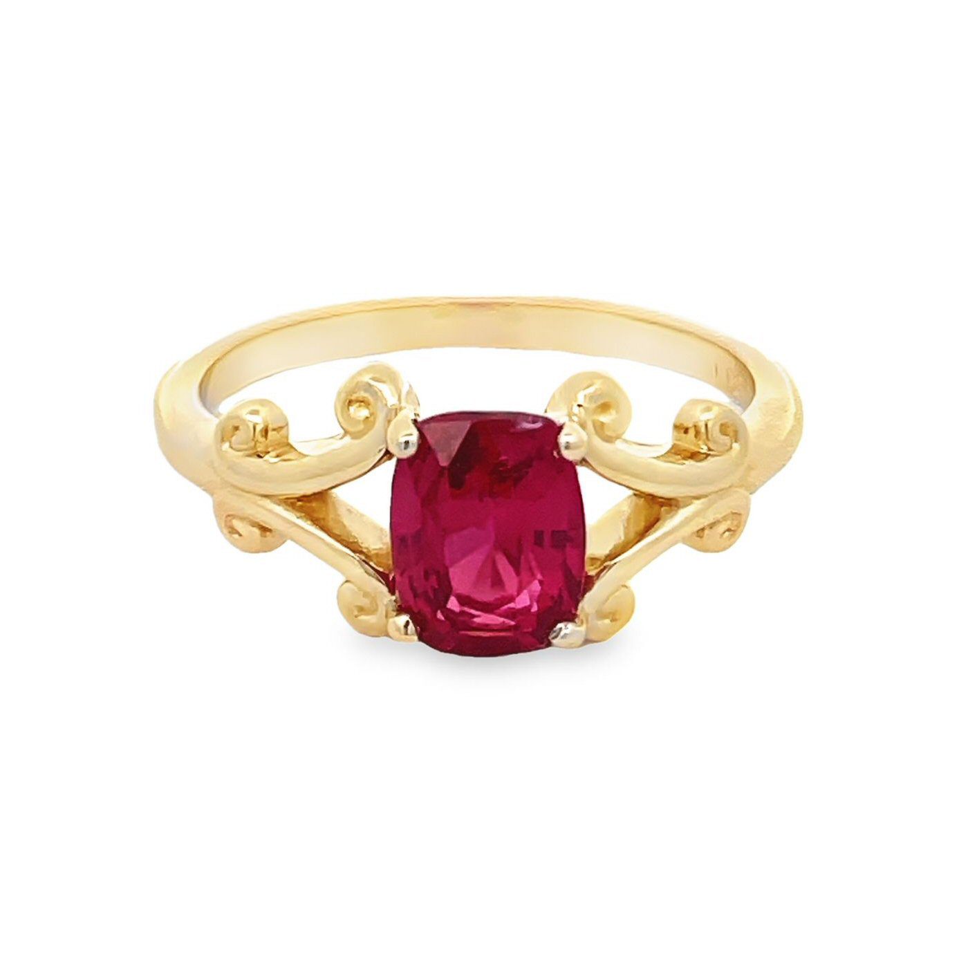 Experience a taste of true elegance with this exquisite 14 karat yellow gold ring, showcasing a brilliant 1.54 carat rectangular cushion cut ruby at its center. Set between delicate gold swirls, this piece brings together elegance and natural beauty in perfect harmony.