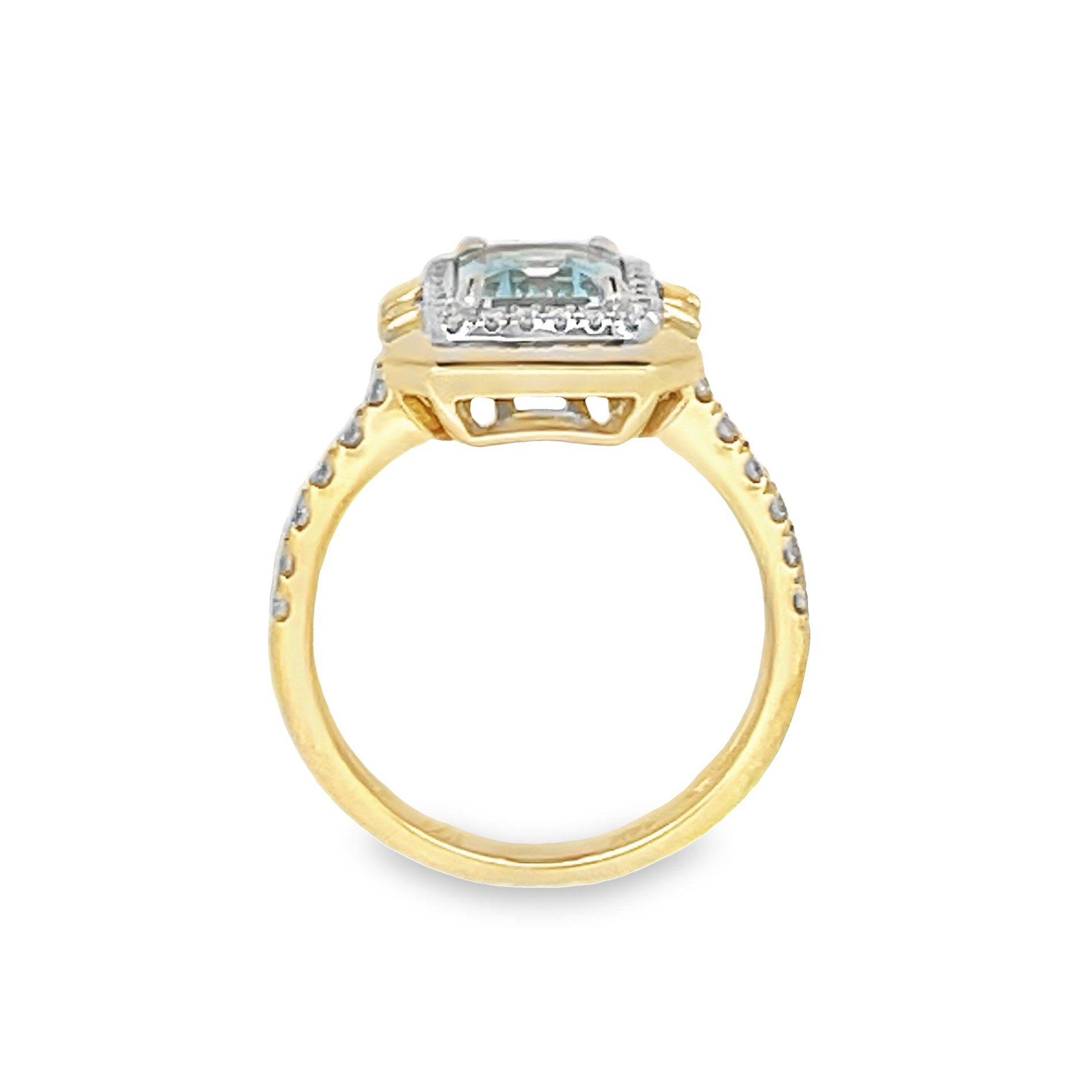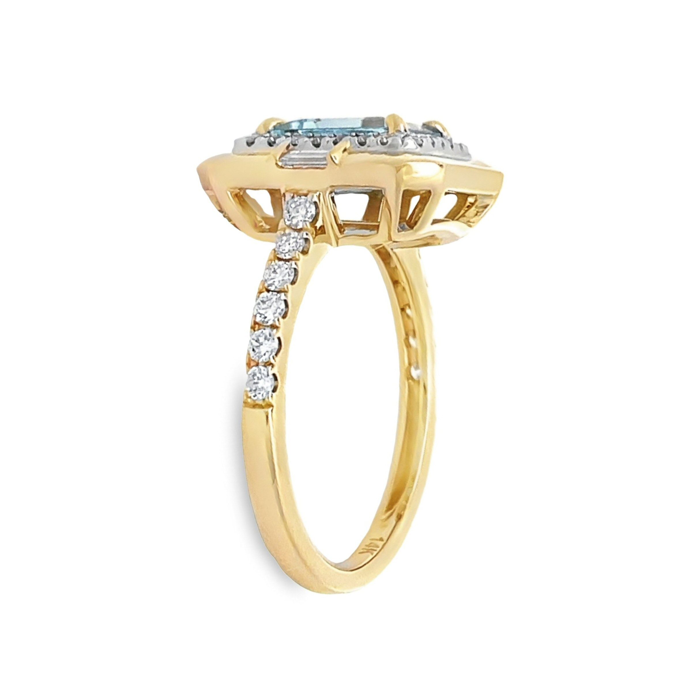 This stunning 14 karat yellow and white gold aquamarine ring is the epitome of elegance and sophistication. The centerpiece of this ring is a radiant 1.23 carat emerald cut aquamarine, surrounded by 0.11cttw baguette cut and 0.34cttw round brilliant cut diamonds.