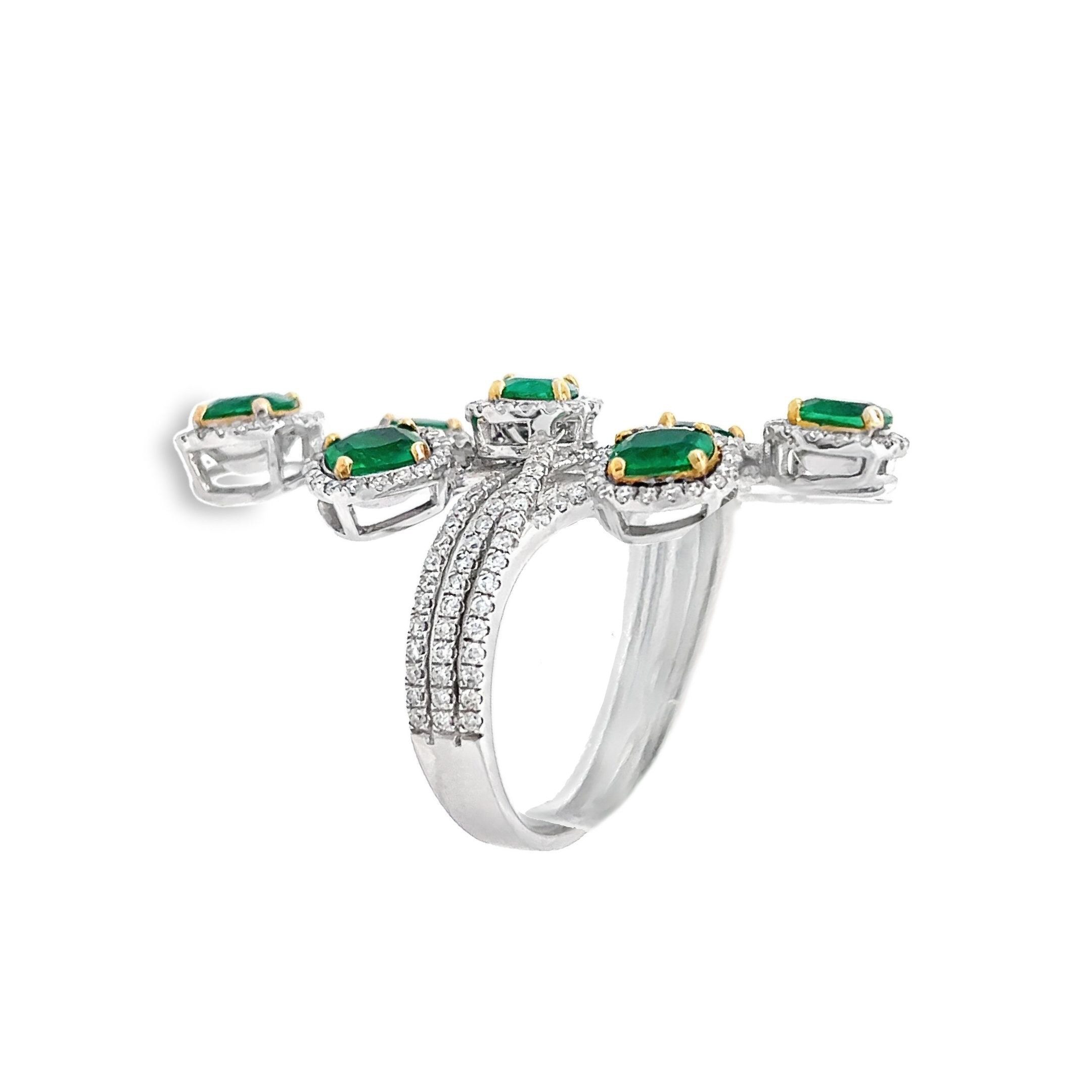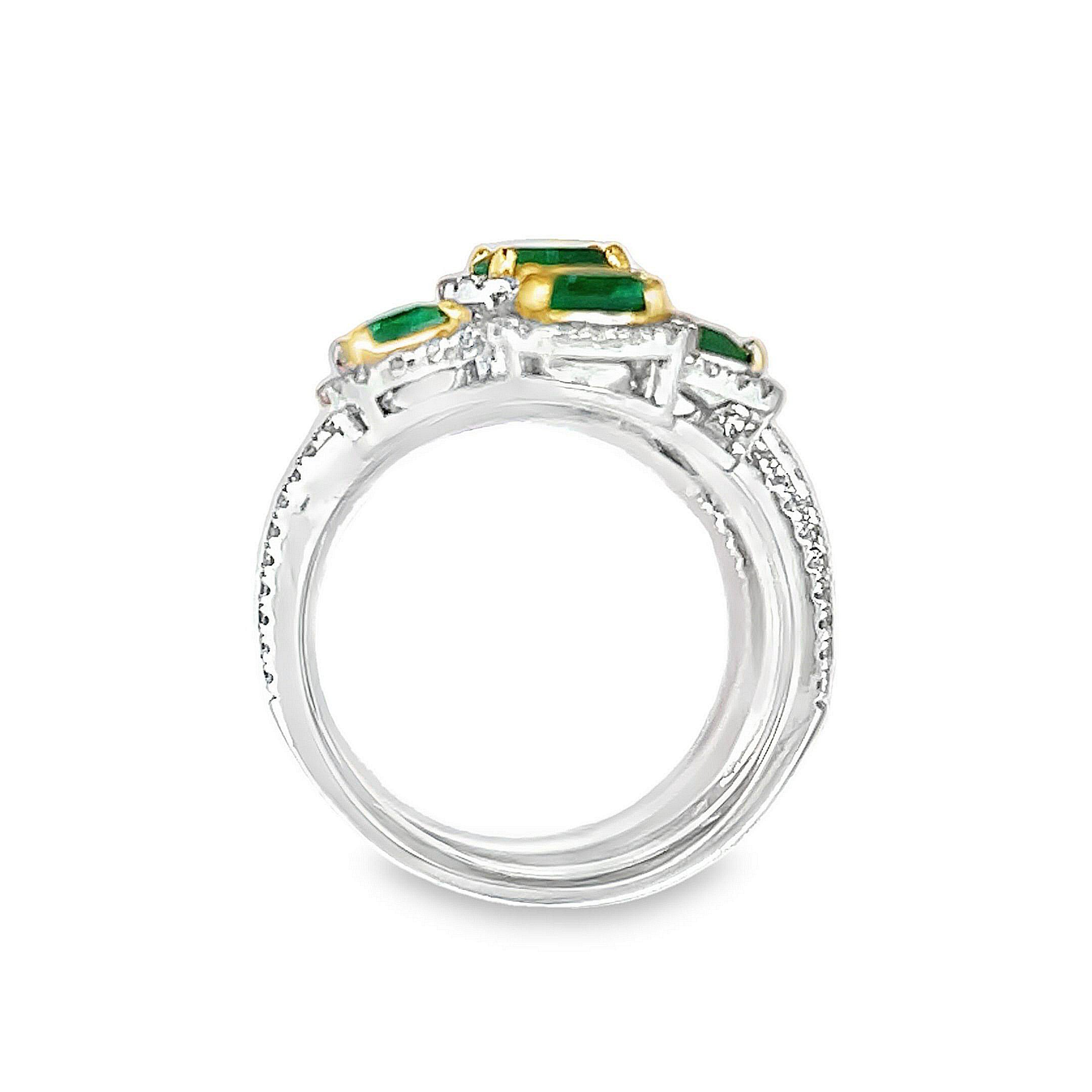 A true masterpiece in jewelry design, this 14 karat white gold ring showcases 7 different emeralds weighing a total of 2.70 carats. There are 0.89cttw round brilliant cut diamonds in 3 rows on the sides of the ring and surrounding each emerald. The harmonious blend of emeralds and diamonds creates an enchanting piece that is sure to captivate.
