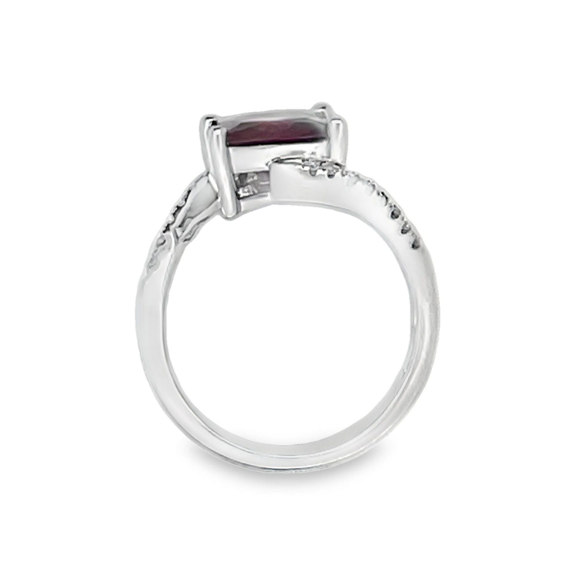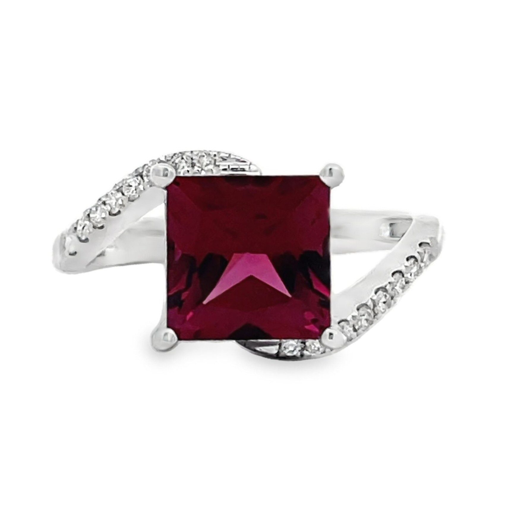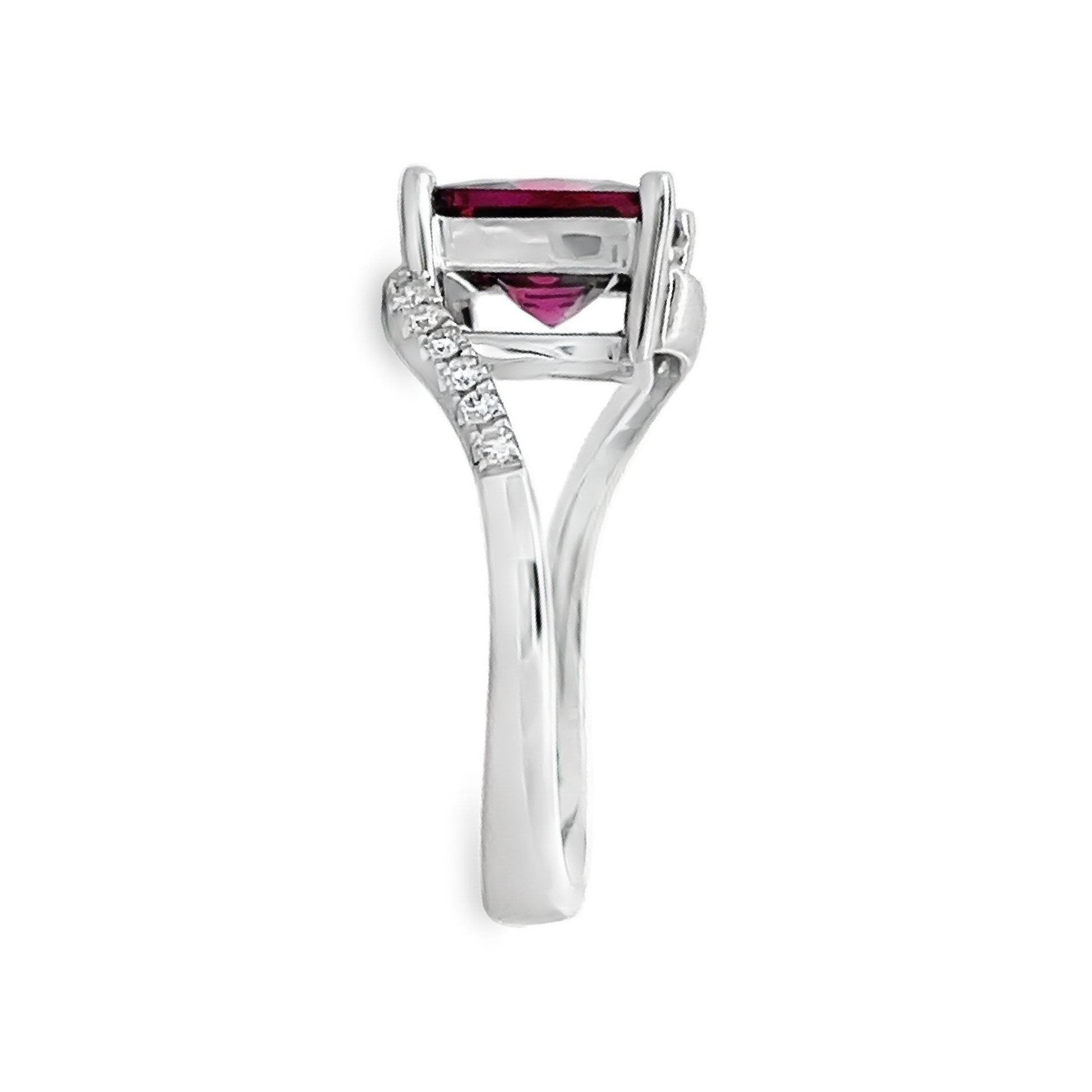 Positively radiant 14 karat white gold 3.1 carat square cut rhodolite garnet bypass ring with .13cttw round brilliant cut diamonds.