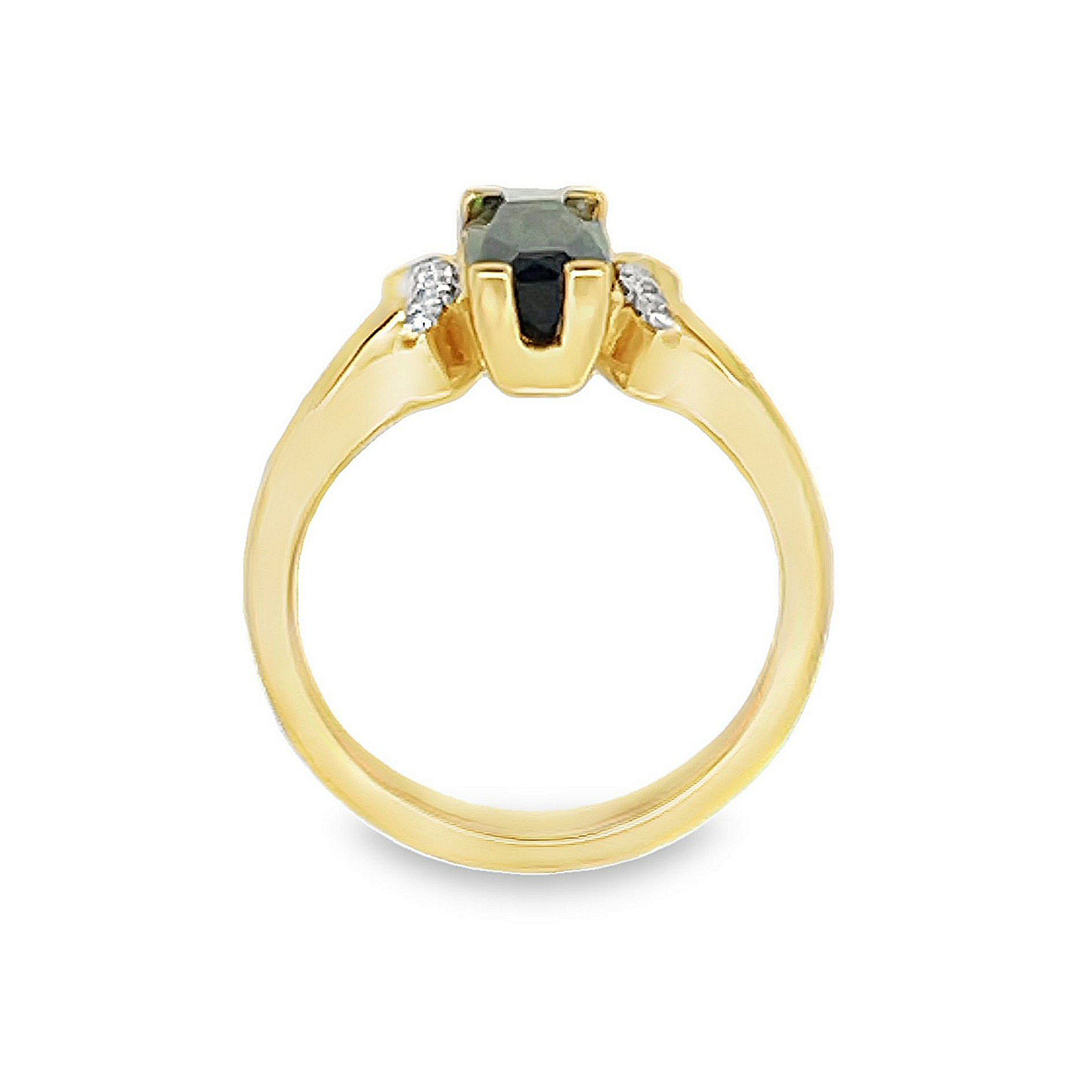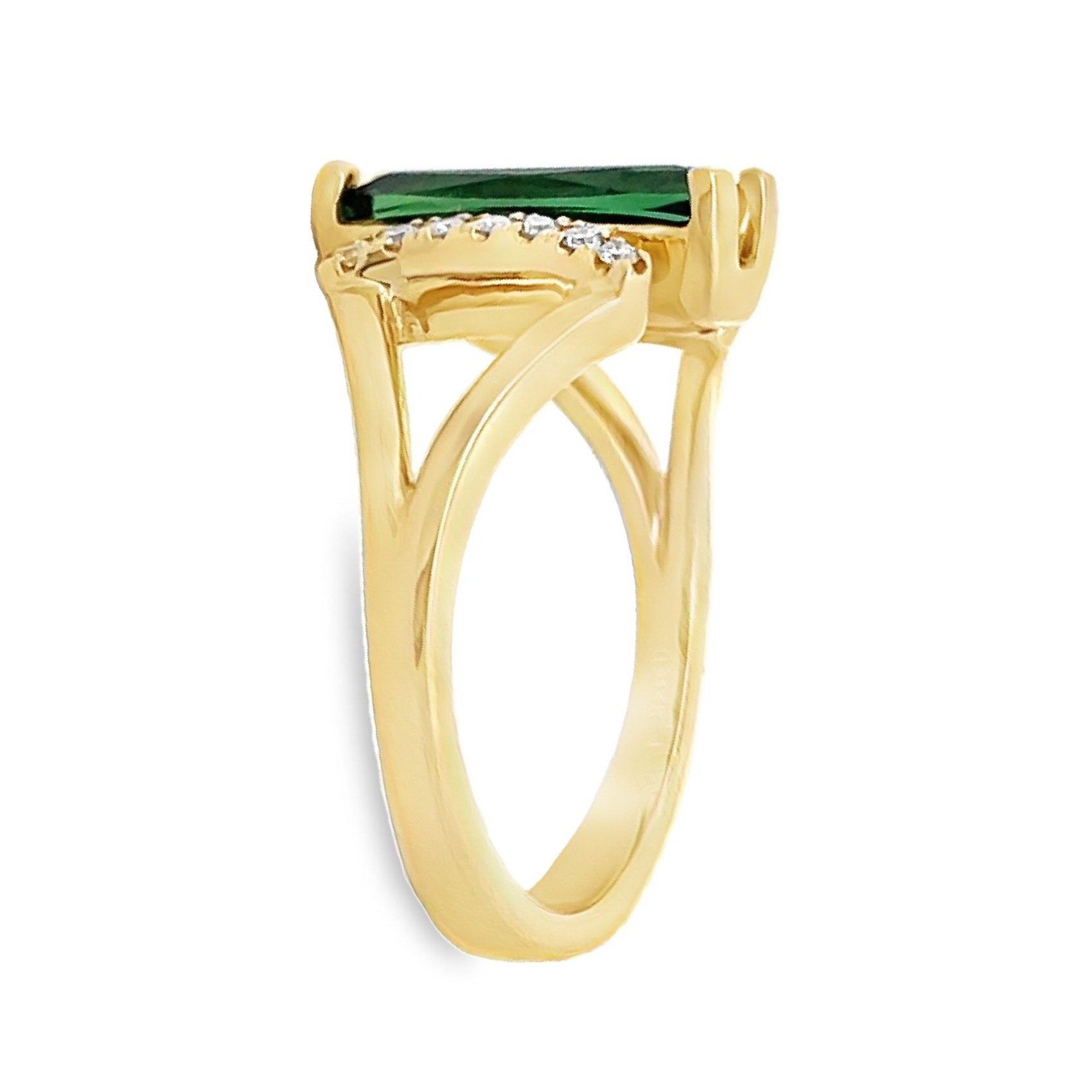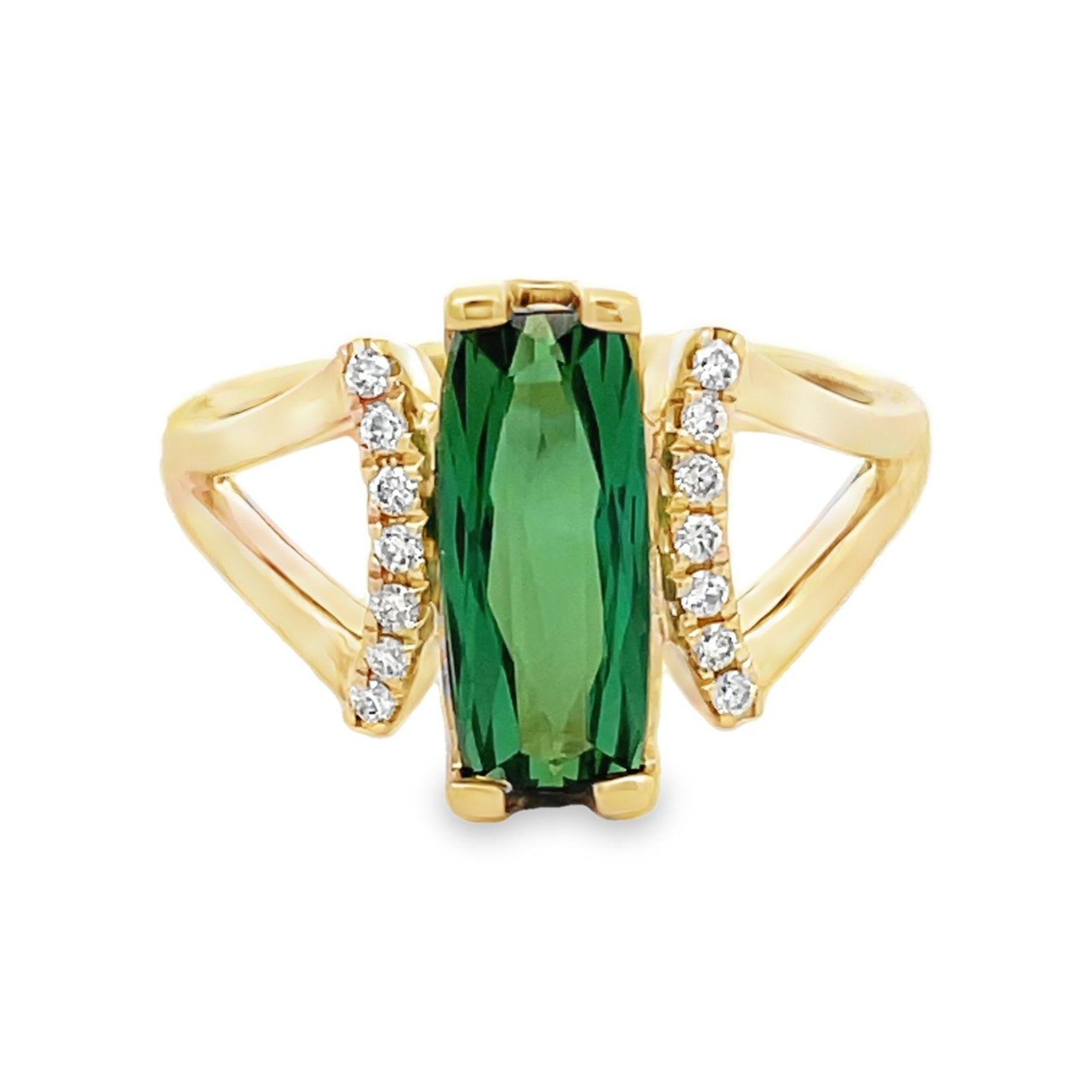 Make a statement with this 14 karat yellow gold green tourmaline and diamond ring. The centerpiece of this ring is a 1.9 carat elongated cushion cut green tourmaline, complemented by .11 cttw diamonds set in a fan-like configuration on each side. Timelessbeauty and modern flair.