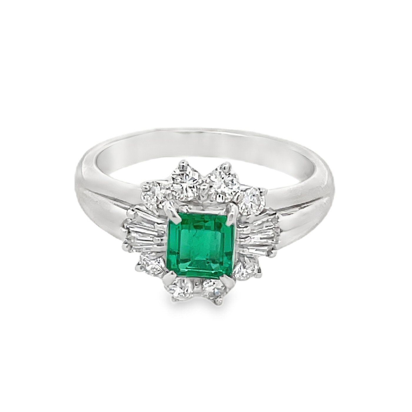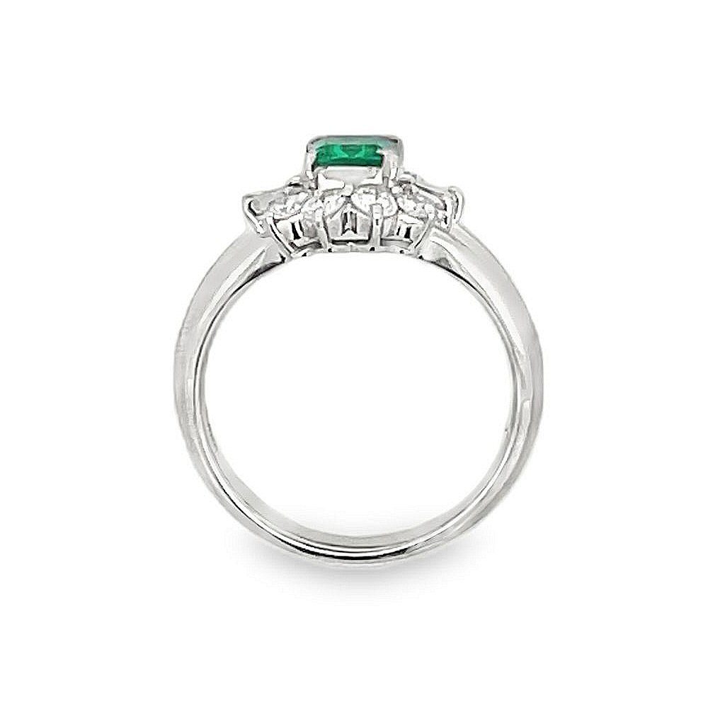 Vintage platinum emerald and diamond ring. The centerpiece of the ring is a .37 carat beautiful bright, clear green princess cut emerald. It is accented with 0.50cttw baguette and round brilliant cut diamonds. Gorgeous!