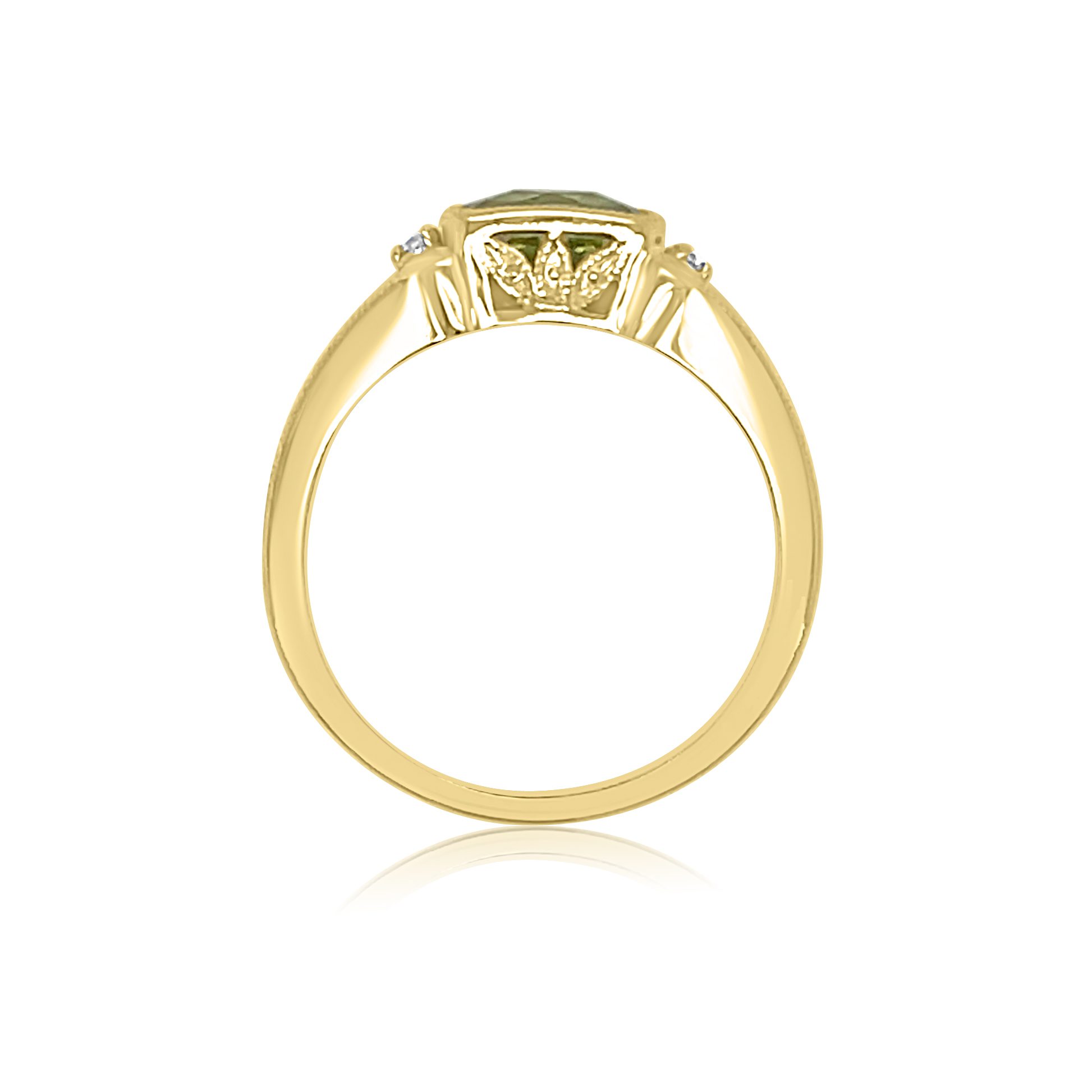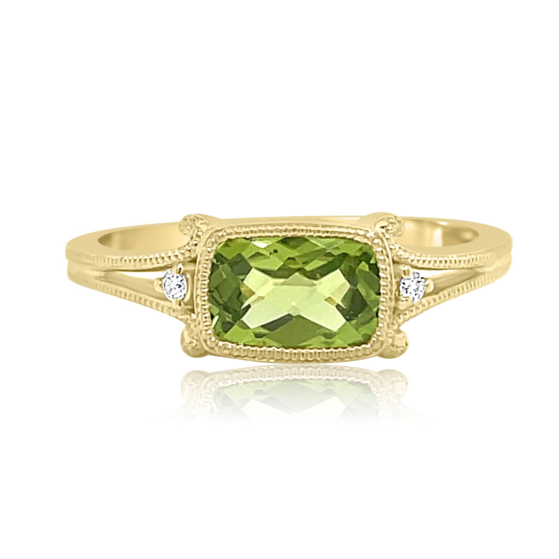 Lovely 14 karat yellow gold peridot and diamond ring. The center stone is a 1.07ct checkerboard cut peridot that is bezel set east-west. There is a 0.01ct round brilliant cut diamond on either side of the peridot.