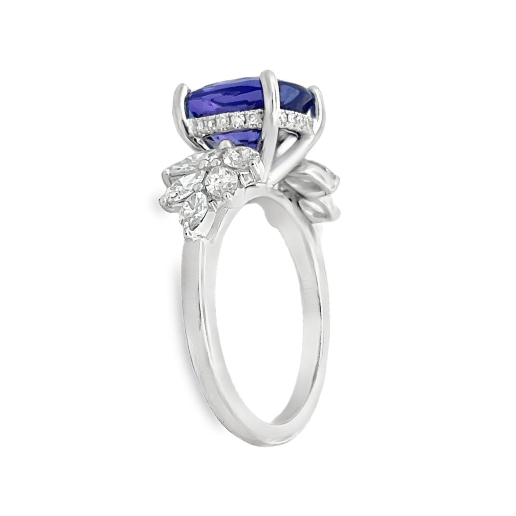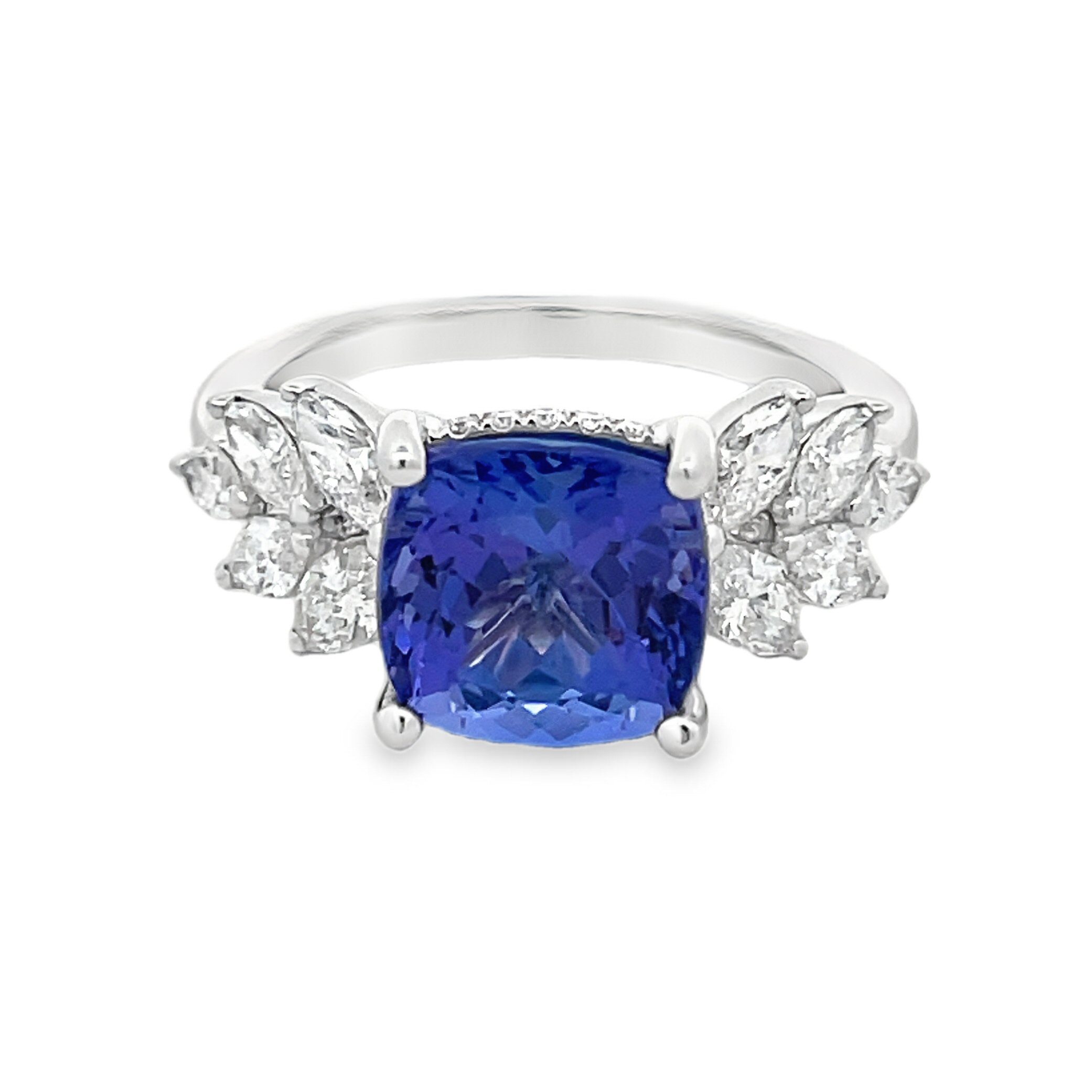 This exquisite 14 karat white gold ring features a stunning 3.3 carat cushion cut tanzanite, surrounded by .90cttw marquise cut and round brilliant cut diamonds that enhance its brilliance. The intricate design and high-quality craftsmanship make it a perfect choice for special occasions or as an everyday statement piece.