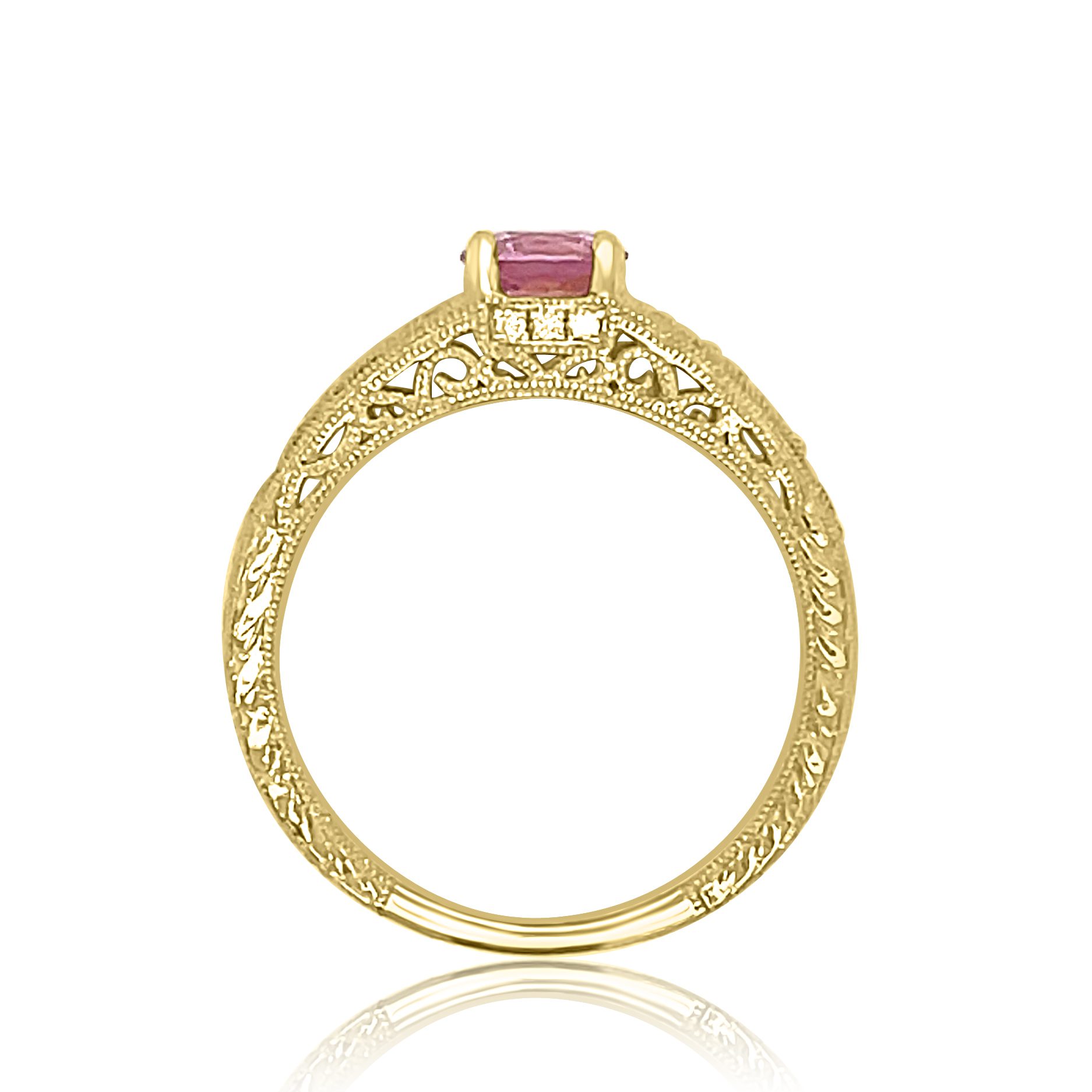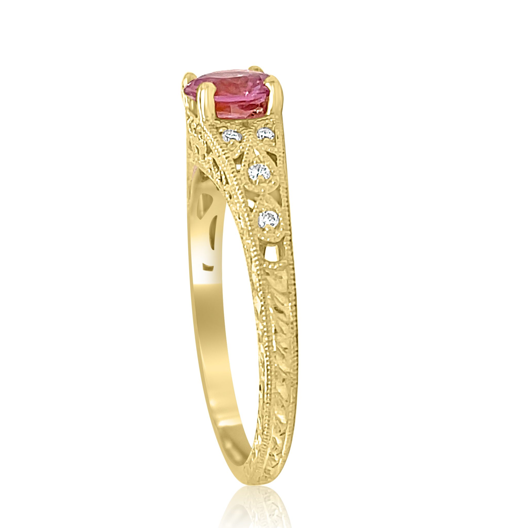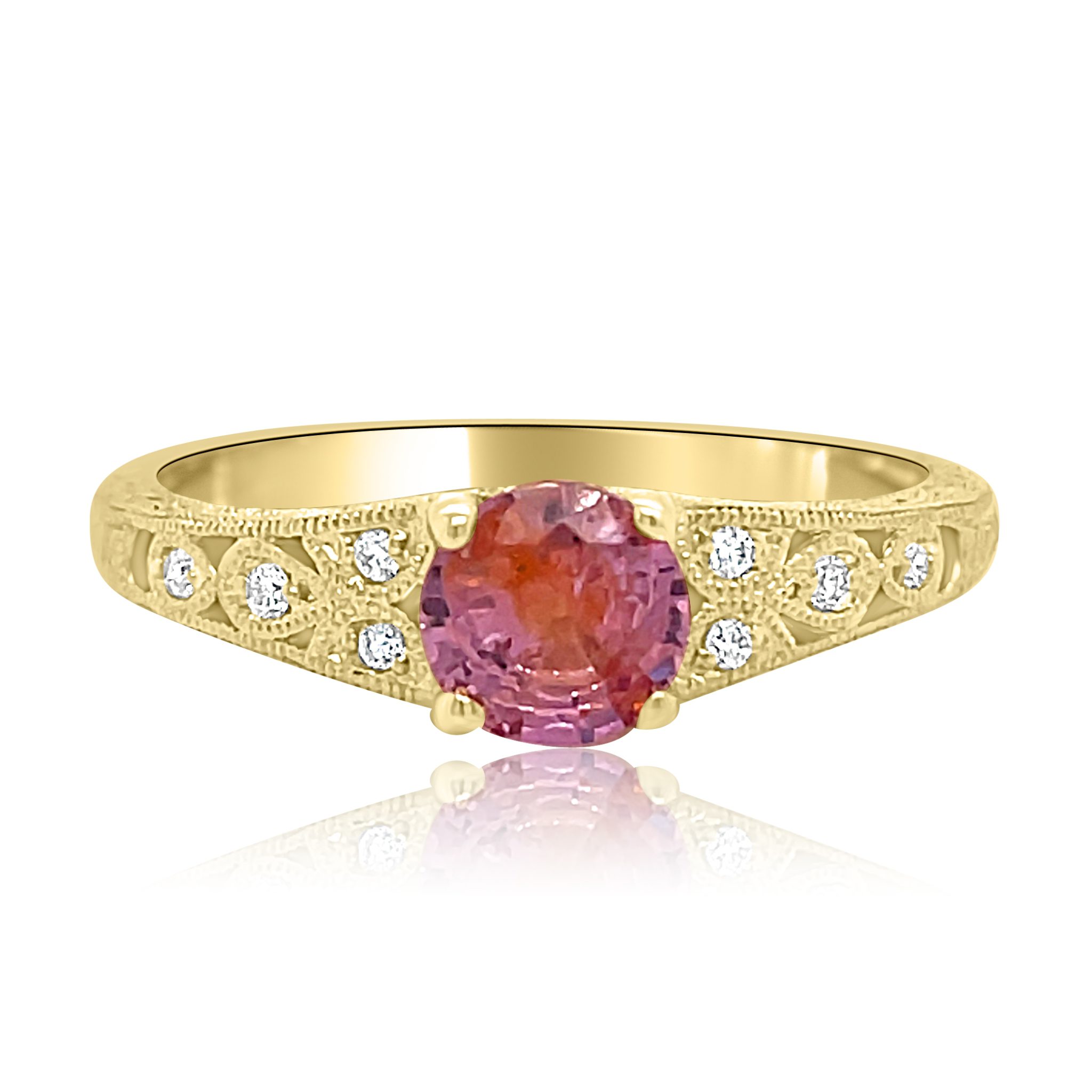 One of a kind 14 karat yellow gold sapphire and diamond ring. This beautiful vintage style ring has a unique 0.58 carat round pink sapphire from Ceylon and is accented with .08cttw round brilliant cut diamonds down the band. Simple, yet elegant.