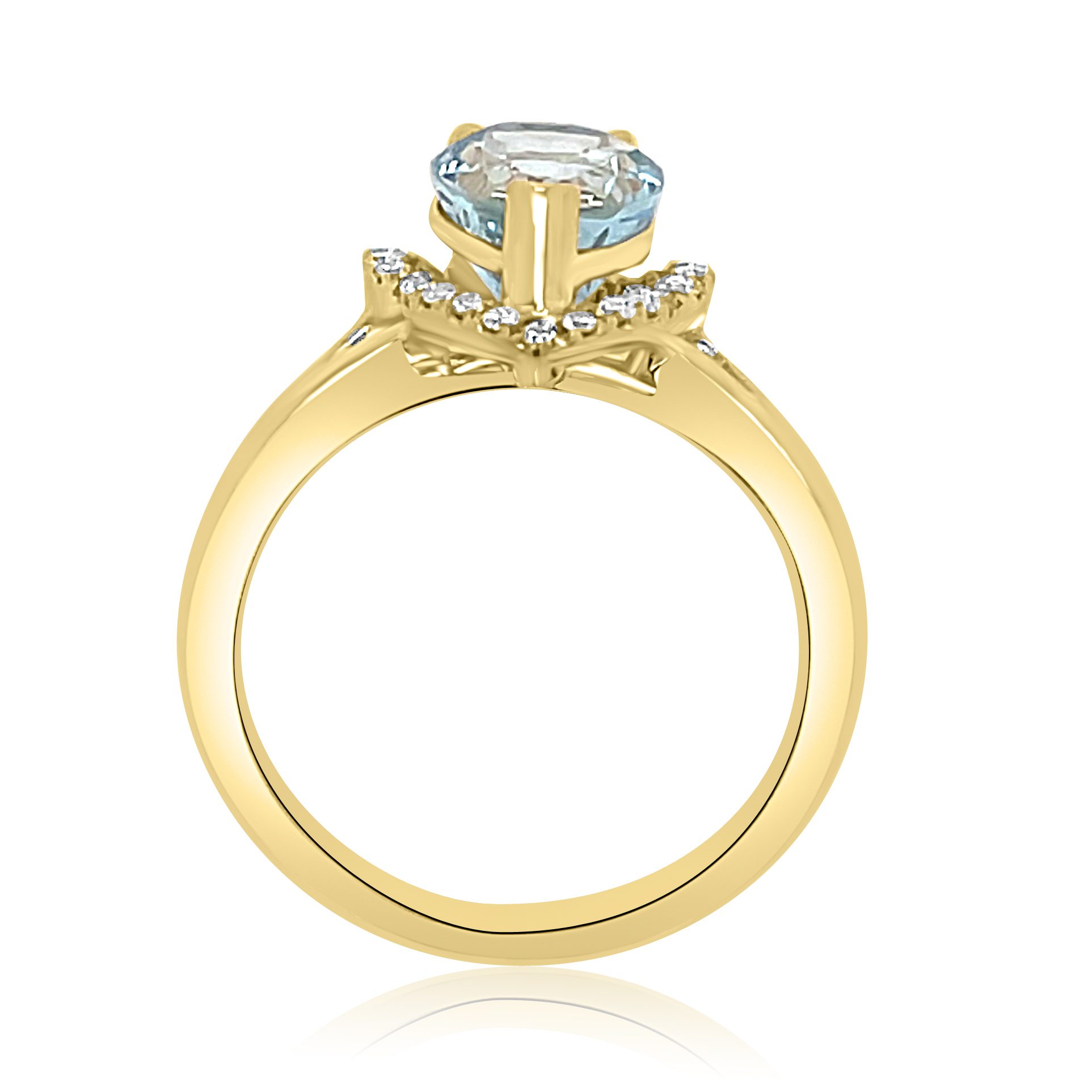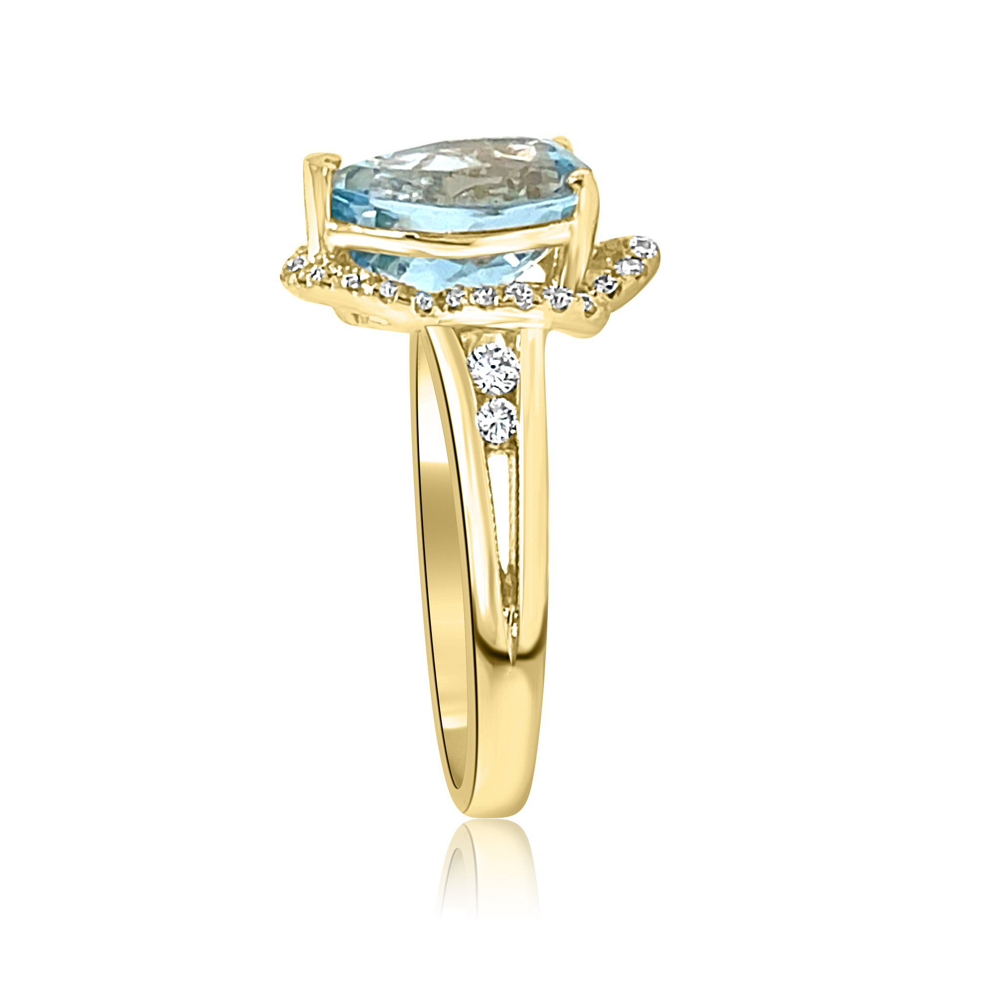 Radiate sophistication with this exquisite 14 karat yellow gold aquamarine and diamond ring. The centerpiece of the ring is a 2.28 carat pear shaped aquamarine with 0.29 cttw round brilliant cut diamonds prong set in a curved halo and between the split shank. Perfect for adding an elegant touch to any outfit.