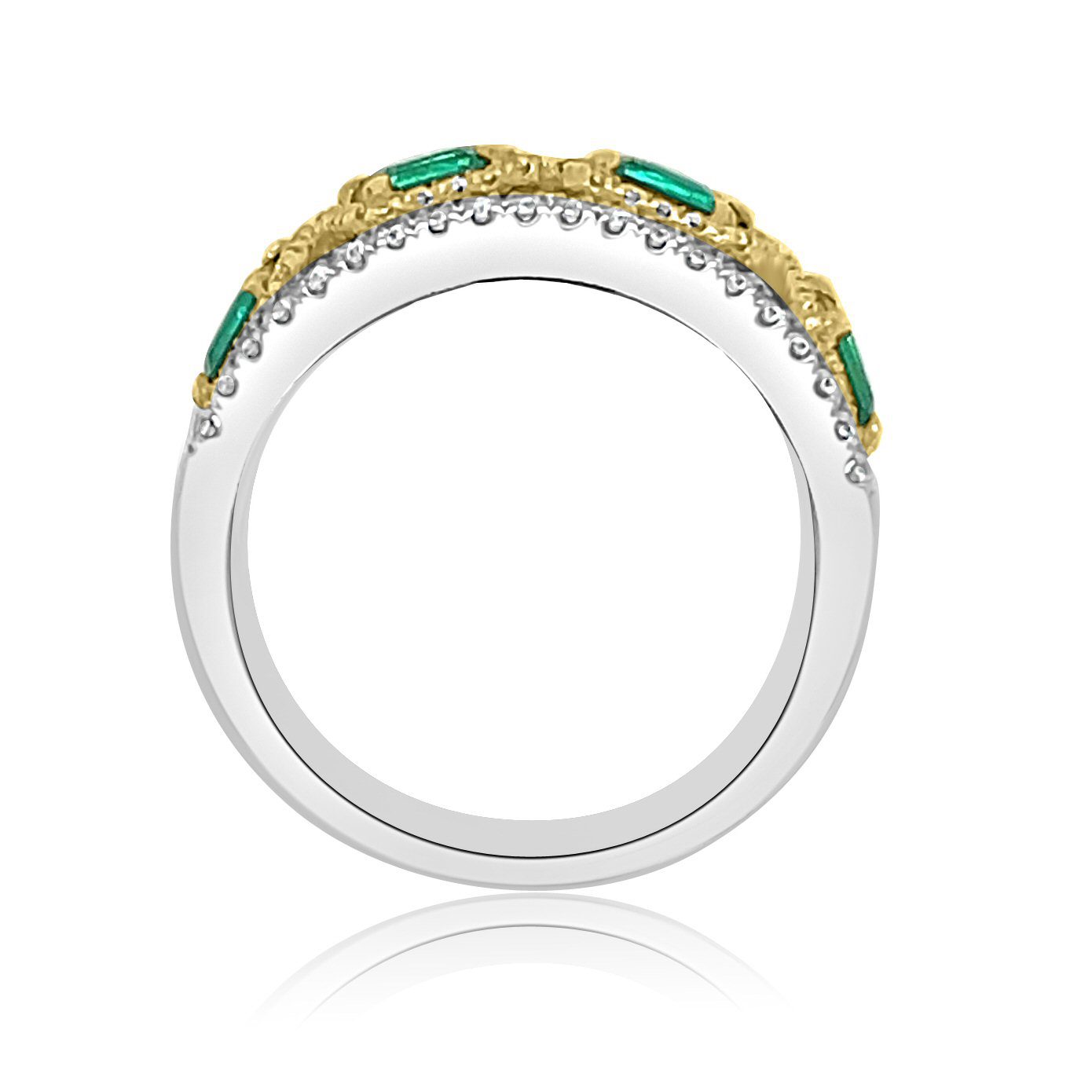 Lovely and elegant 14 karat white and yellow gold emerald and diamond band. The combination of 0.57 cttw round brilliant cut diamonds and a vivid 1.24 cttw emeralds makes it an elegant choice for those who appreciate timeless beauty and impeccable quality.