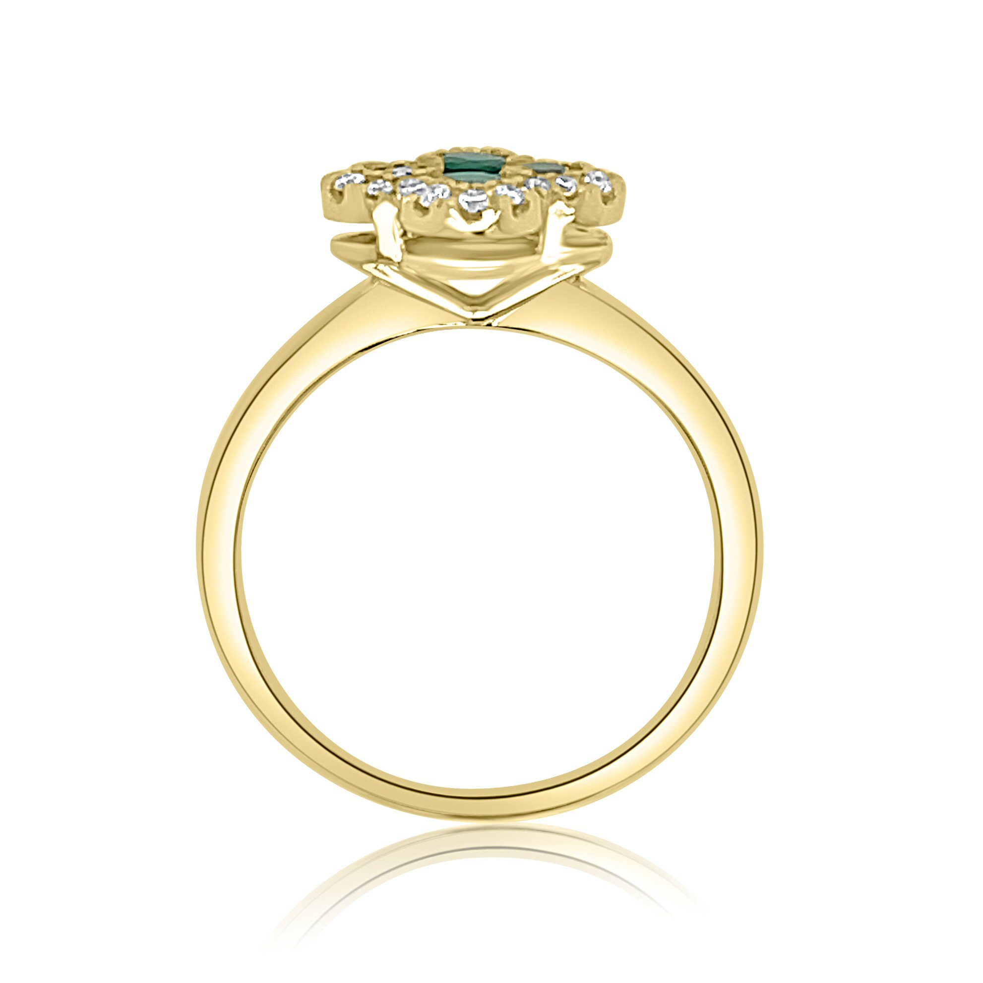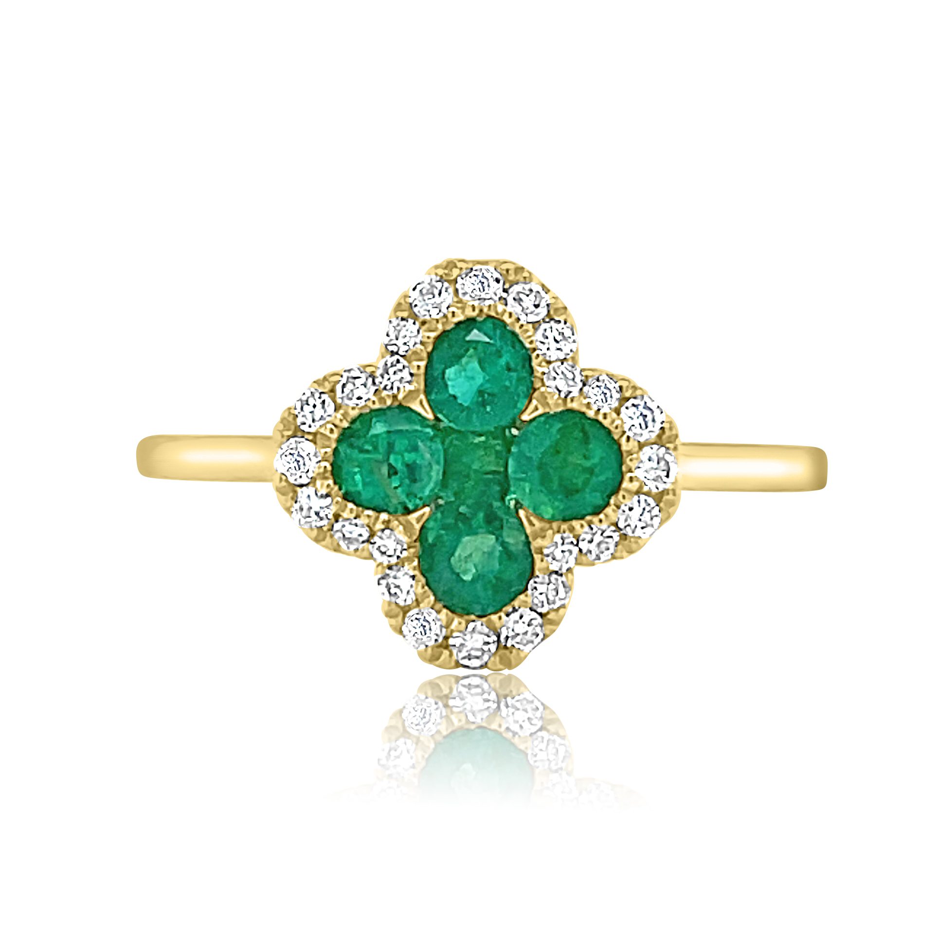 A masterpiece of elegance, this14 karat yellow gold ring showcases radiant 0.70 cttw emeralds encircled by 0.15 cttw round brilliant cut diamonds. The intricate “Alhambra” clover style setting makes this ring a classic and elegant choice for any special occasion or as a cherished gift.