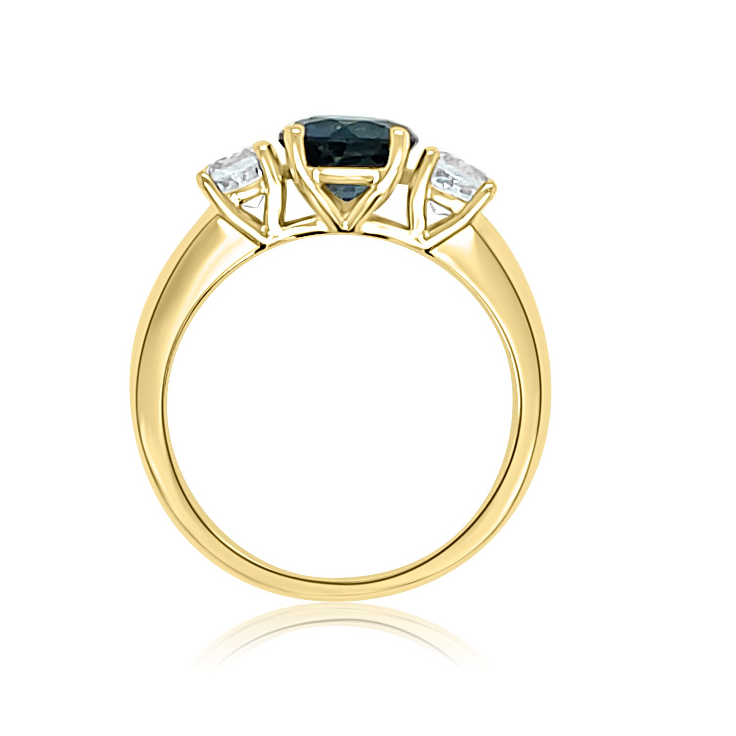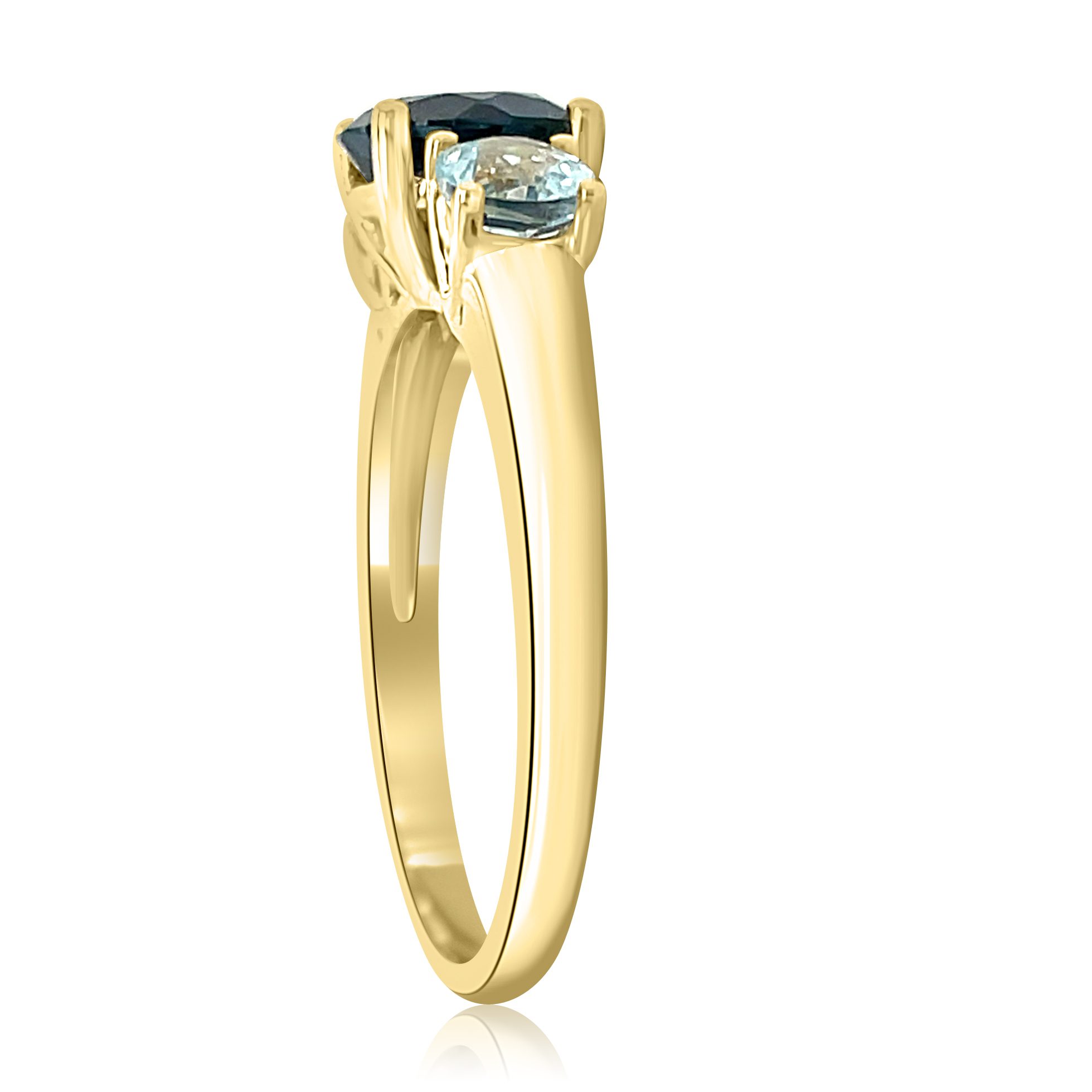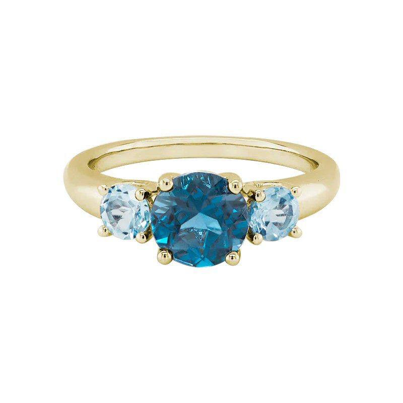Elegant and lovely 14 karat yellow gold 3 stone ring with a 1.54 carat London blue topaz in the center and one 4 mm sky blue topaz on each side, totaling 0.60 cttw.