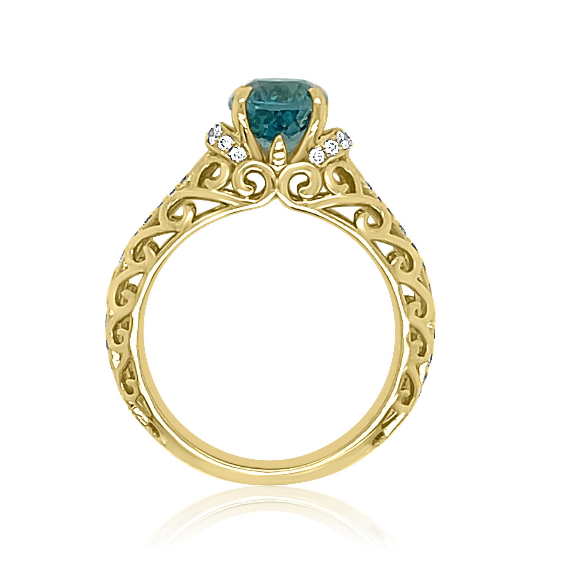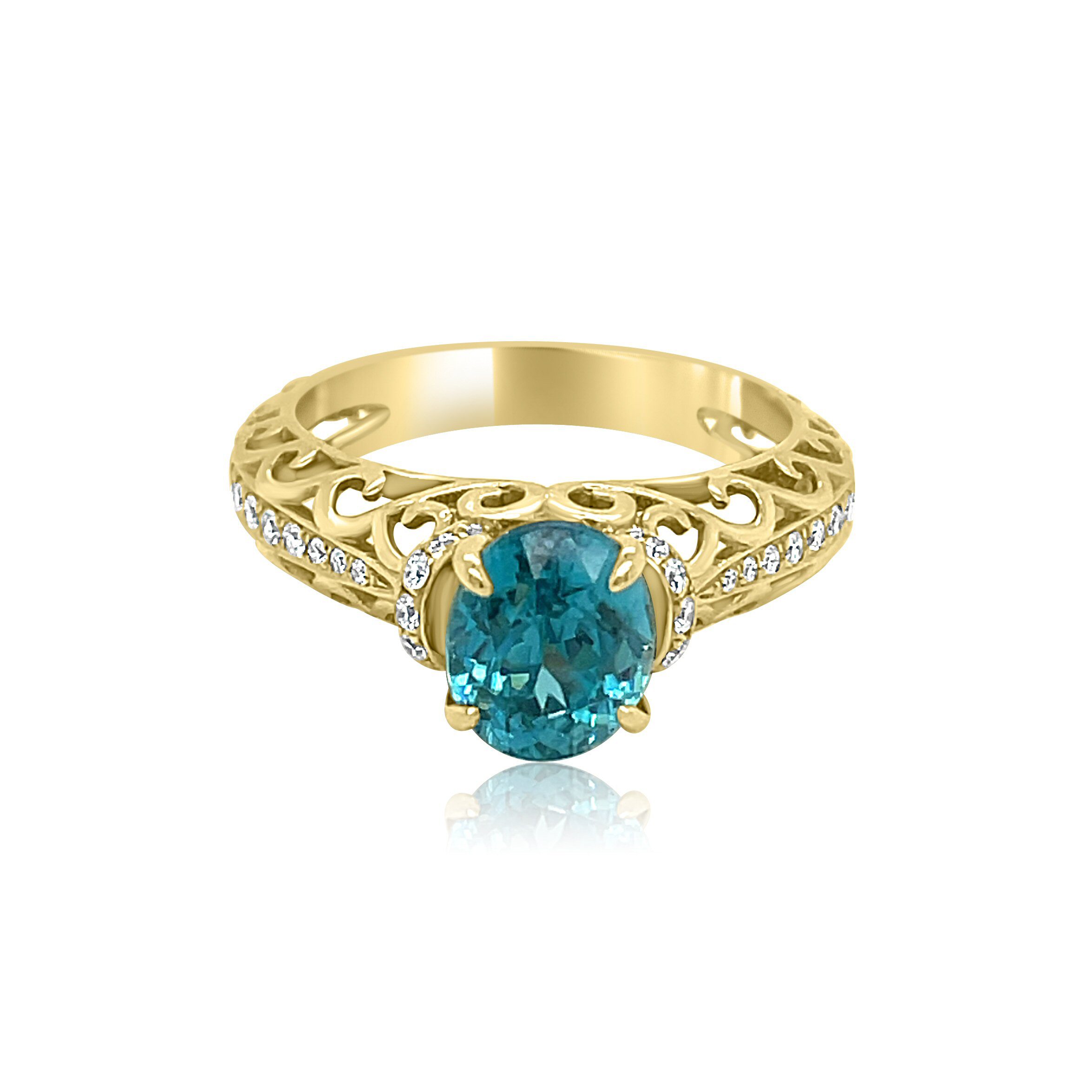 Crafted with precision and care, this 14 karat yellow gold vintage style ring showcases a gorgeous 2.76 carat blue zircon with .27cttw round brilliant cut diamonds. The stunning oval blue-green zircon paired with delicate diamonds exudes sophistication and timeless beauty.