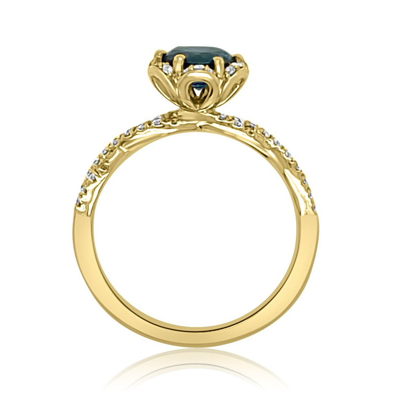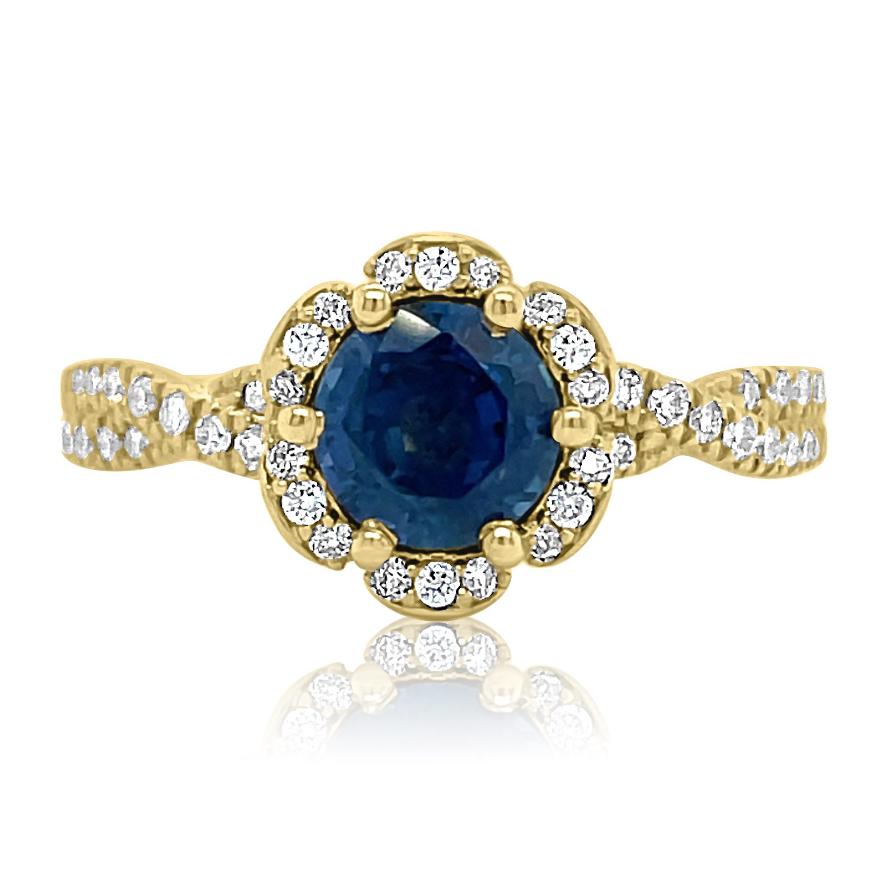 Gorgeous and unique 14 karat yellow gold sapphire and diamond ring. The centerpiece of the ring is a 1.39 carat round, bright blue sapphire. There are 0.23cttw round brilliant cut diamonds, prong set, around the sapphire and down both sides of the twistedband.