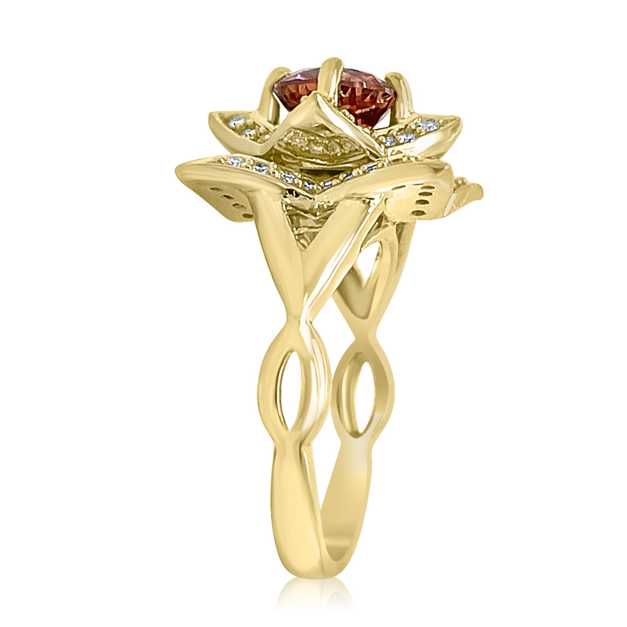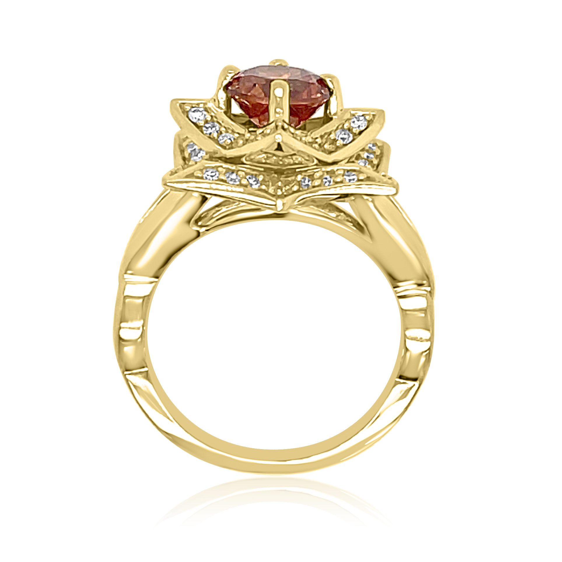 This stunning ring features a vibrant 2.14 carat imperial zircon, surrounded by 0.48cttw round brilliant cut diamonds on a star shaped setting and criss-crossed band.
