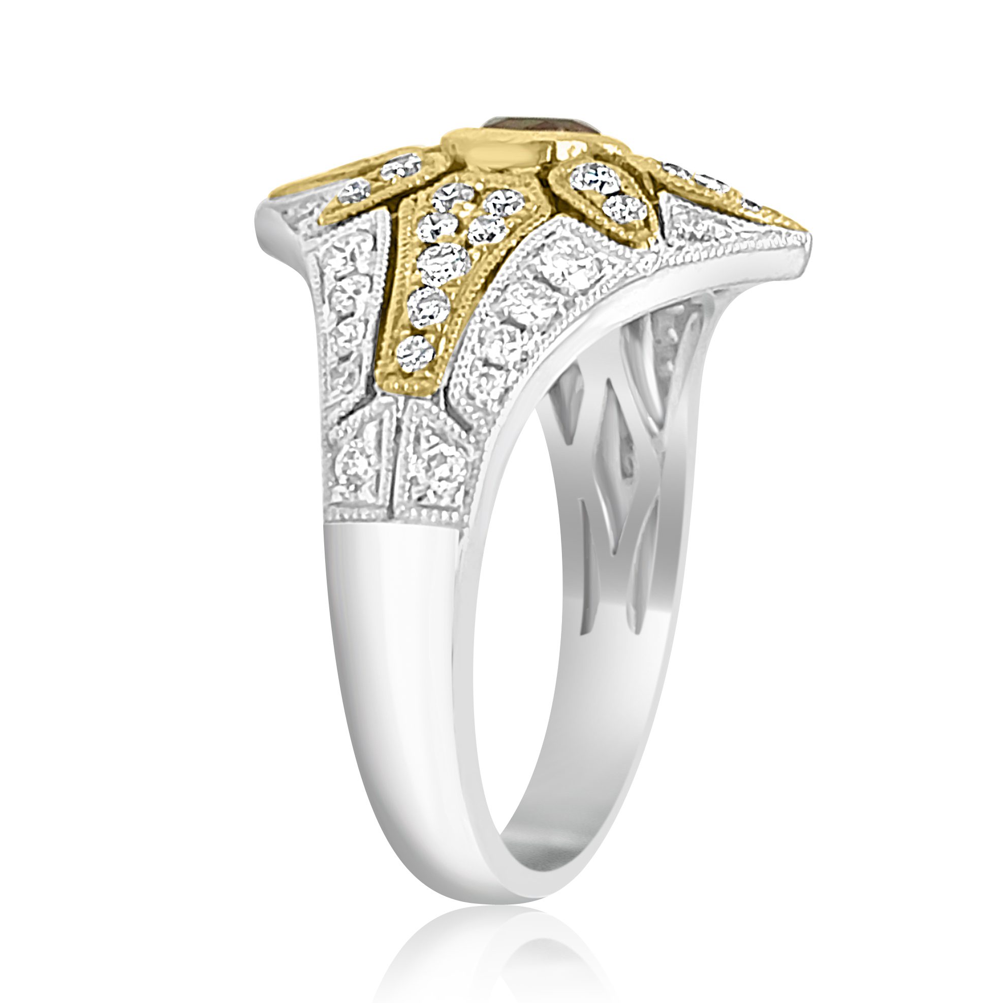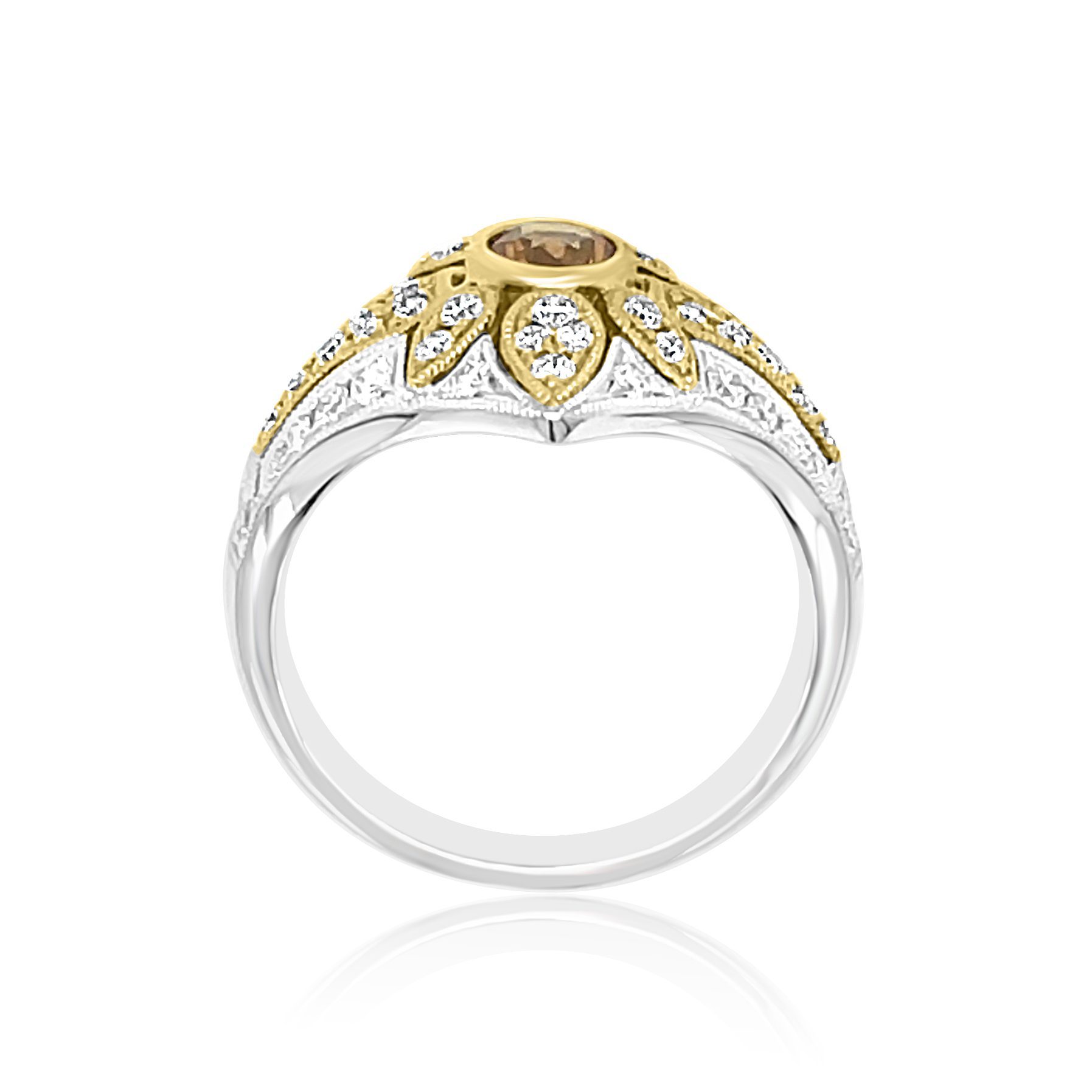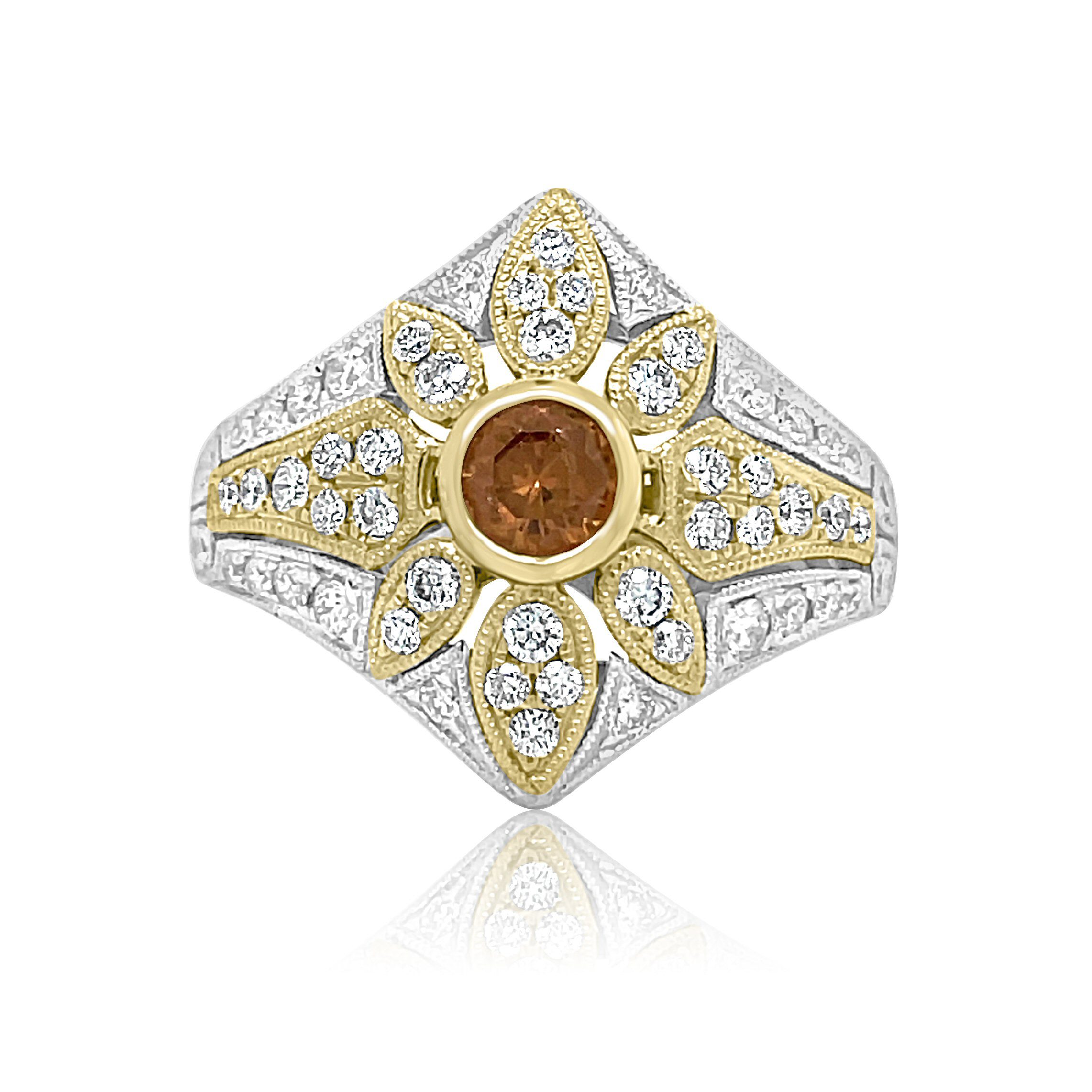 One of a kind 14 karat white and yellow gold vintage style sapphire and diamond ring. The centerpiece of this gorgeous ring is a bezel set natural 0.36 carat padparadscha orange sapphire, surrounded by a beautiful array of .57cttw VS-FG round brilliant cut diamonds.