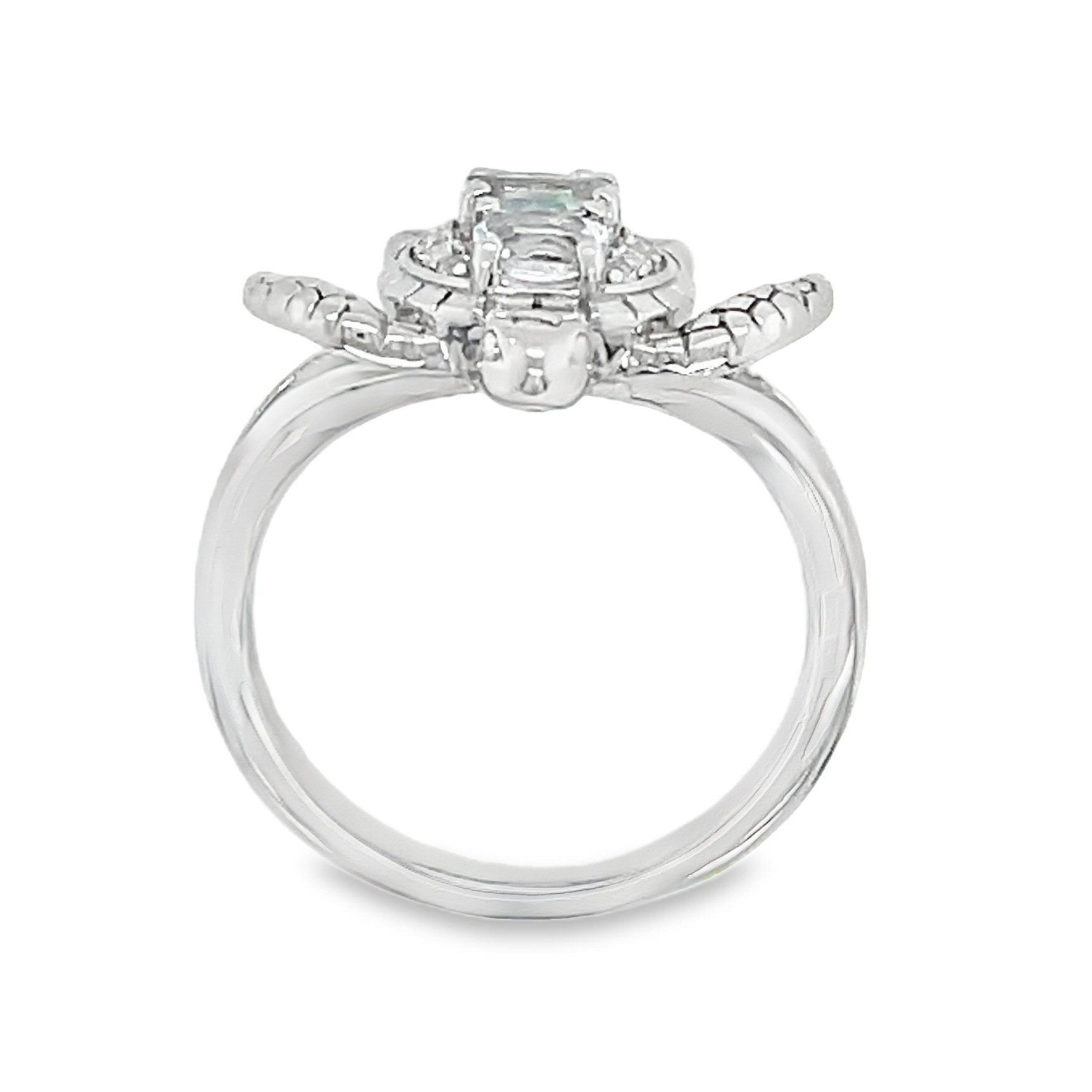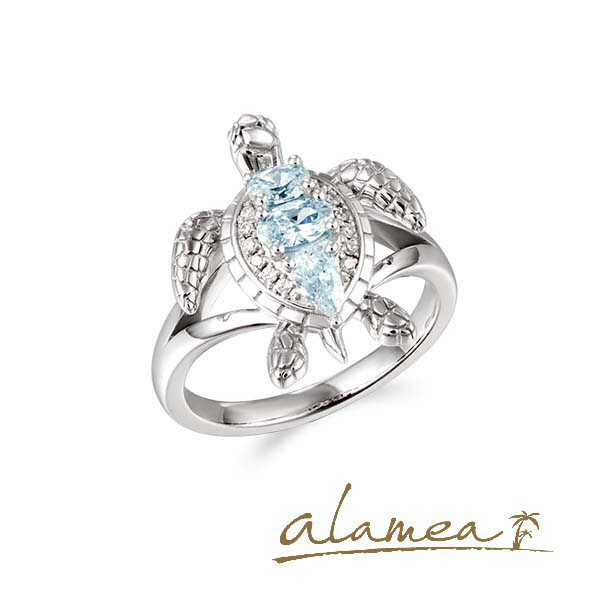 Adorable Sterling silver turtle ring designed by Alamea of Hawaii. There are 2 oval and 1 pear shaped aquamarine on top of the turtle’s back.The ring is rhodium plated to be hypoallergenic and tarnish- free. Size 7.