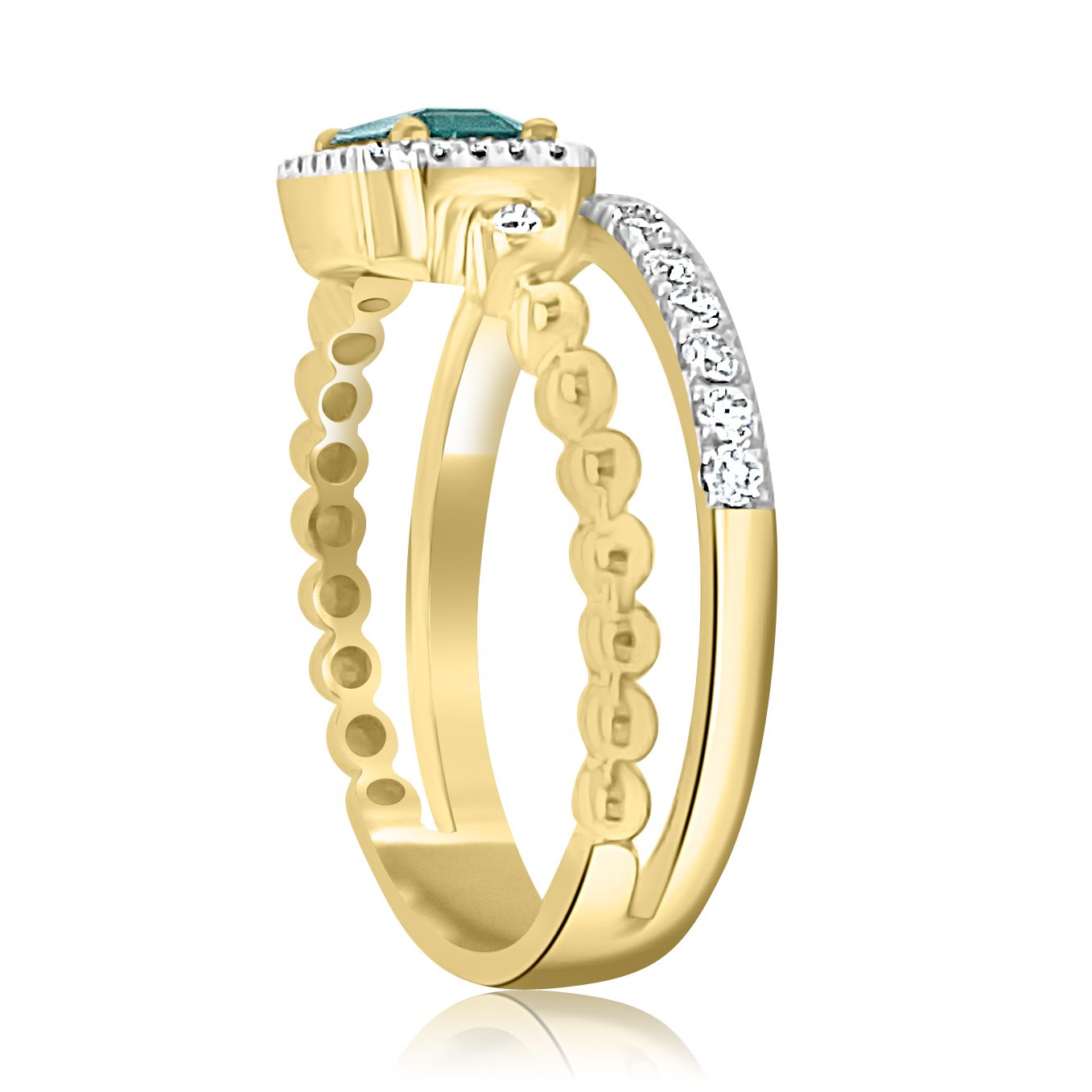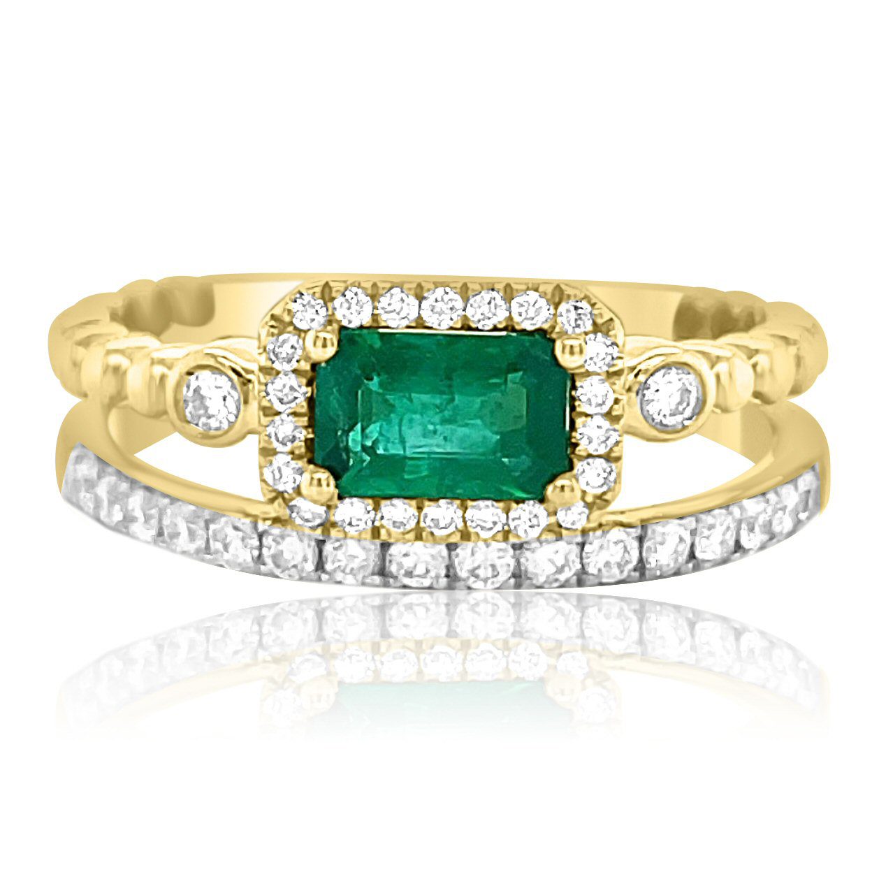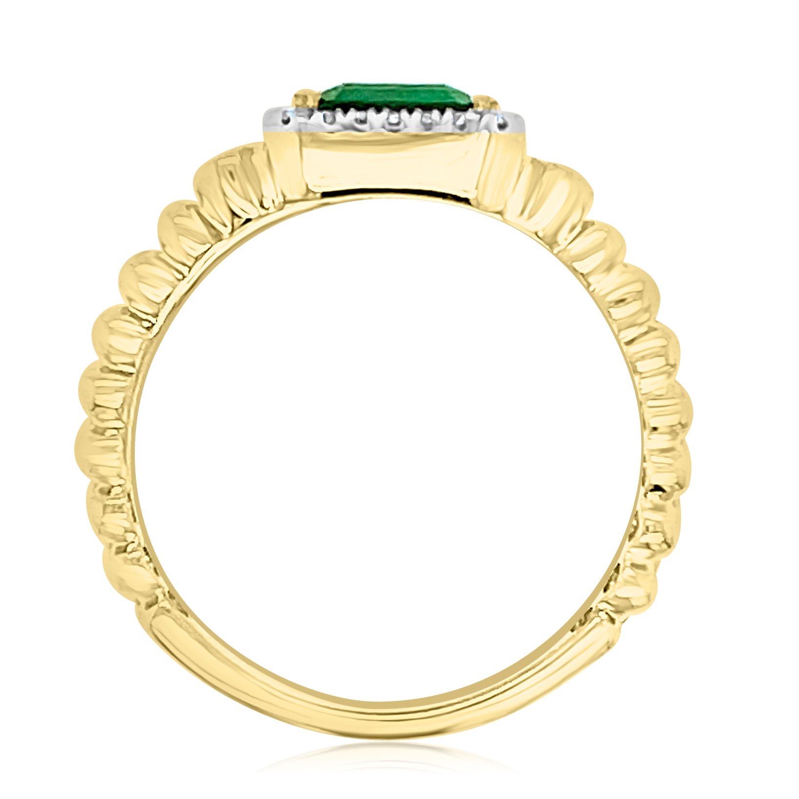 14 karat yellow gold emerald and diamond ring. The focal point of the ring is a .50ct emerald set in a ribbed band. The emerald cut stone is a gorgeous bright, dark green. It is surrounded by diamonds in a halo style. There is a bezel set diamond on either side of the halo. There is a second band of just diamonds. The .31cttw round brilliant cut diamonds are SI clarity and G-H in color.
