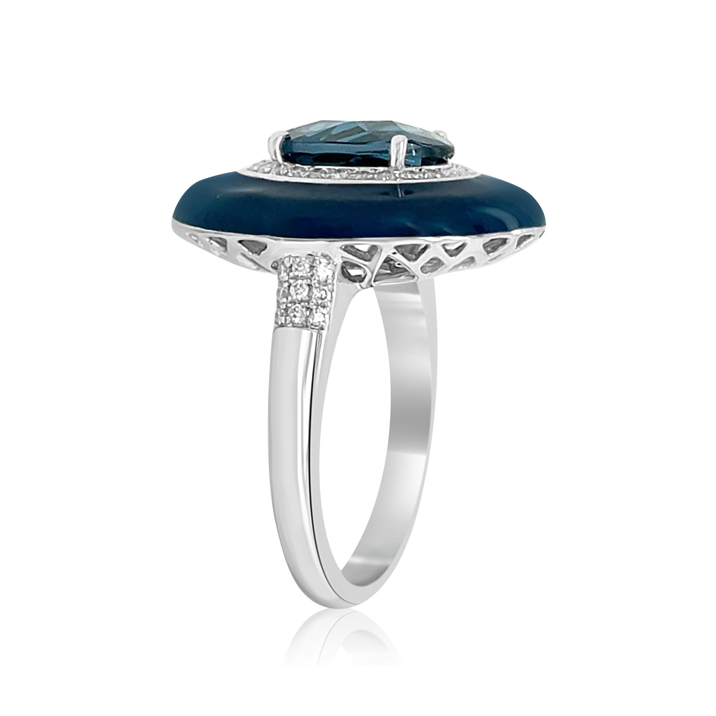 Unique and gorgeous 14 karat white gold London blue topaz ring by Bellarri. The centerpiece of this ring is a 3.02 carat oval London blue topaz, surrounded by a halo of 0.25cttw round brilliant cut diamonds, with a blue enamel rim.