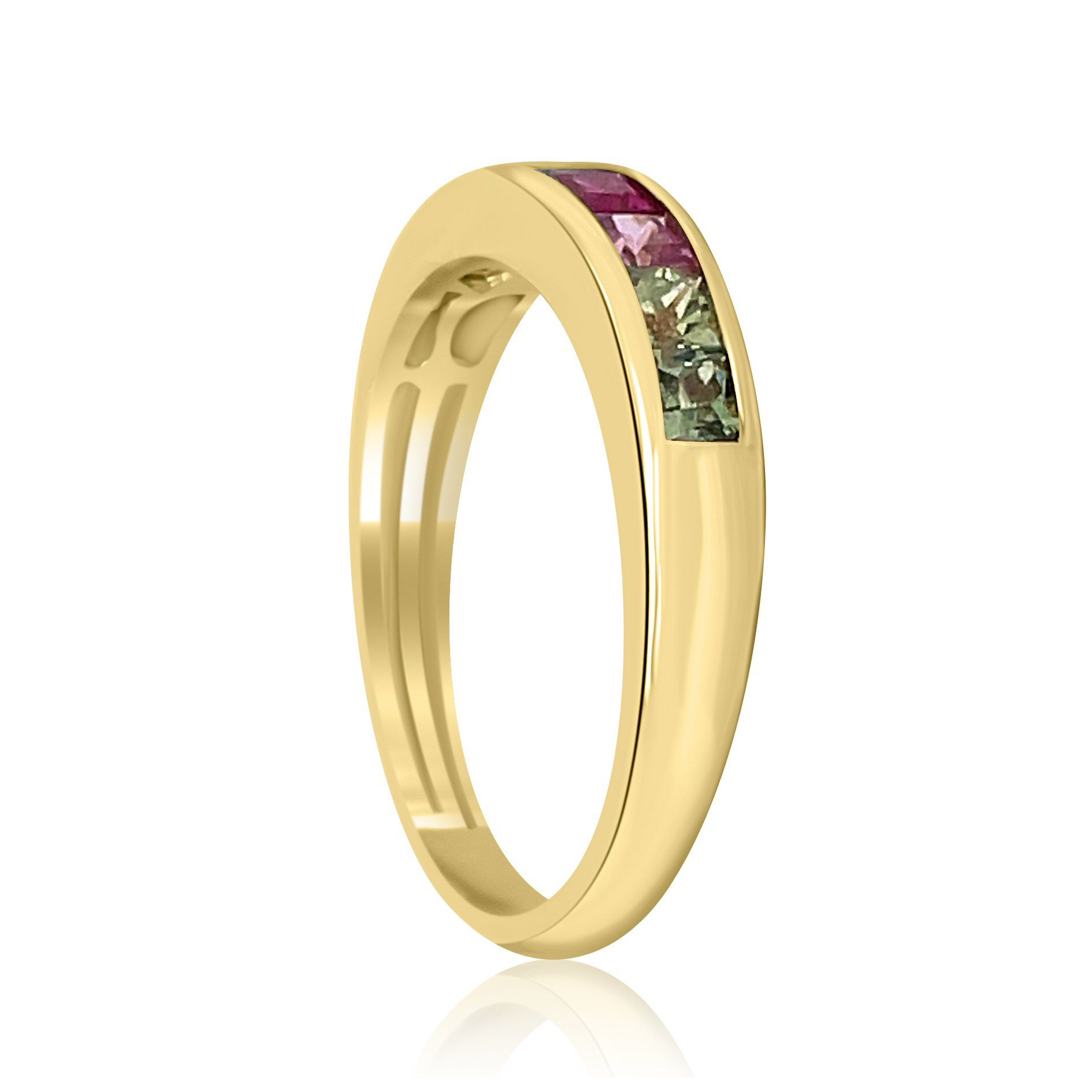 Gorgeous 14 karat yellow gold multi colored sapphire ring from the “Eternal Love Collection”, designed and made by Bellarri. The ring contains 1.25cttw natural fancy pastel color sapphires. There are 2 shades of yellow, 2 shades of pink, 2 shades of green, 1 blue and 1 orange sapphire in this channel set band.