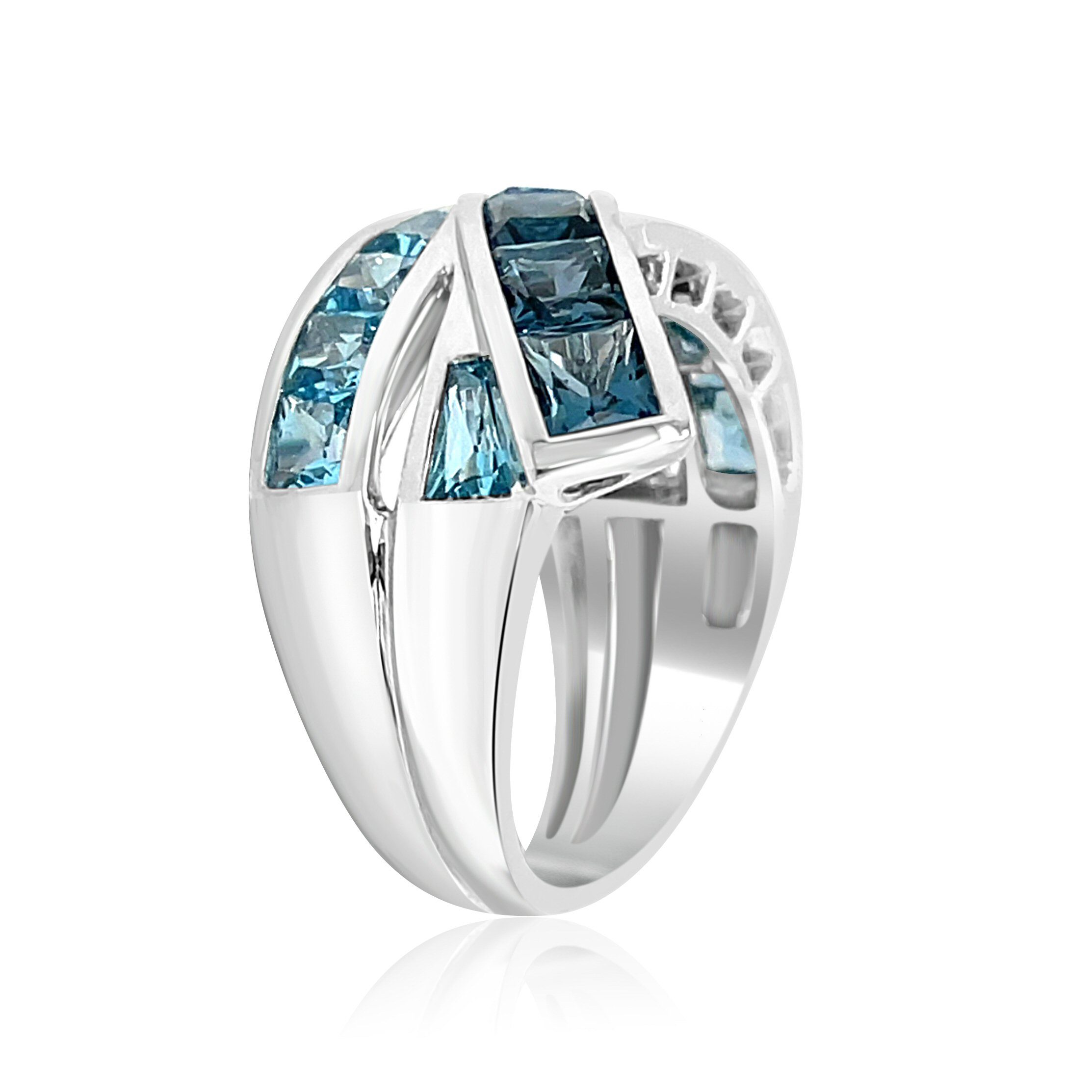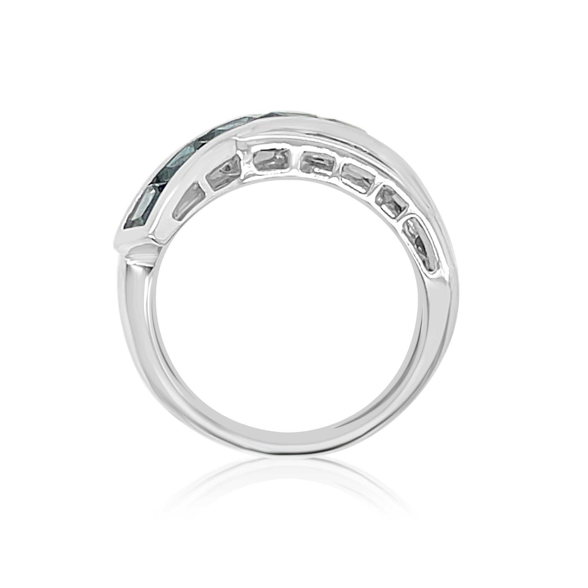 14 karat white gold ring designed by Bellarri from the “Eternal Love” collection. The ring features 5.3 cttw.Swiss and London blue topaz. The square cut stones graduate from lightest blue to the darkest. They are channel set in 2 rows with a 3rd row crossing over them with 1 of Bellarri’s signature “B”s underneath.