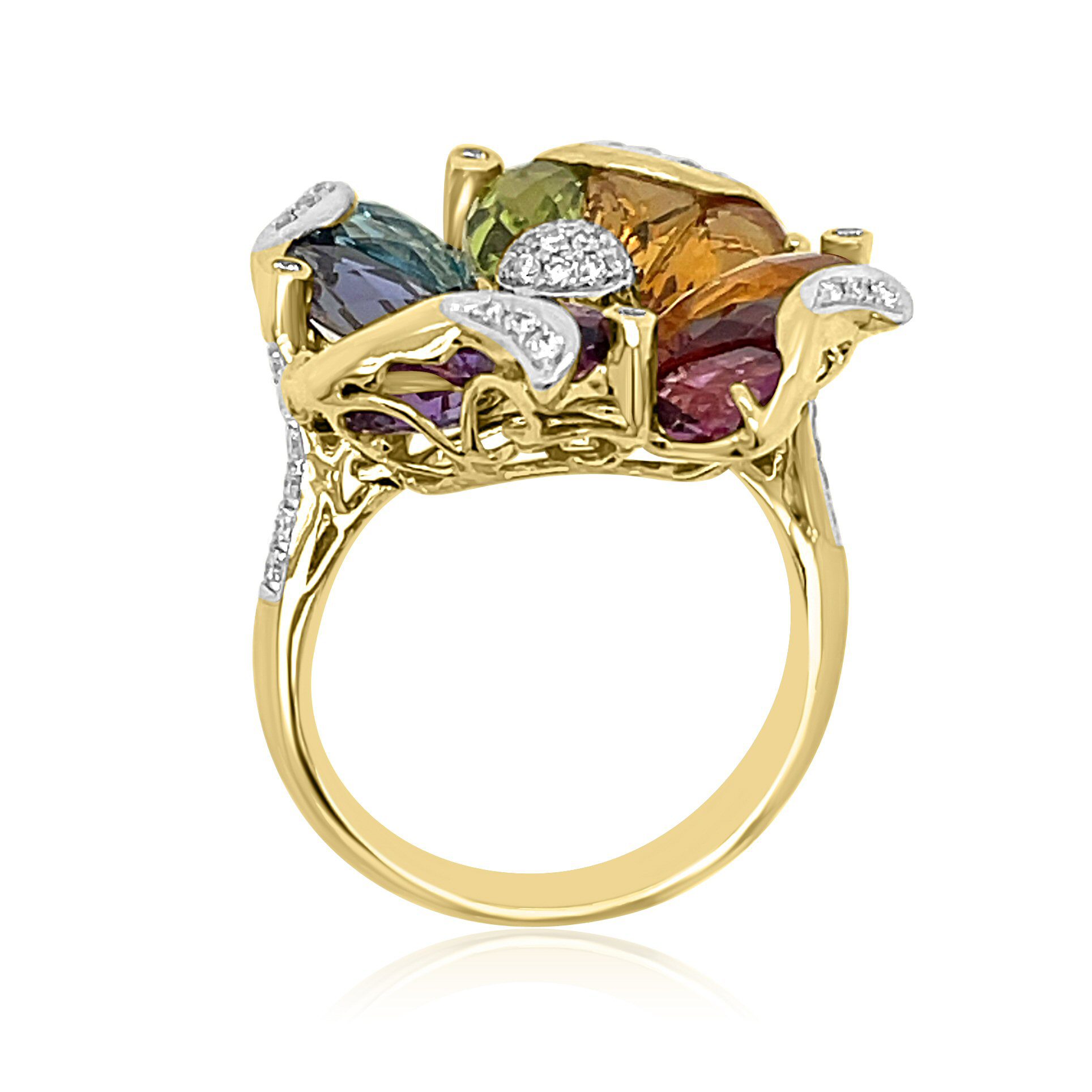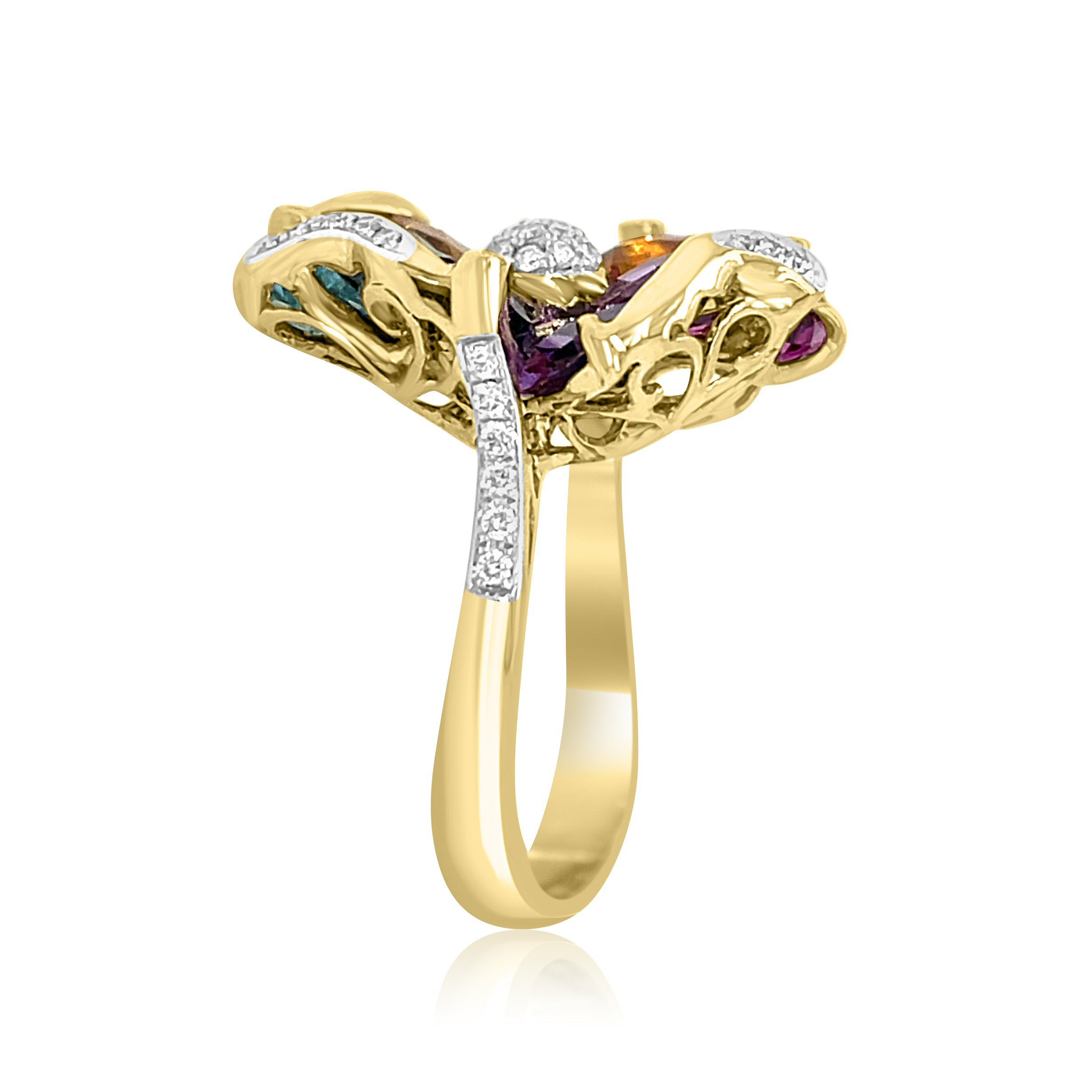 Elevate your style with this luxurious 14 karat yellow gold “flowery” ring with 8.86cttw multi colored gems from Bellarri’s Mademoiselle Collection.