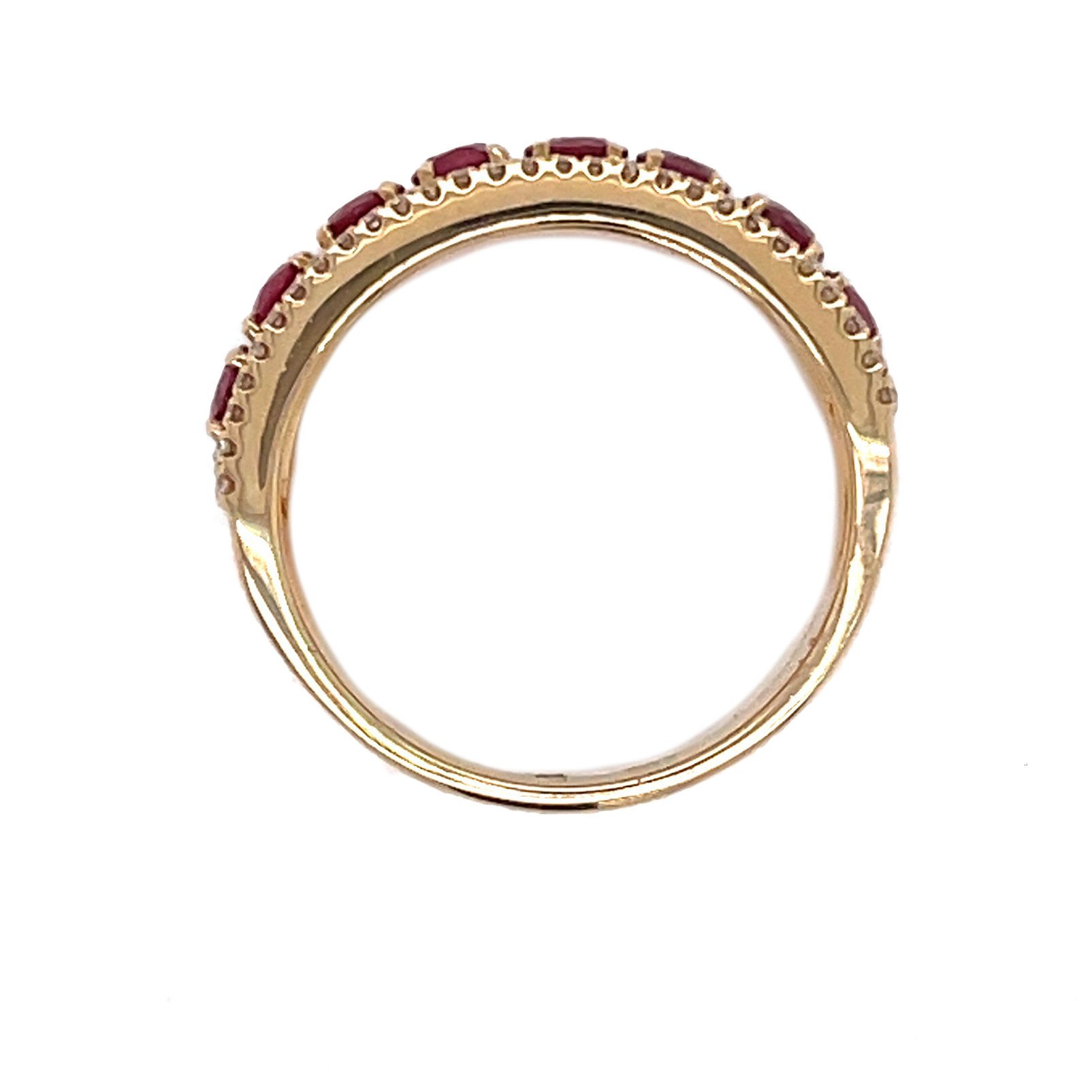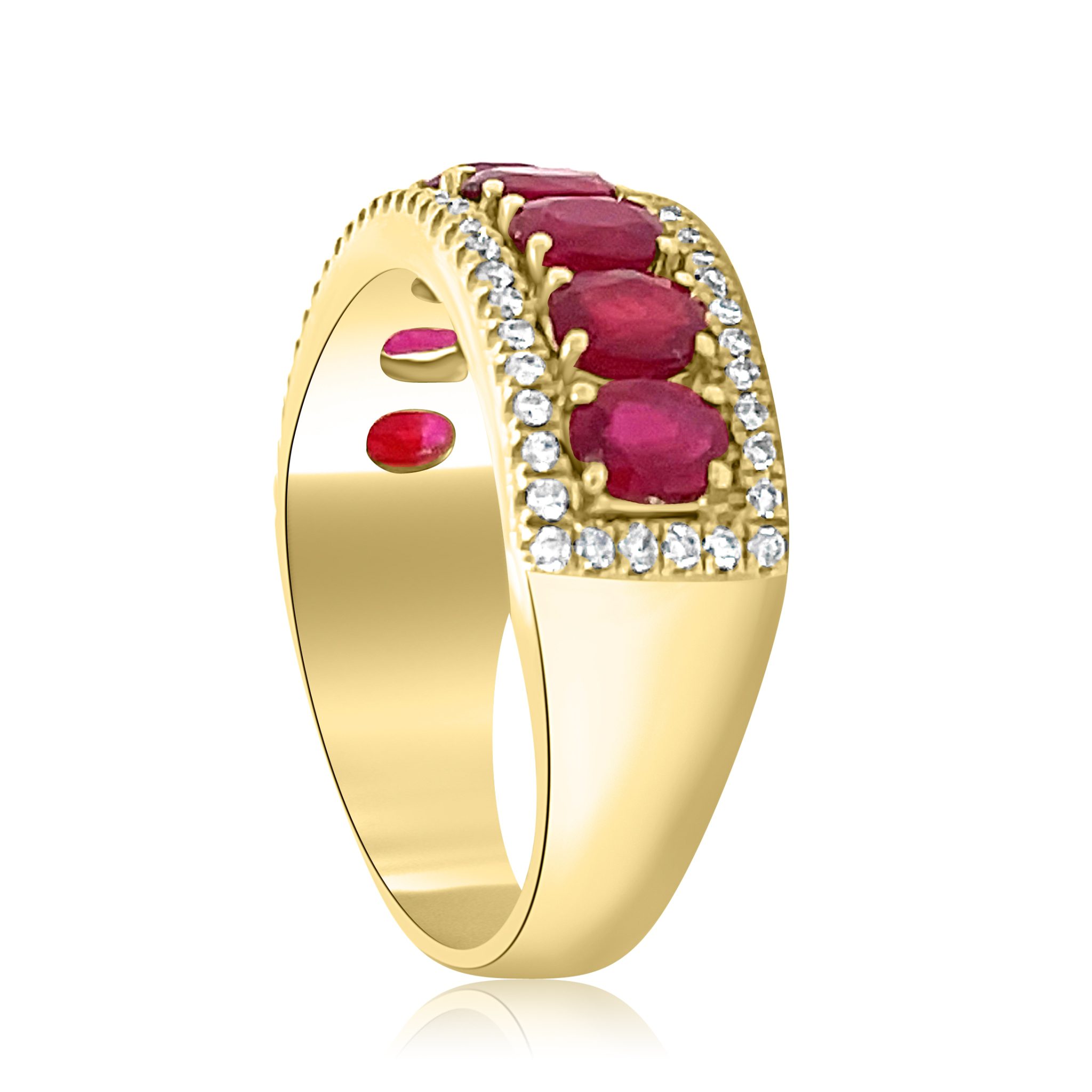 Elevate your style with this breathtaking 14 karat yellow gold ruby and diamond ring. The combination of sparkling white .18 cttw diamonds and vivid red 1.86cttw oval rubies makes it an elegant choice for those who appreciate timeless impeccable quality.