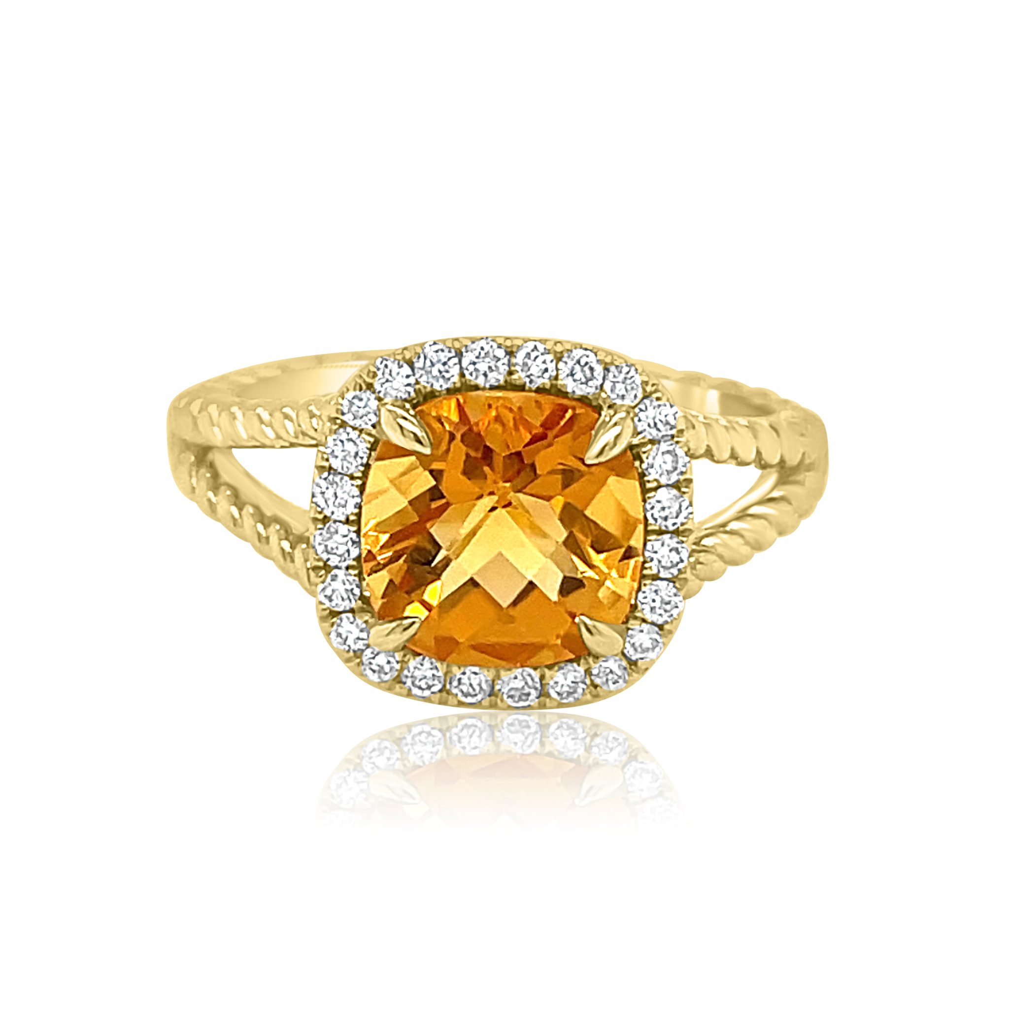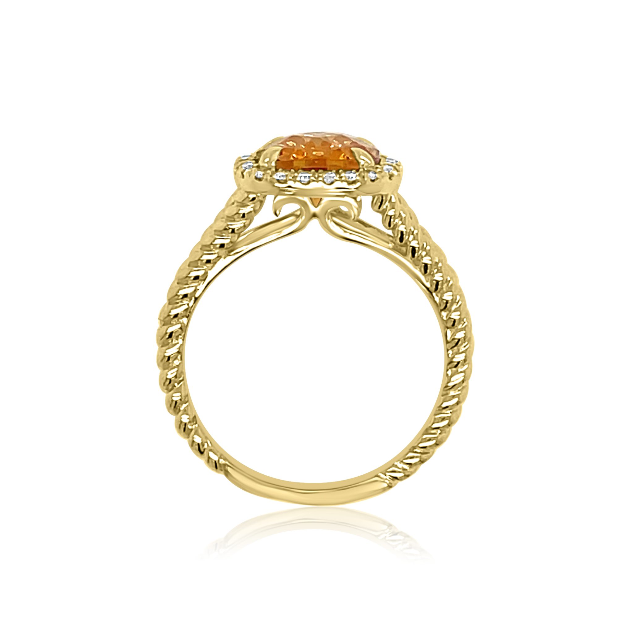 Dazzle and shine with this 14 karat yellow gold citrine and diamond ring. The 1.93 carat cushion cut citrine is prong set with a halo of diamonds, and rests on a fancy, rope style band. The 0.19cttw round brilliant cut diamonds are SI clarity and G-H in color.