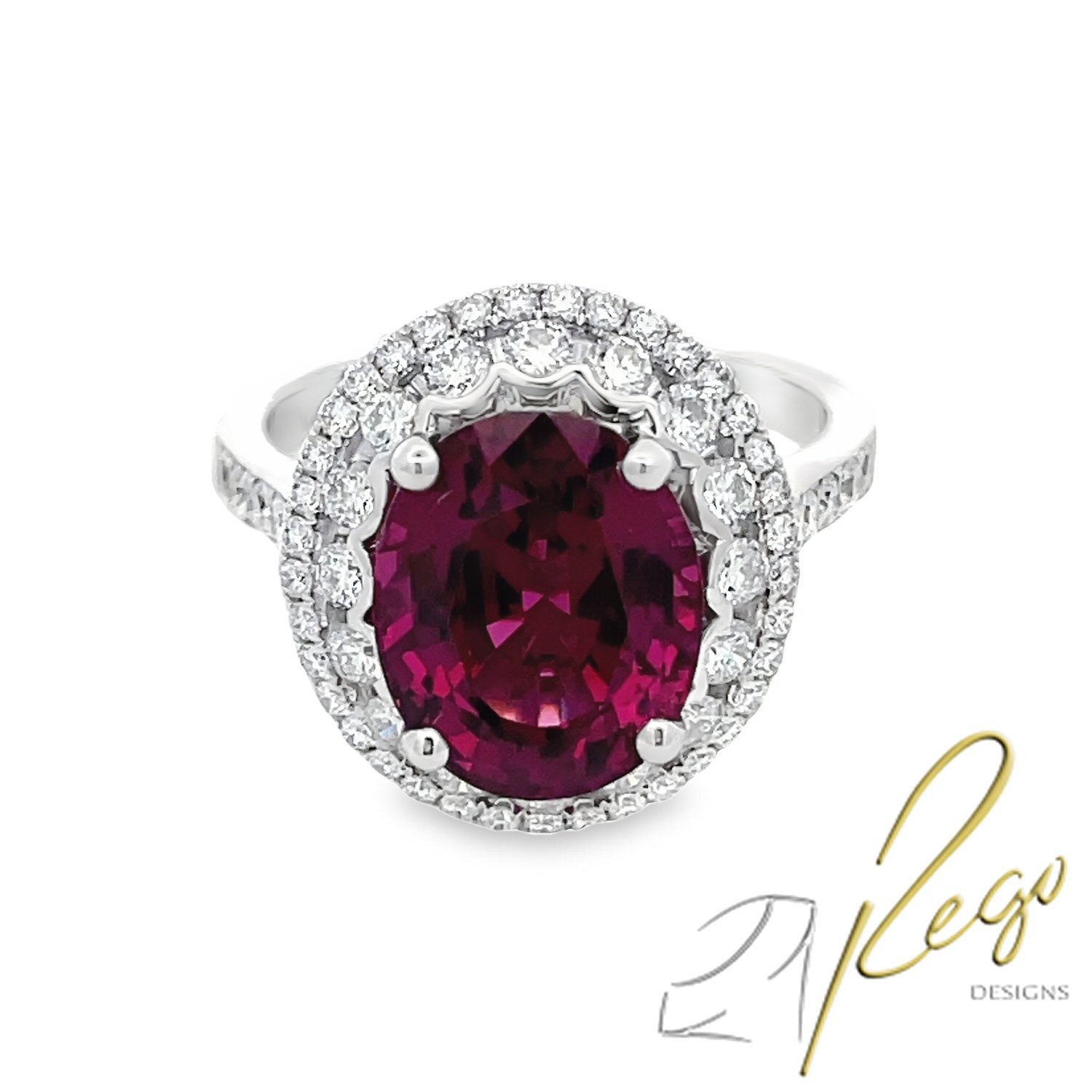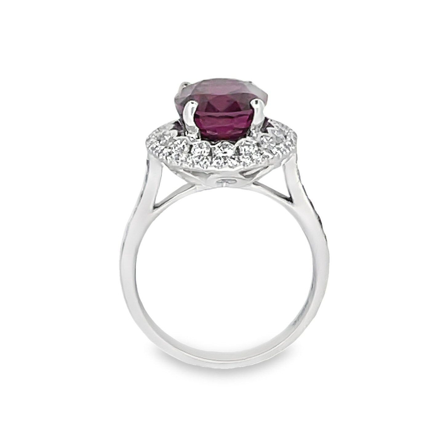This stunning 14 karat white gold ring features a vibrant oval 5.56 carat rhodolite garnet, surrounded by dazzling 0.90cttw diamond.
