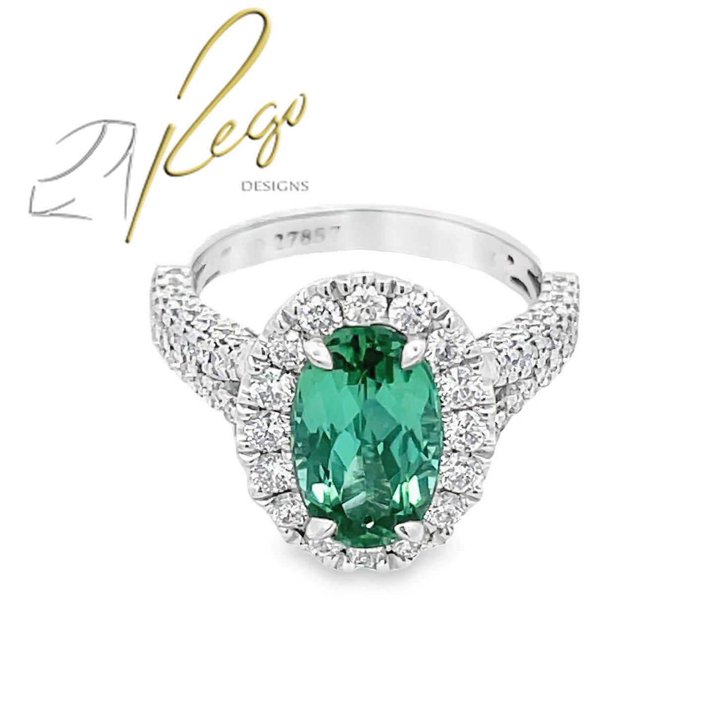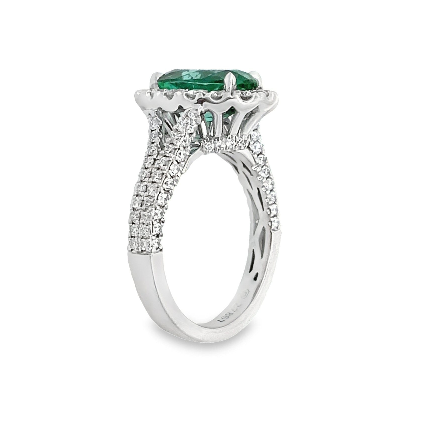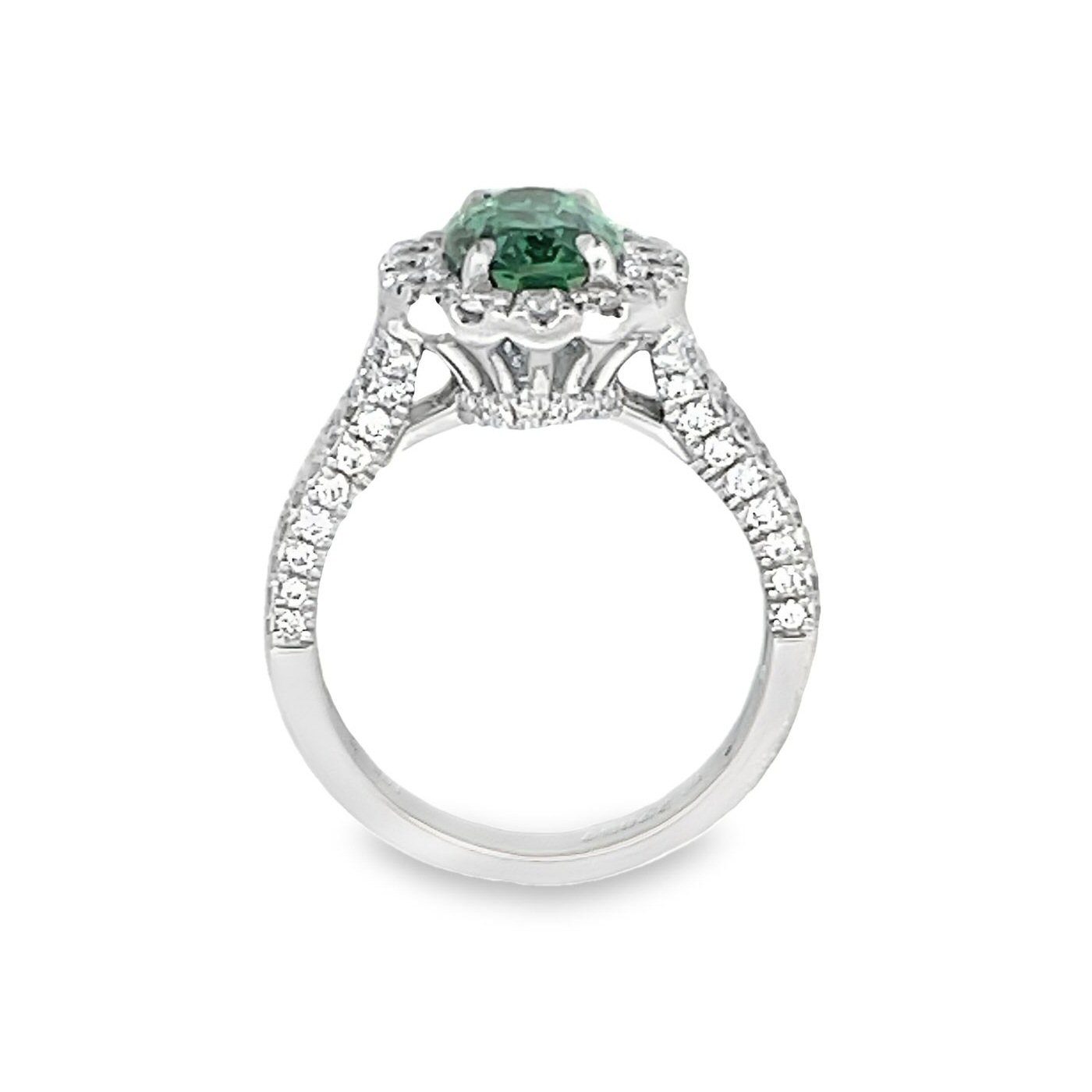Showcasing exquisite craftsmanship, this 18 karat white gold ring boasts an eye-catching 2.75 carat mint green tourmaline surrounded by 1.05cttw round brilliant cut diamonds.