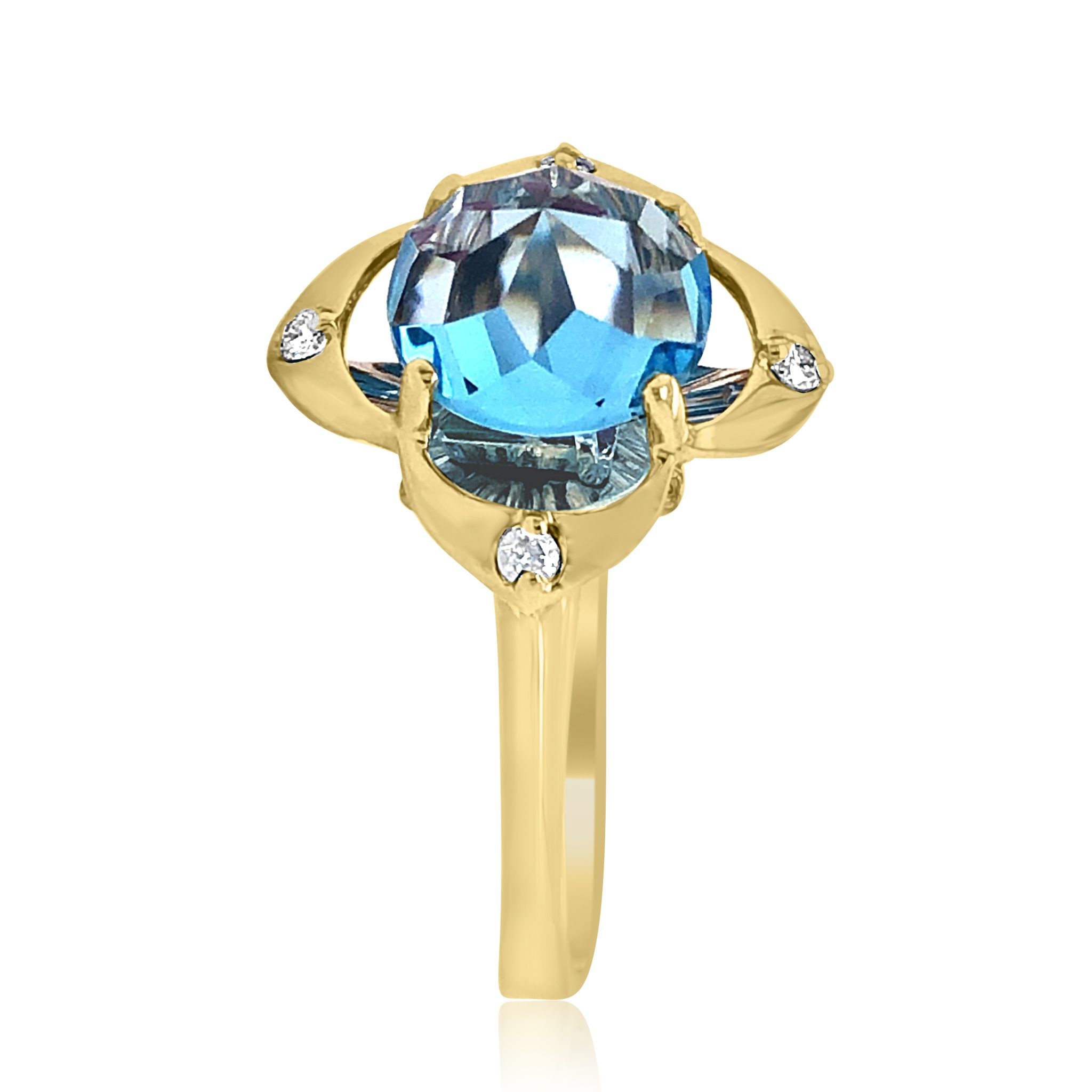 Beautiful DaVinchi cut blue topaz ring in 14 Karat Yellow Gold with 0.06 Cttw. round brilliant cut diamonds. The 8mm blue topaz is cut by designer, Chi, and there are 2 rubies and 2 emeralds set on a white gold plate behind the blue topaz to give a “kaleidoscope’ effect. Unique and beautiful!