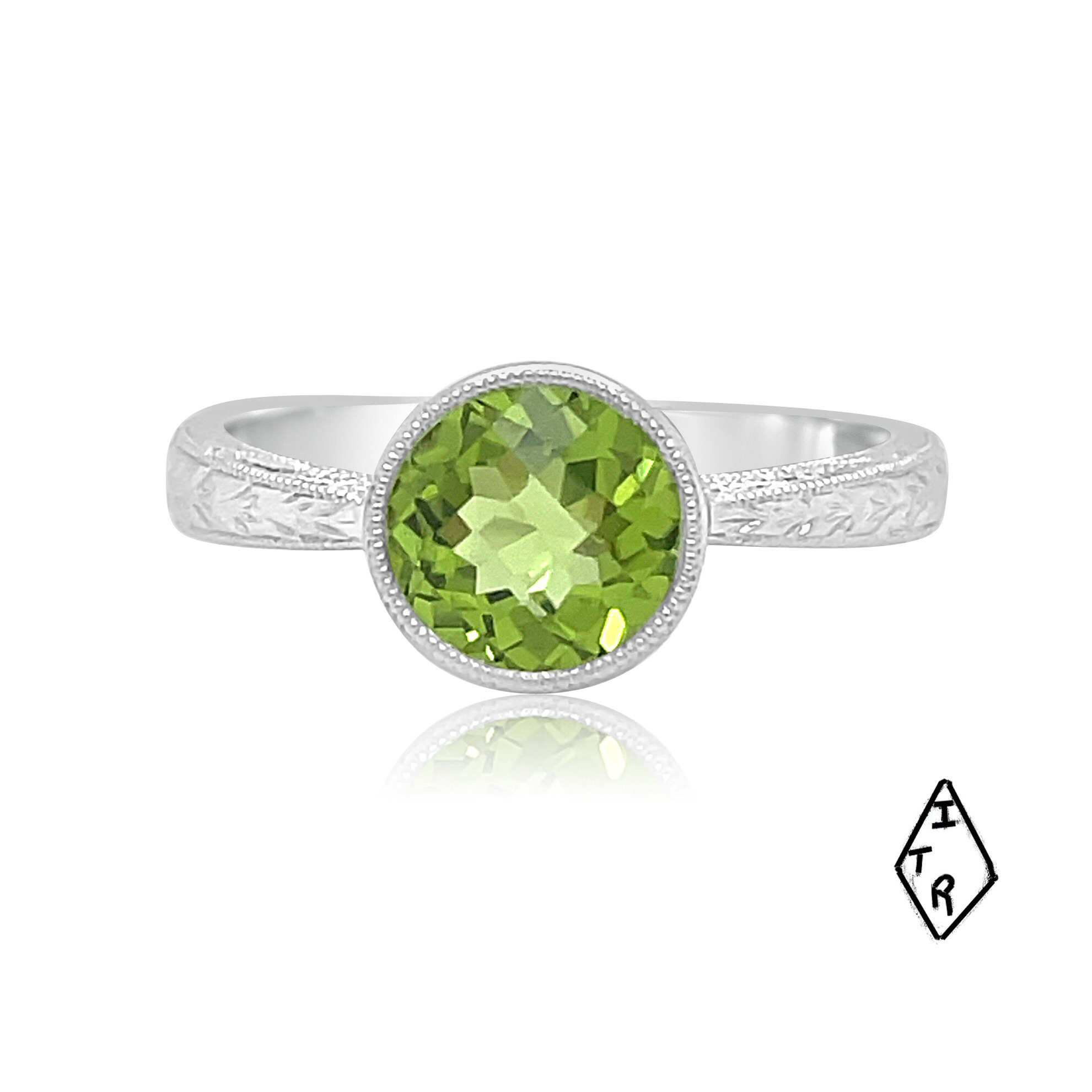 Simply beautiful 14 karat white gold peridot ring. The 1.36 carat peridot is bezel set in a simple, etched designed ring.