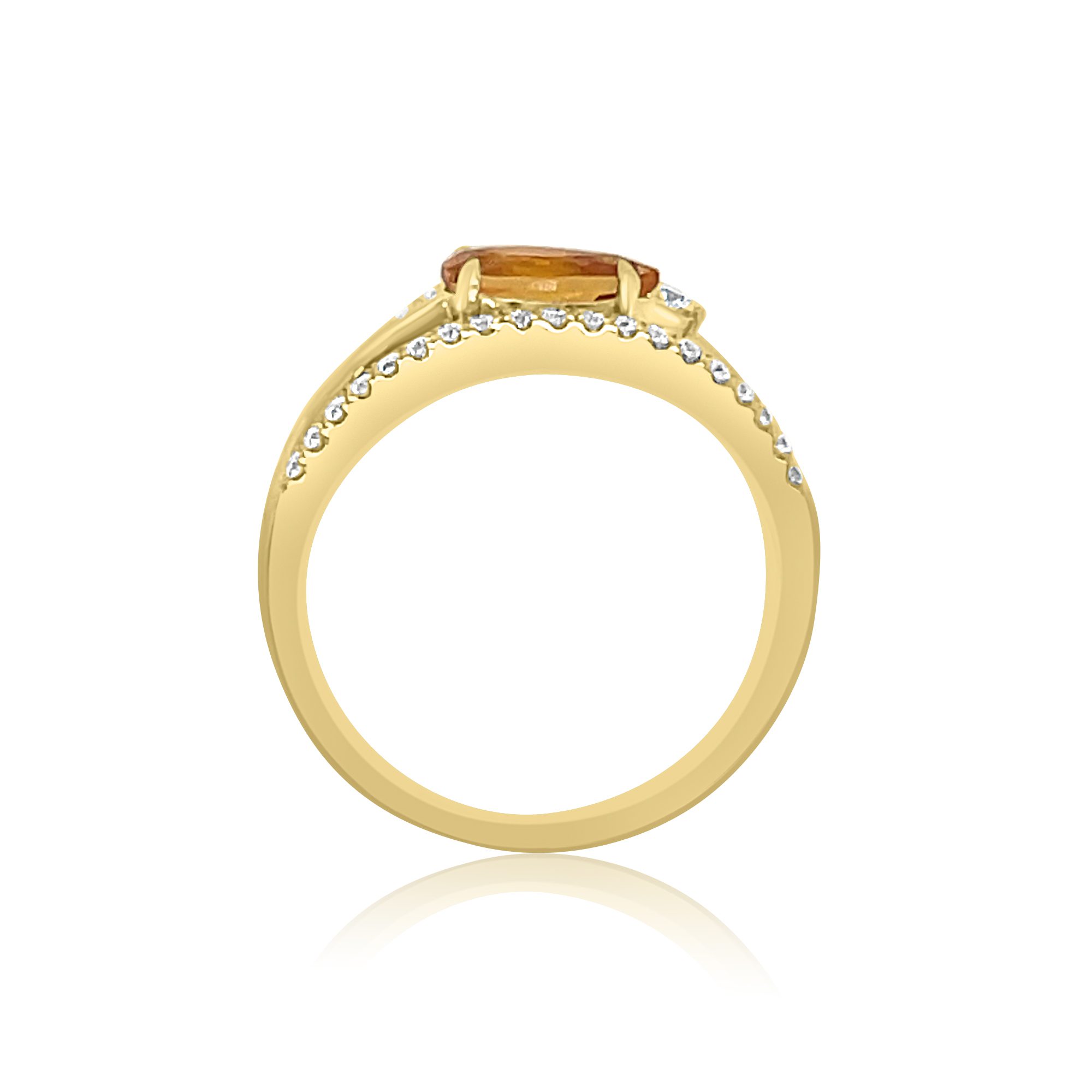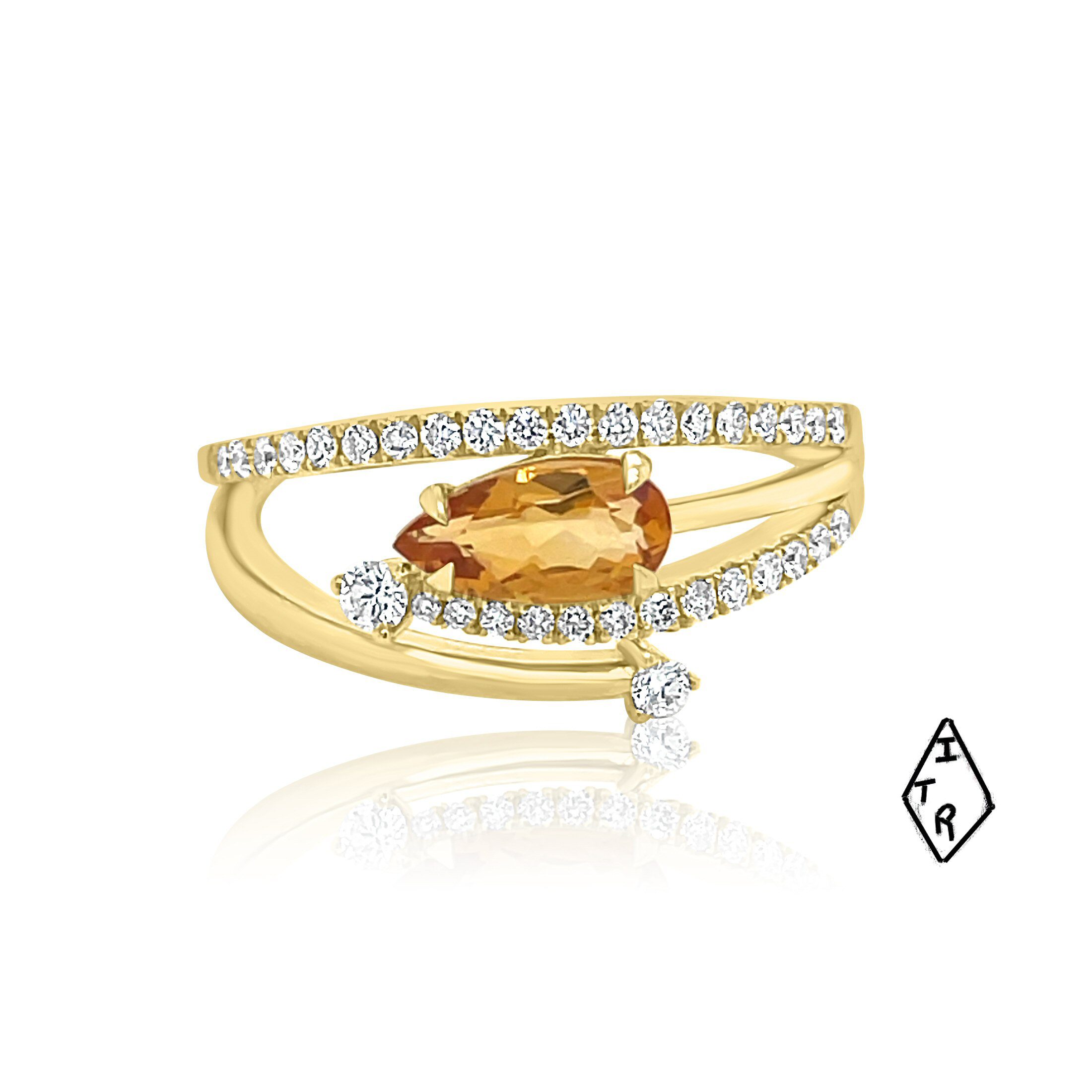 Abstract 14 karat yellow gold citrine and diamond ring. The 0.47 carat pear shaped citrine is prong set and rests on an alternating high polish and diamond bypass style band. The 0.27cttw diamonds are prong set.