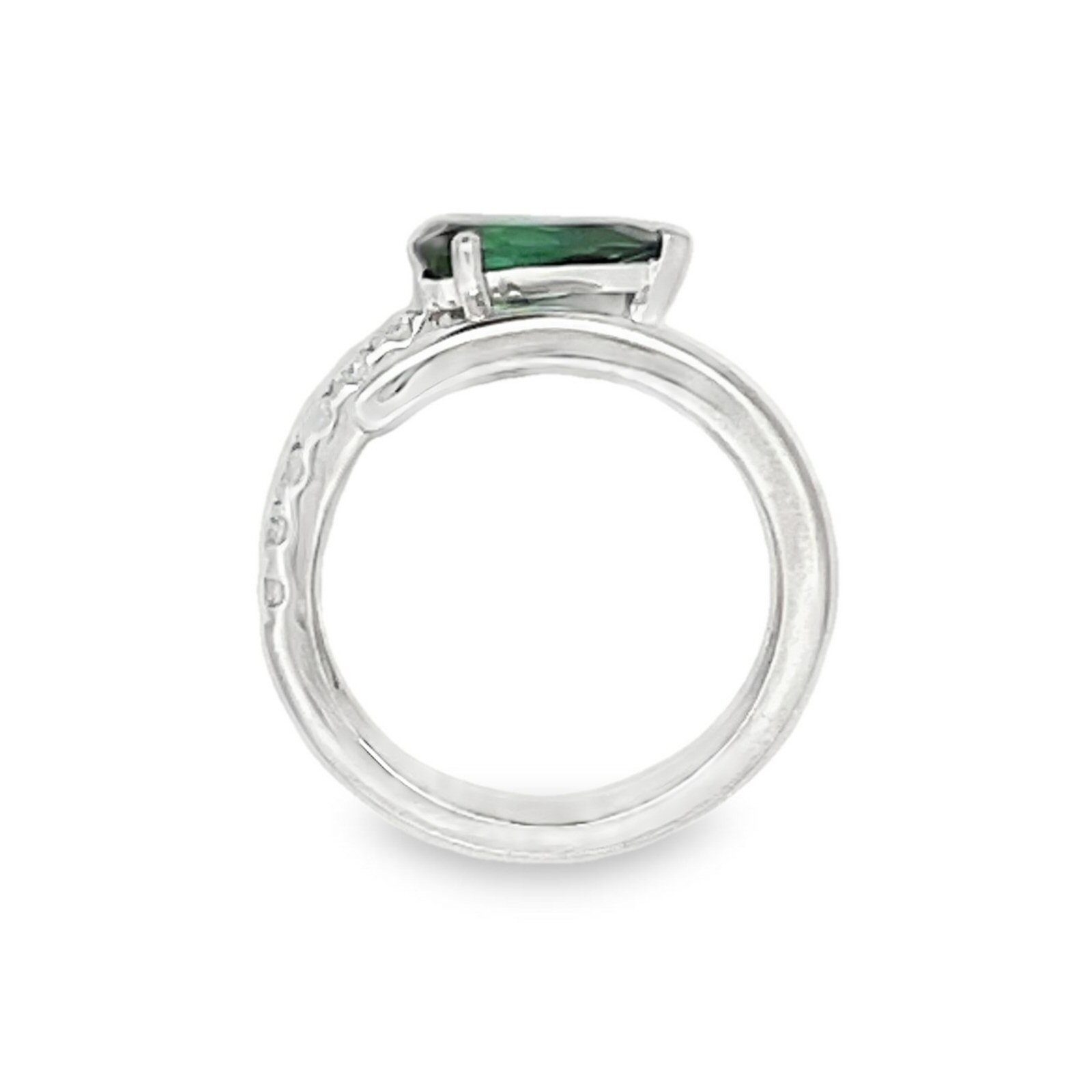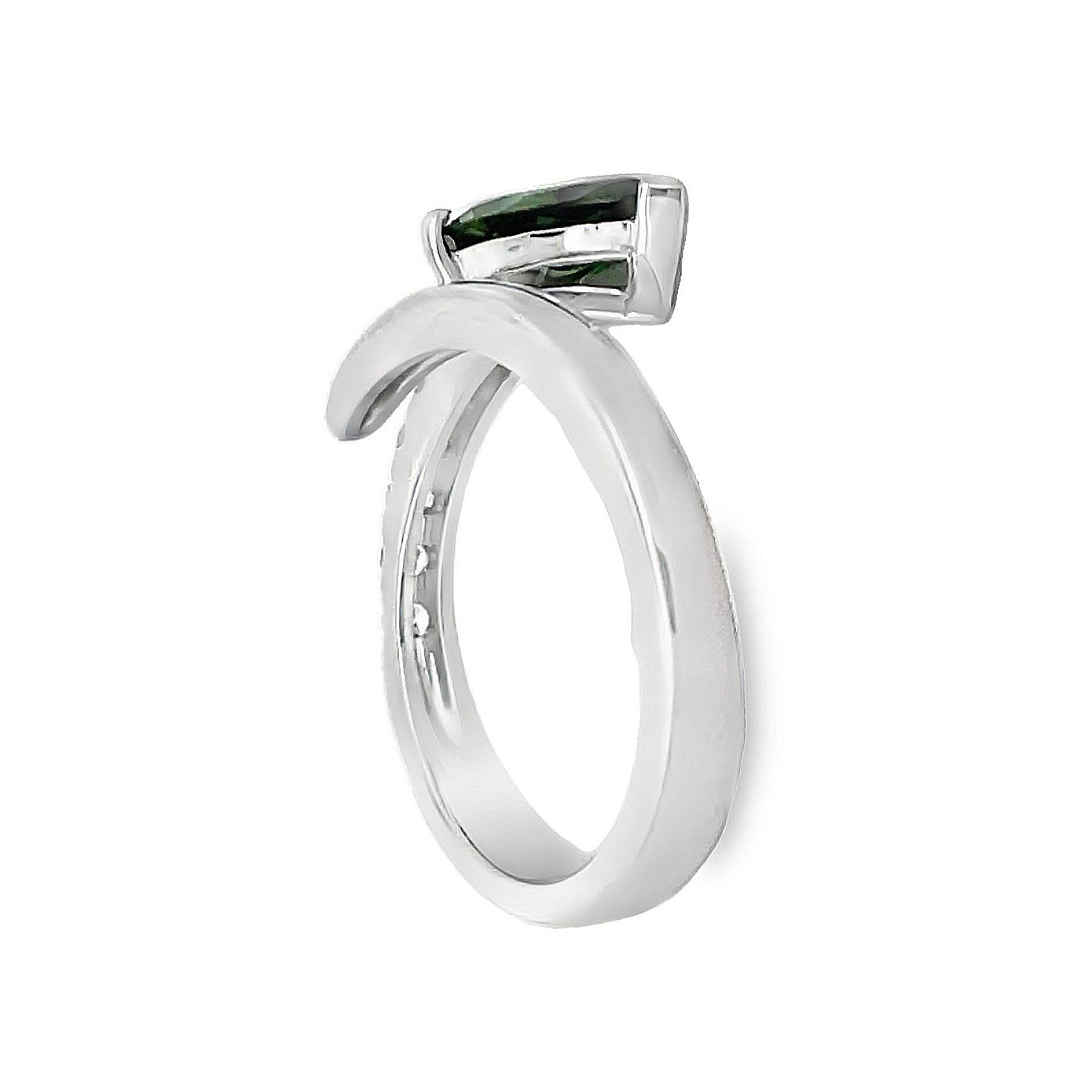 This unique 14 karat white gold negative space bypass ring features a stunning 1.05ct pear shaped green tourmaline, accented by 0.16cttw round brilliant cut diamonds.