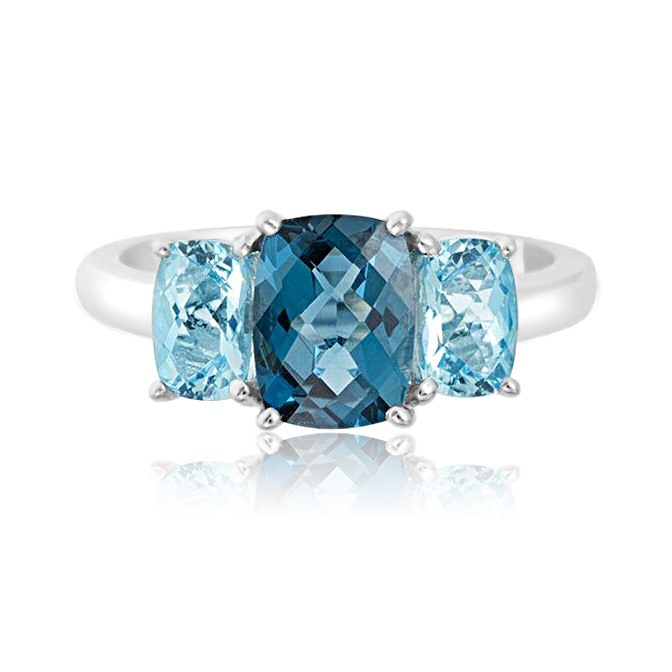 Elegant and lovely 14 karat white gold three stone blue topaz ring. The center stone is approximately a 2.0 carat cushion cut London blue topaz. The side stones are 1.2 cttw cushion cut Swiss blue topaz.
