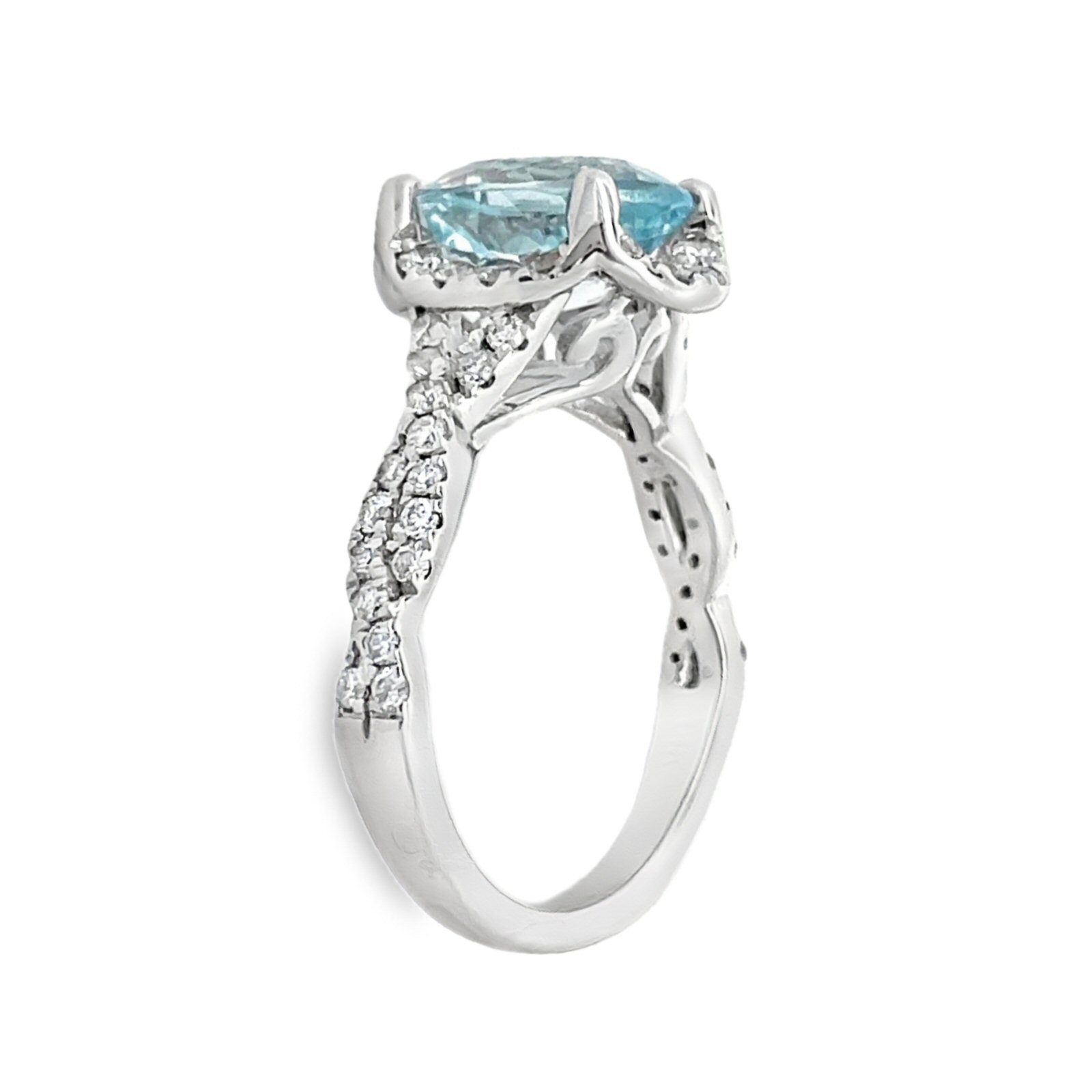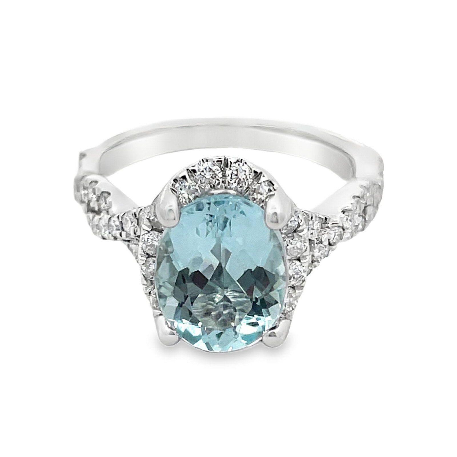 Elevate your style with this gorgeous 14 karat white gold aquamarine and diamond ring. The centerpiece of this ring is a 2.41 carat oval aquamarine, accented by .74cttw round brilliant cut diamonds.