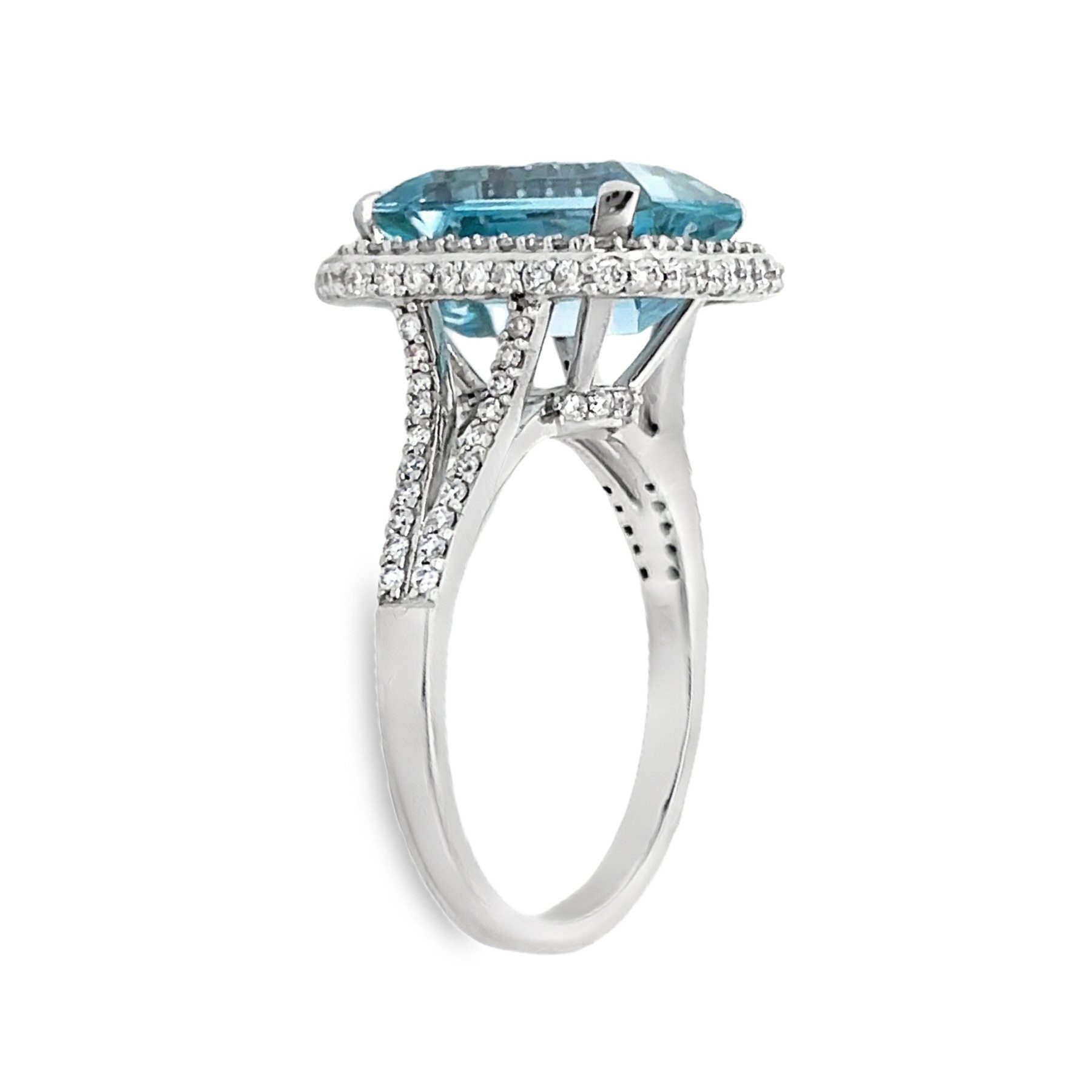 Elegant and lovely 14 karat white gold aquamarine and diamond ring. The centerpiece is a 4.63 carat emerald cut aquamarine of beautiful blue-green color. There are .68cttw round brilliant cut diamonds prong set in a double halo, split shank and in the under gallery of the ring.